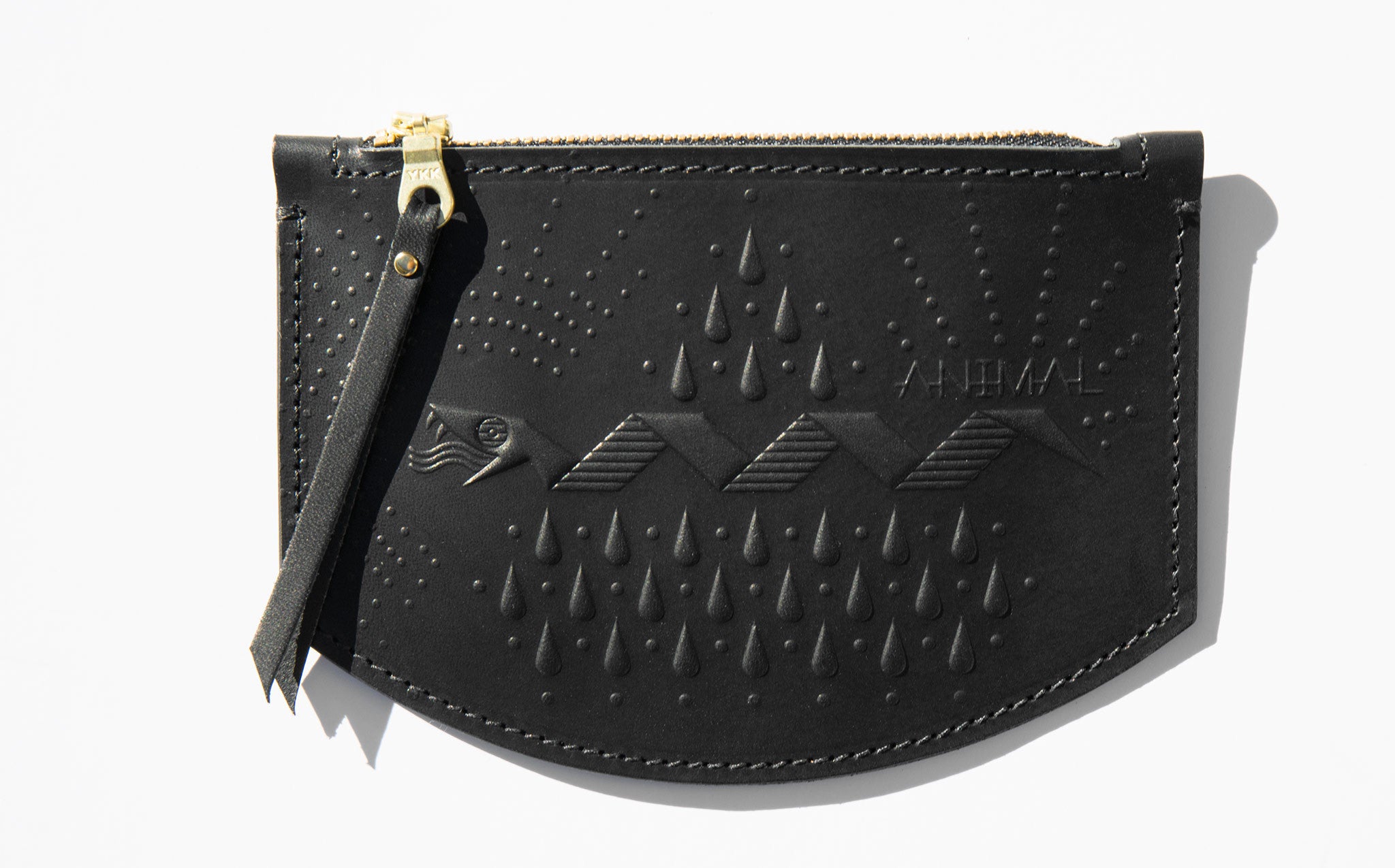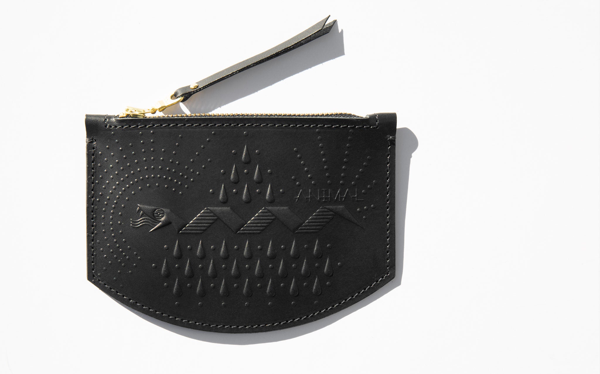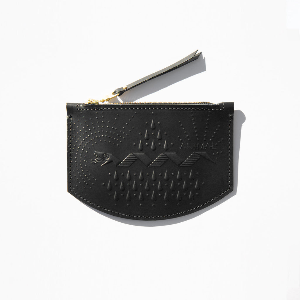 A delicately and intricately embossed leather coin pouch with a zipper closure.