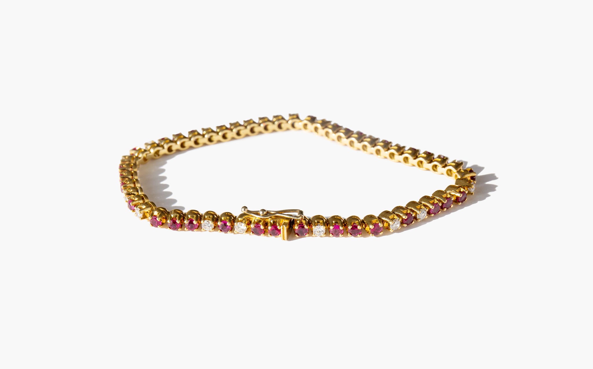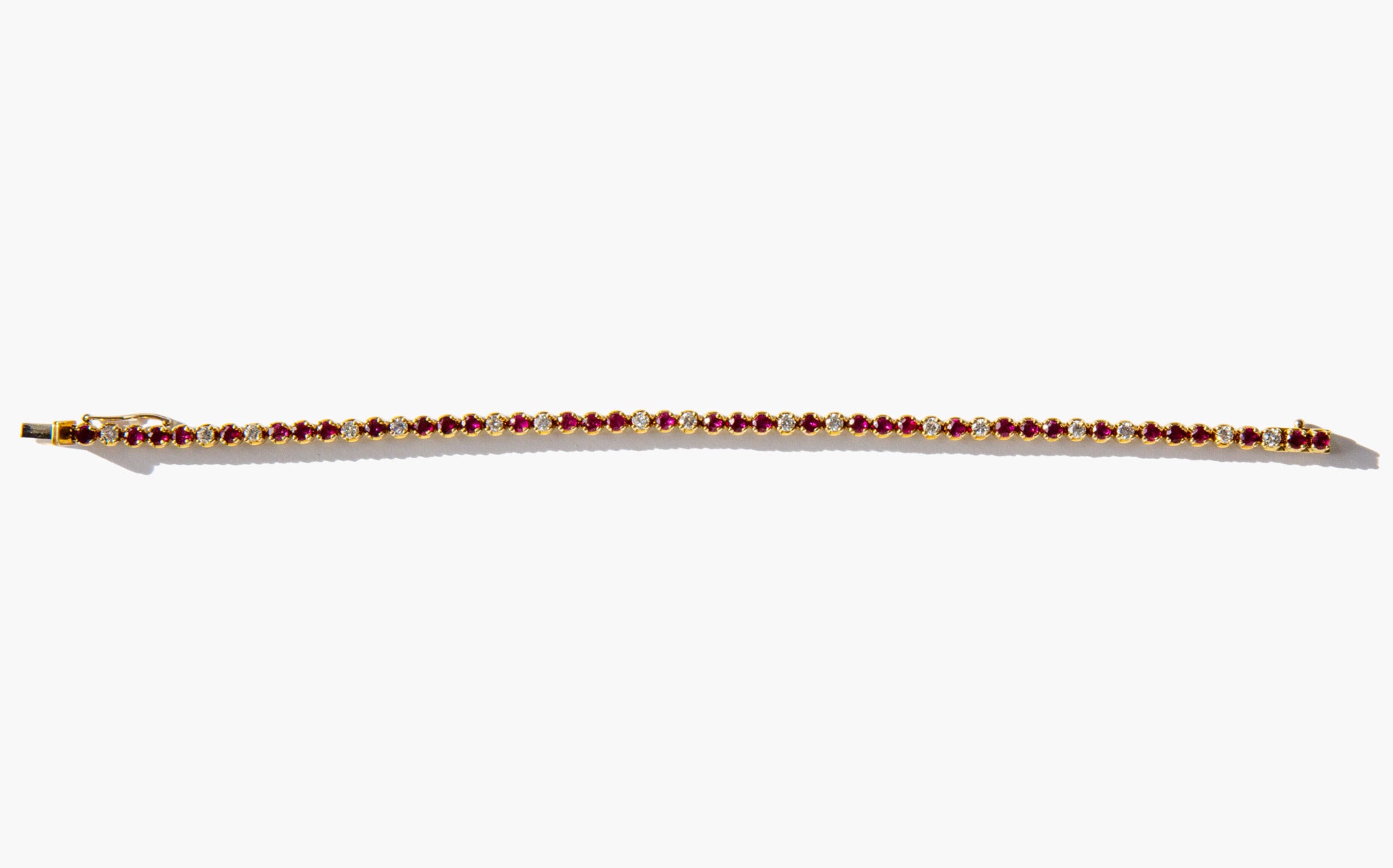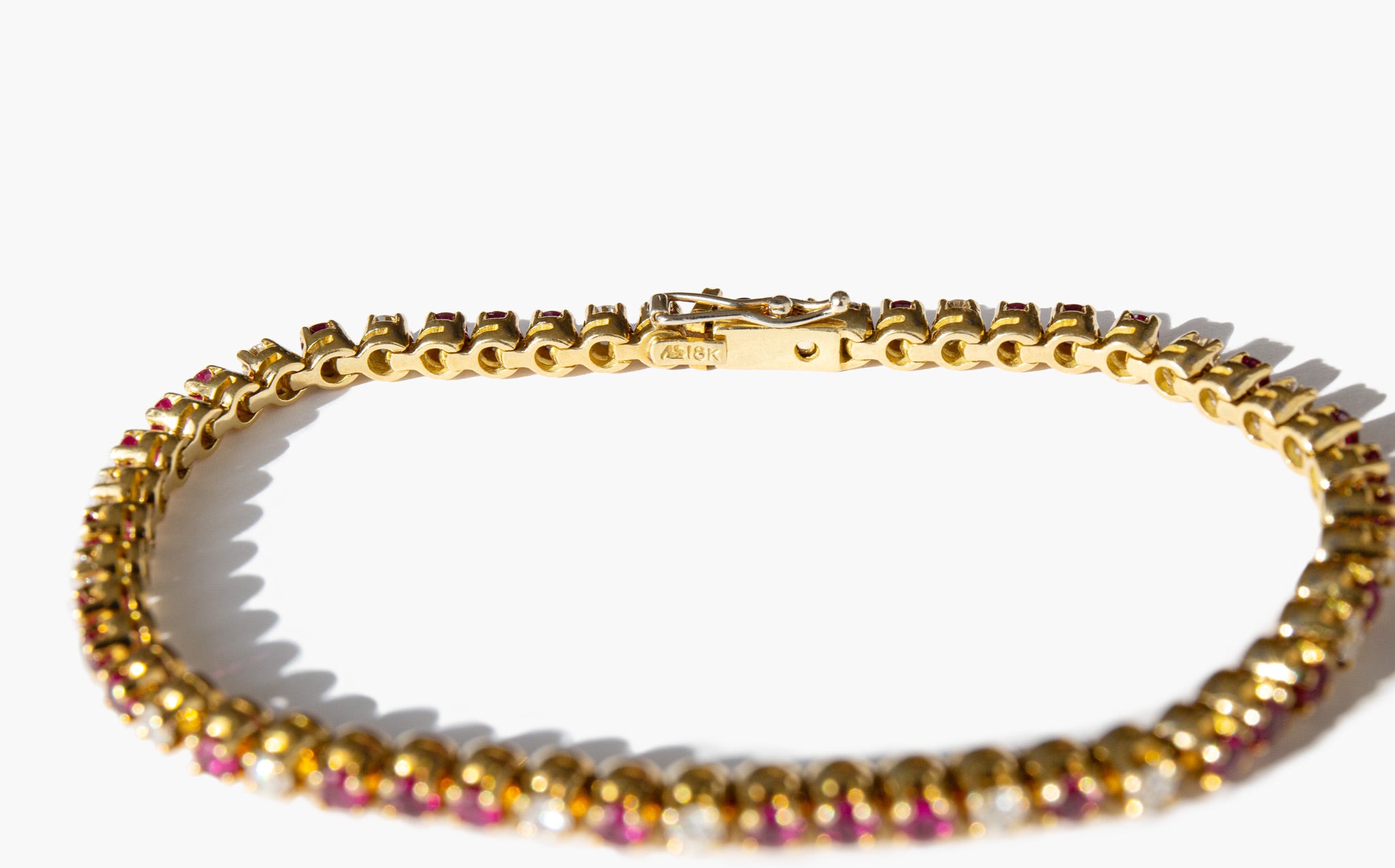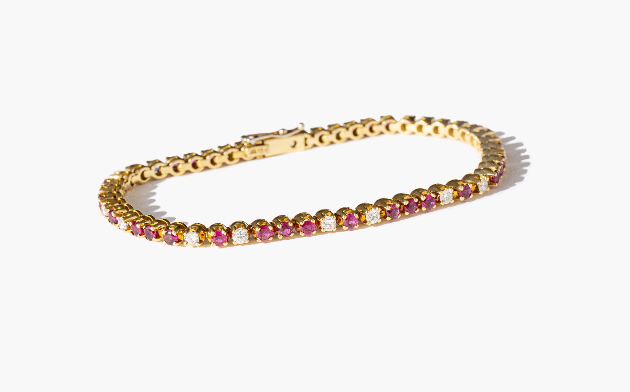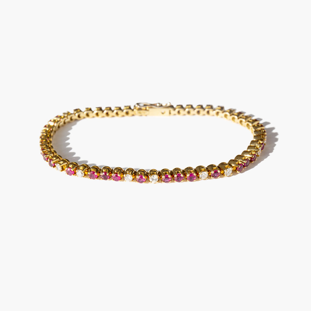 Elegant and weighty 18k gold, ruby and diamond tennis bracelet with just over 1 carat of diamonds.