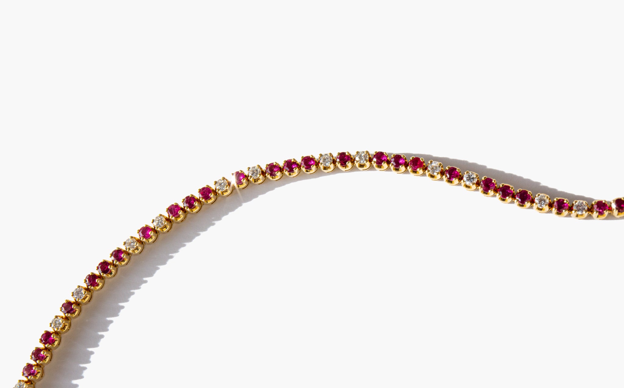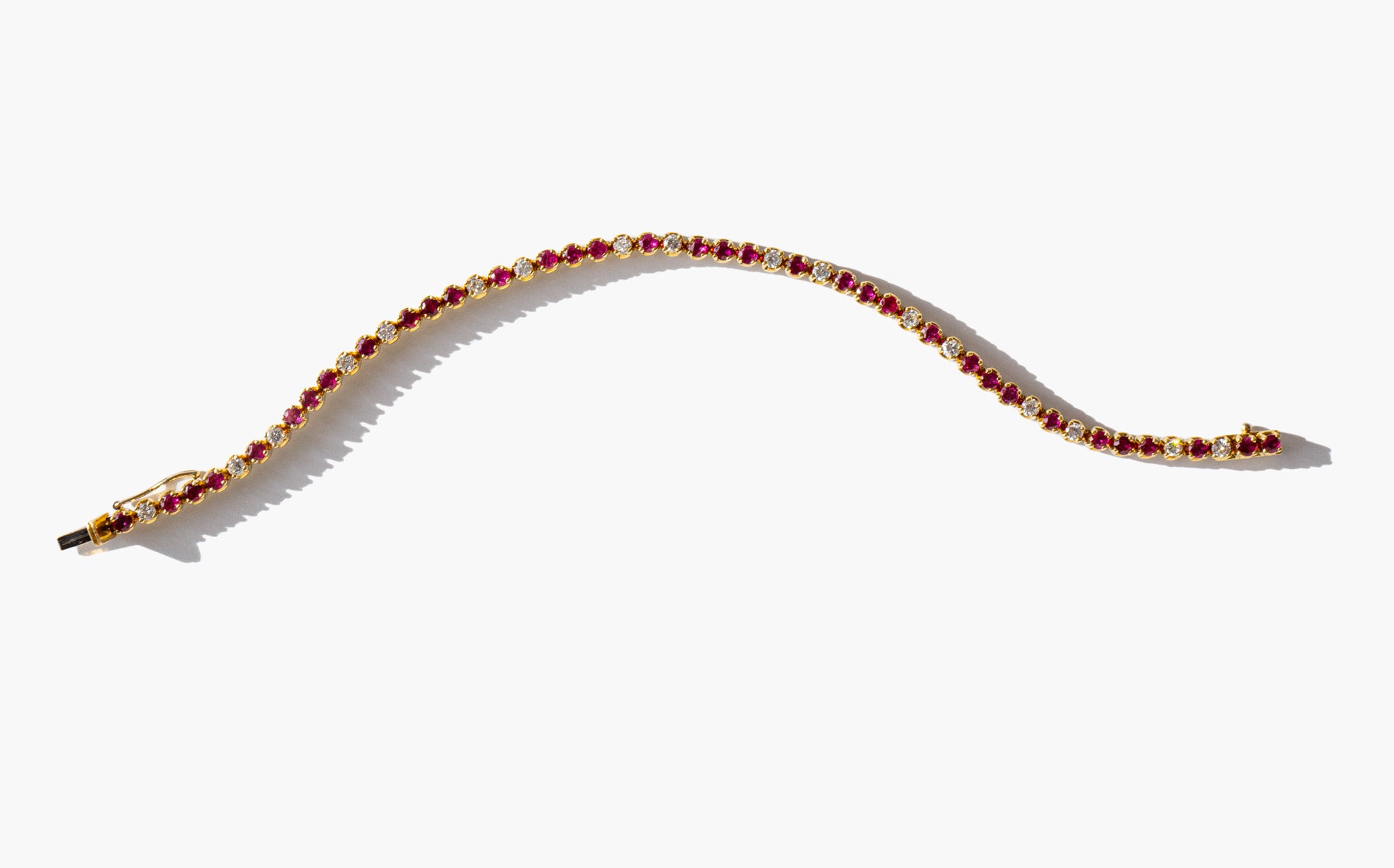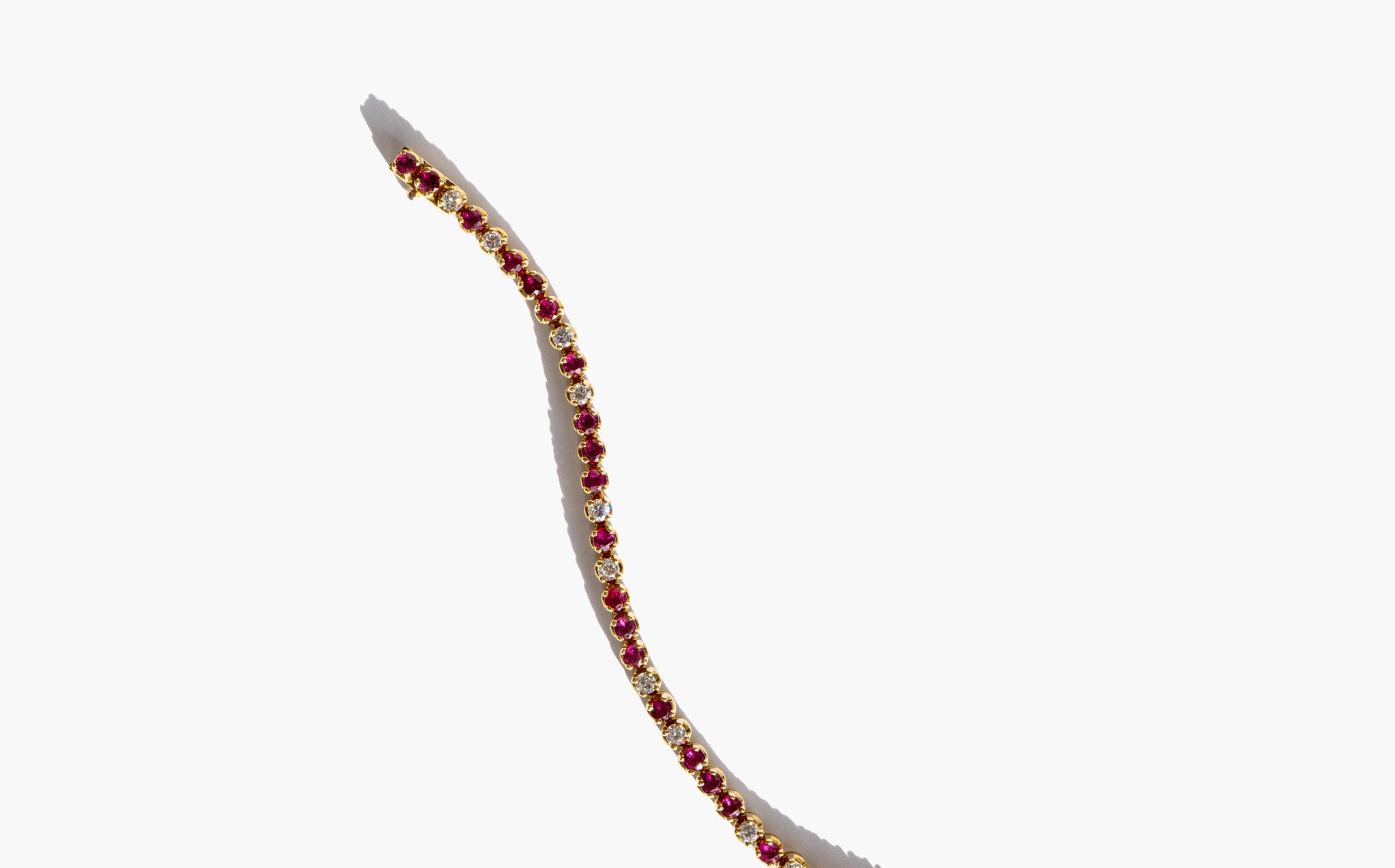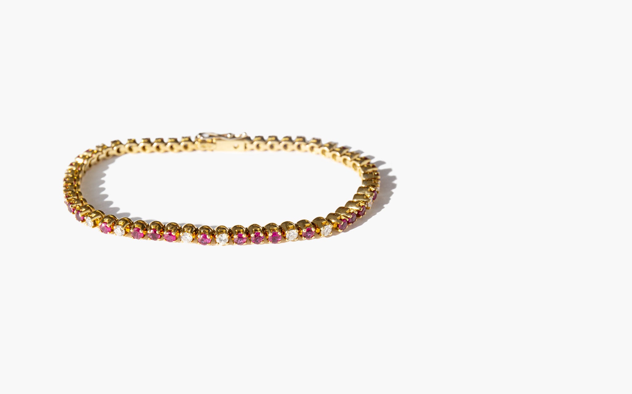 Elegant and weighty 18k gold, ruby and diamond tennis bracelet with just over 1 carat of diamonds.