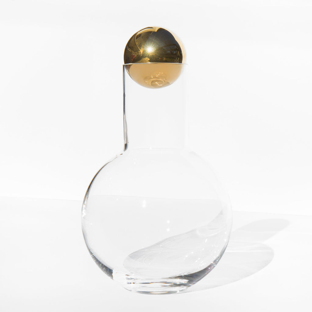 Made from hand-blown glass, this decanter has a heavy round brass stopper which provides an air-tight seal perfect for wine or water.