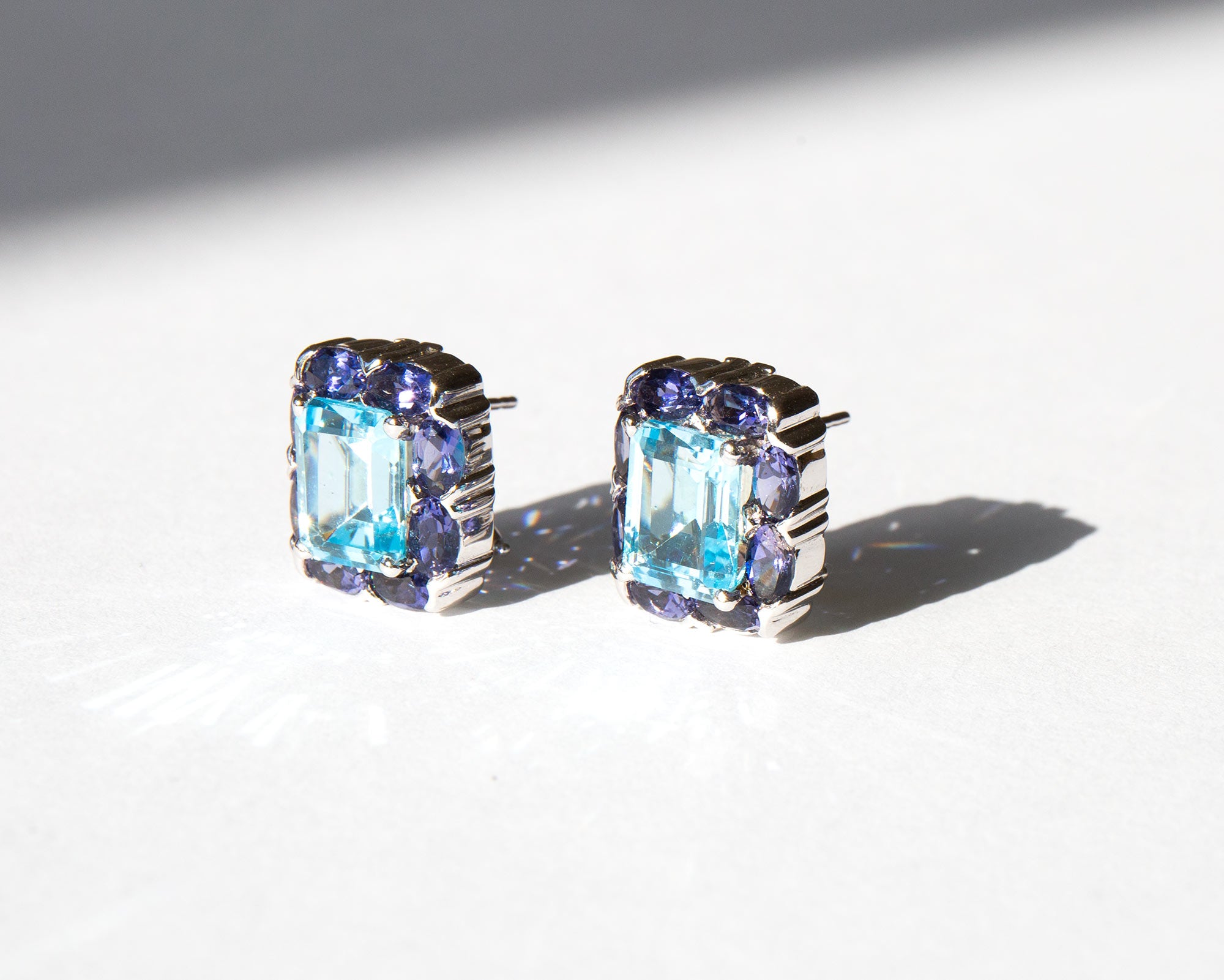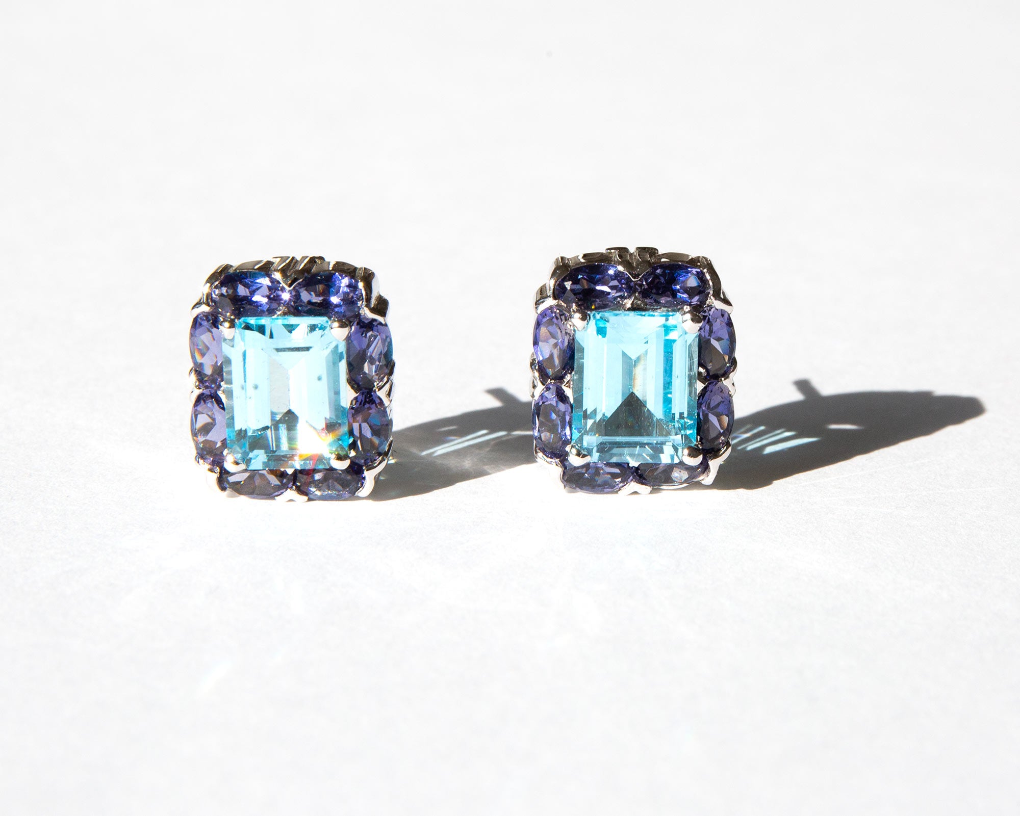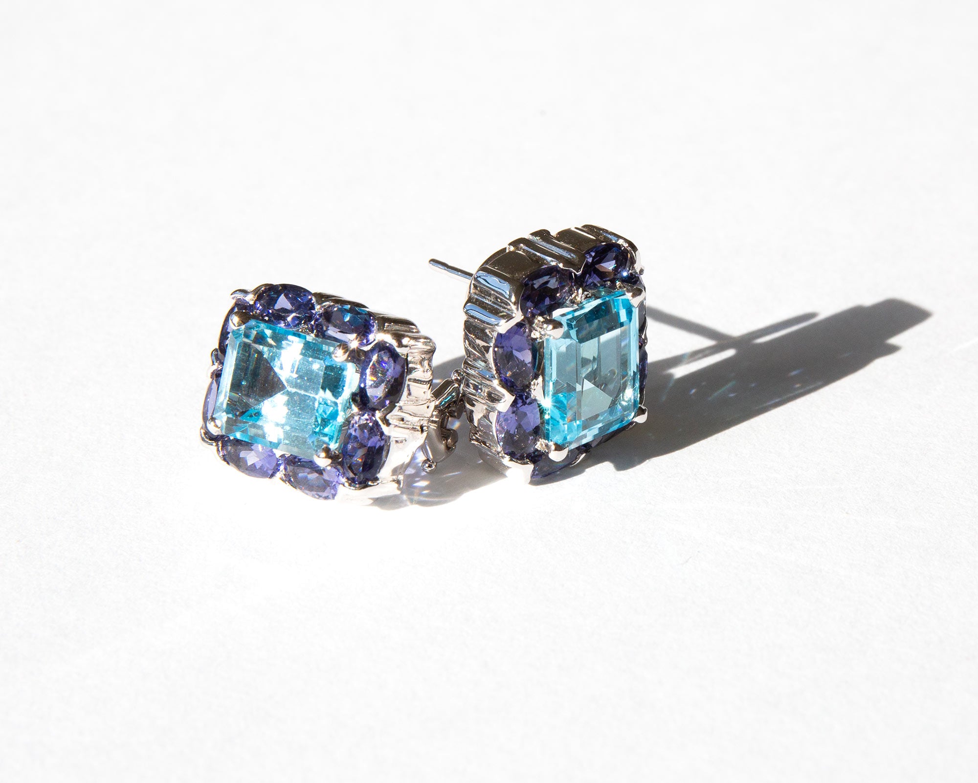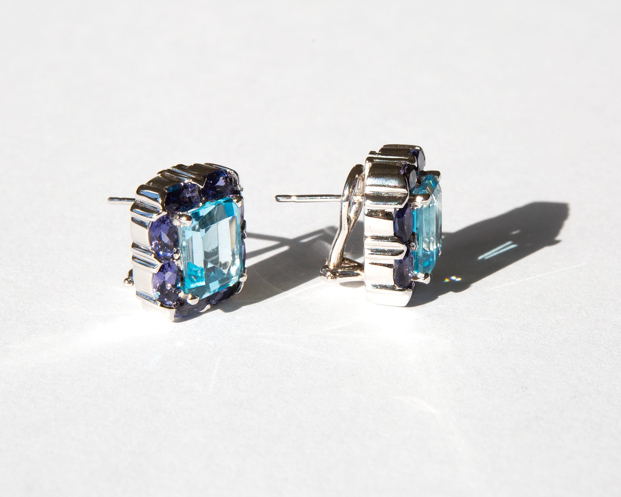 Sleek and sparkling 14k white gold, iolite, and blue topaz earrings. The Ancient Greeks thought blue topaz a stone that brought strength and it was believed during the middle ages that this bright blue gem could undo magic spells and sorcery. Most now associated blue topaz with calm, inner peace, and emotional stability. Iolite is known as the "viking's compass" and is thought to embody a spirit of wonder, curiosity, and exploration. It is known to be a guide for both physical and spiritual journeys and some say that it helps to restore balance during periods of emotional upheaval.