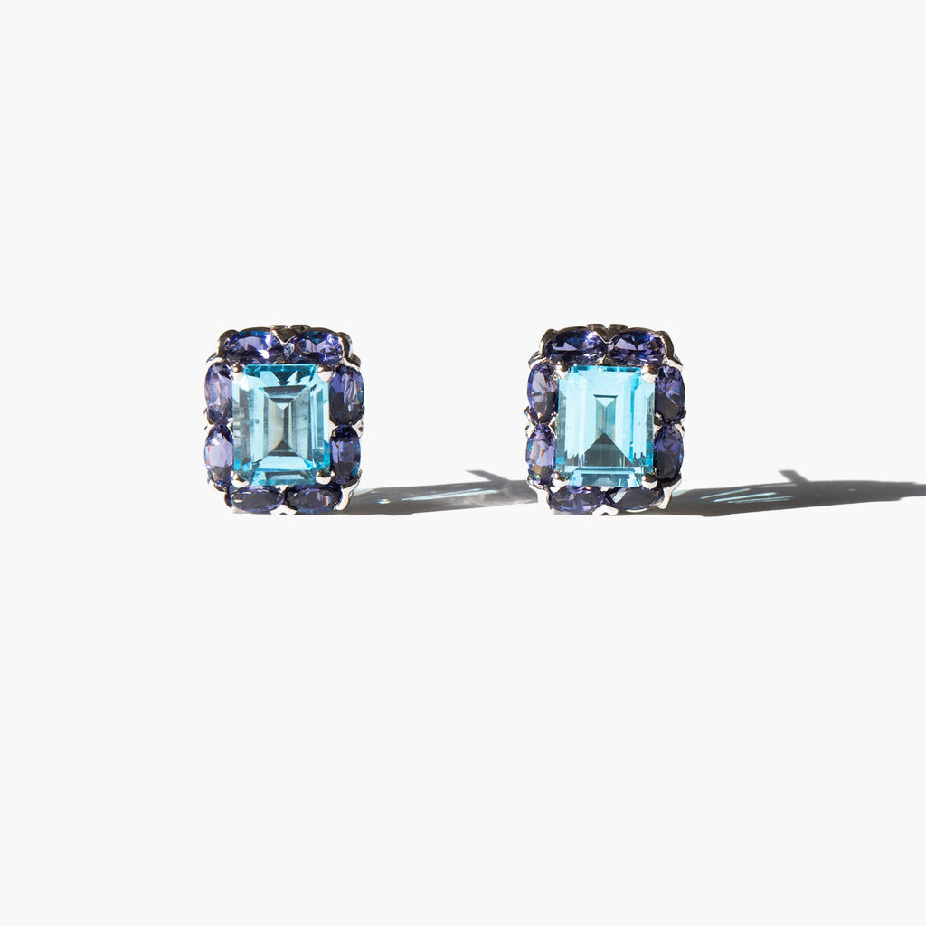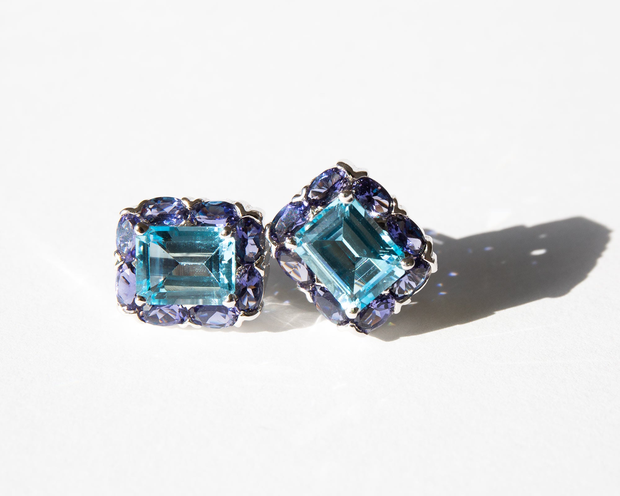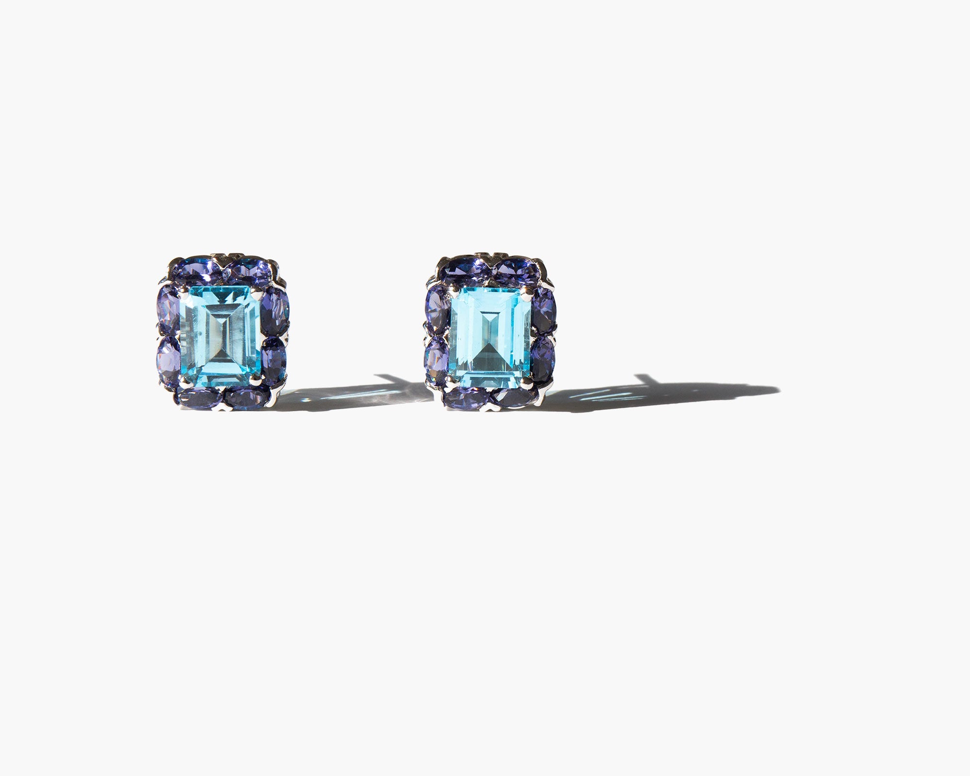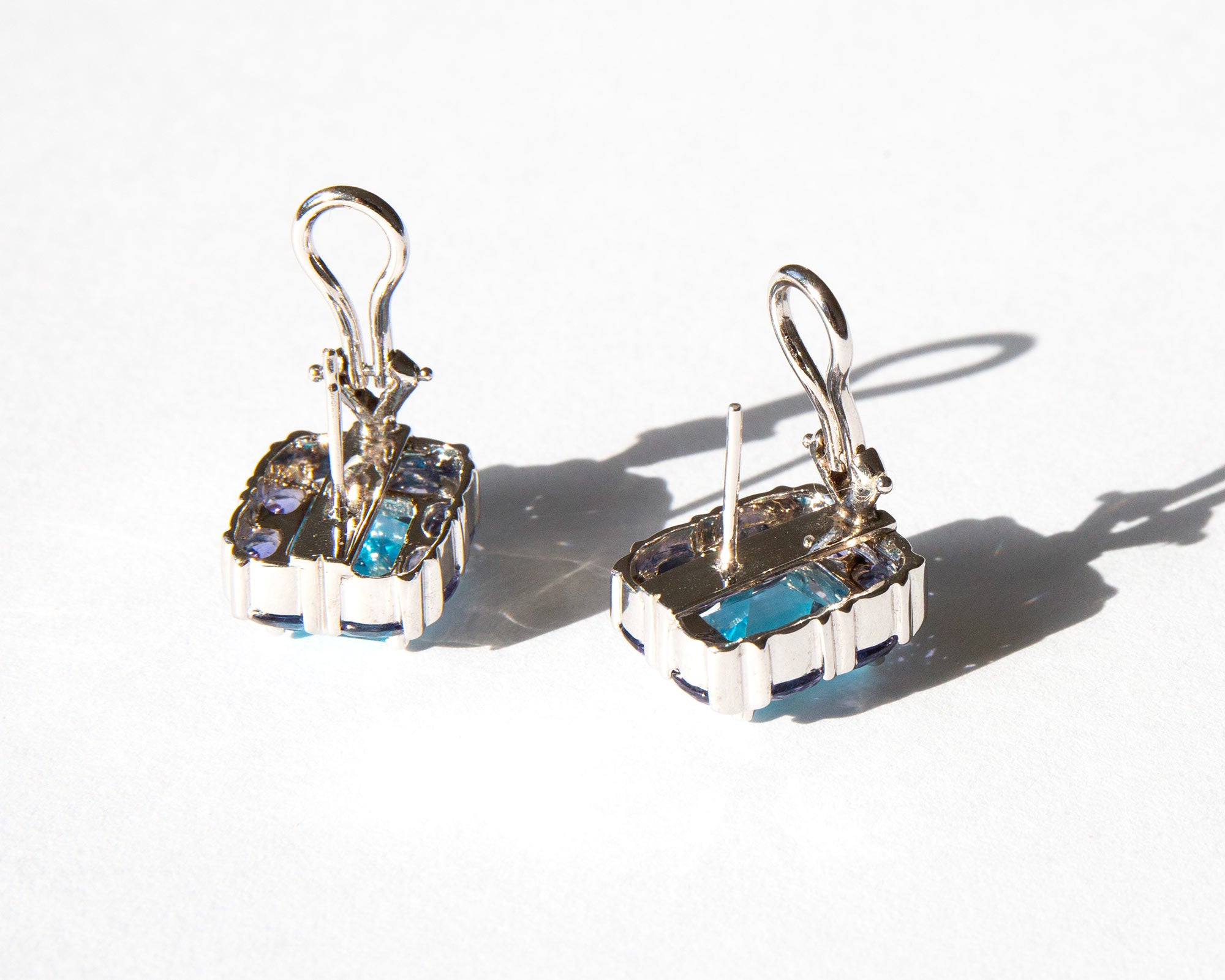 Sleek and sparkling 14k white gold, iolite, and blue topaz earrings. The Ancient Greeks thought blue topaz a stone that brought strength and it was believed during the middle ages that this bright blue gem could undo magic spells and sorcery. Most now associated blue topaz with calm, inner peace, and emotional stability. Iolite is known as the "viking's compass" and is thought to embody a spirit of wonder, curiosity, and exploration. It is known to be a guide for both physical and spiritual journeys and some say that it helps to restore balance during periods of emotional upheaval.