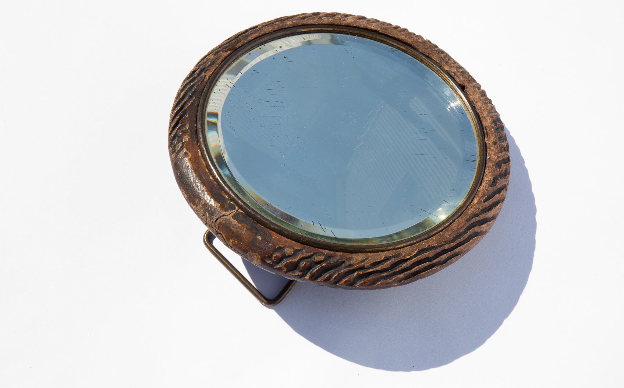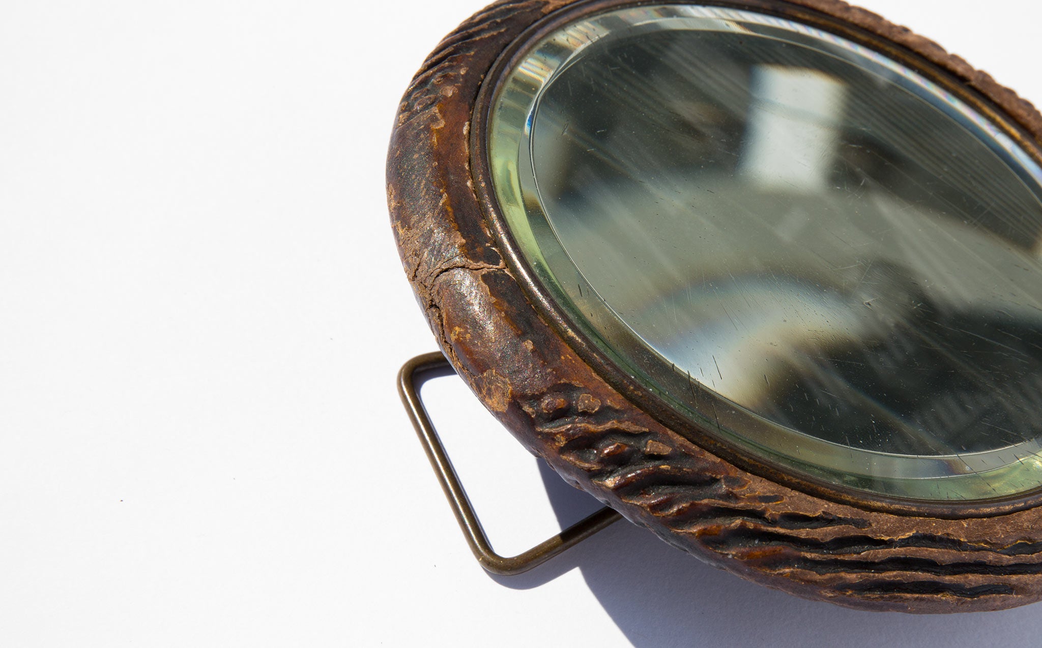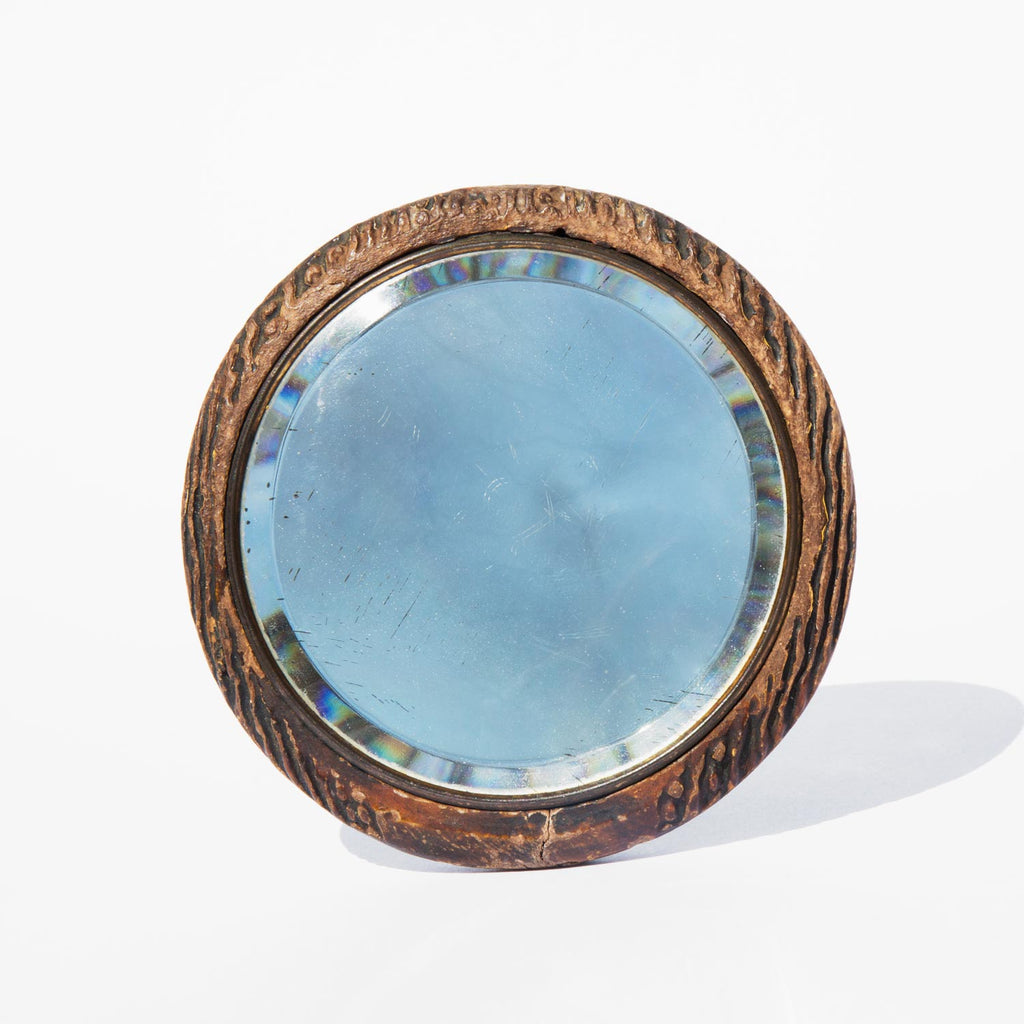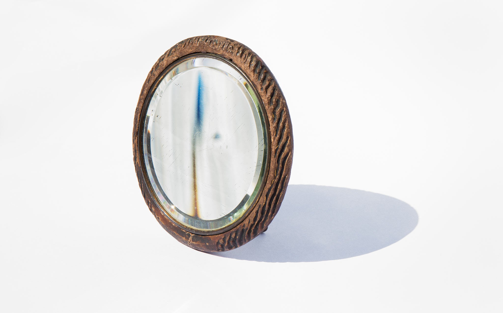 Diminutive antique wooden stand mirror, carved to resemble horn.