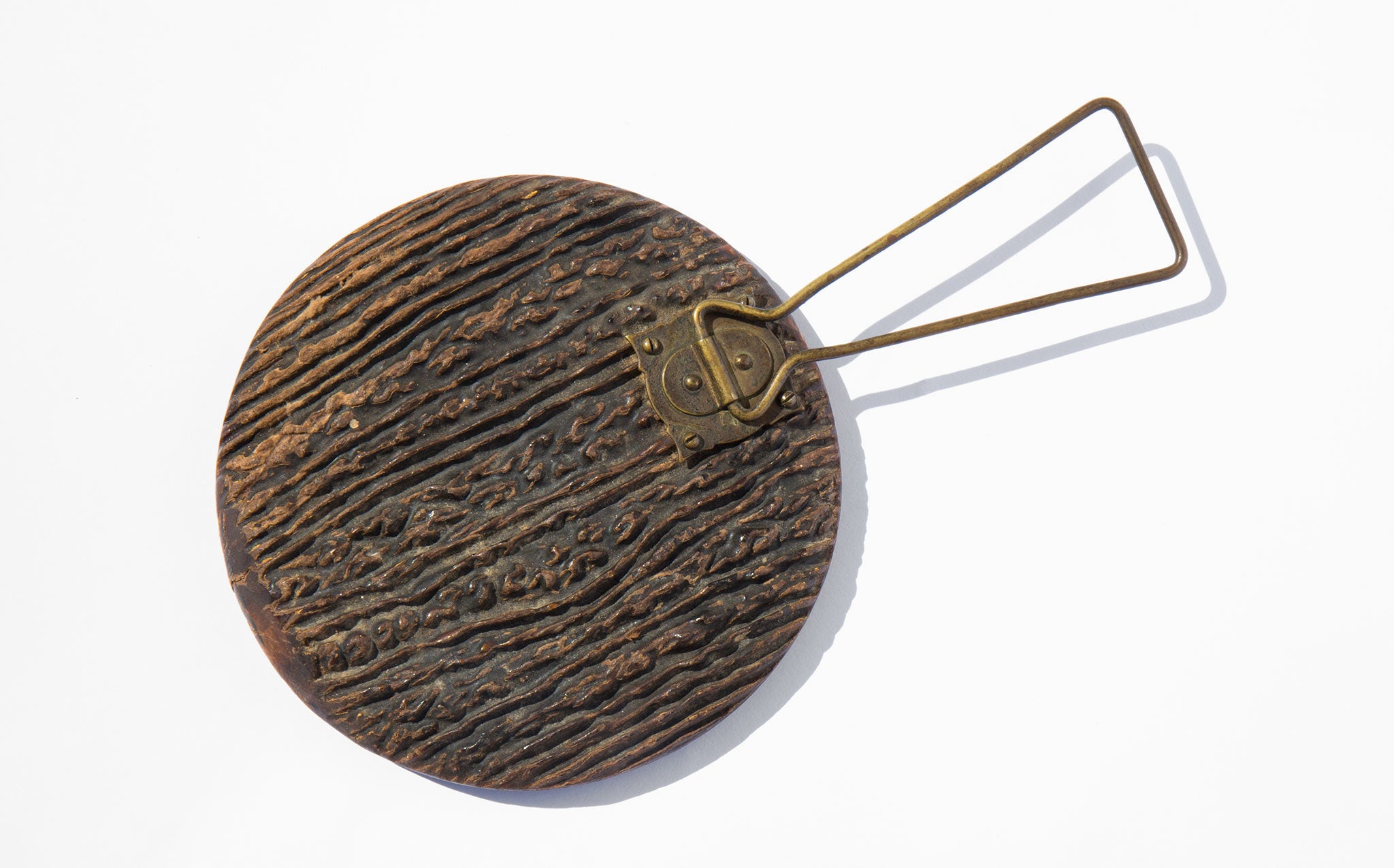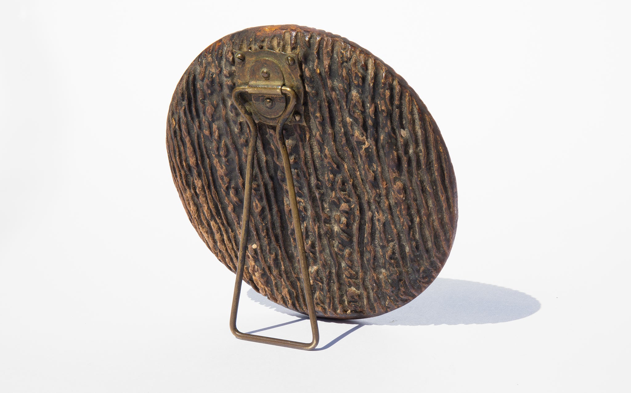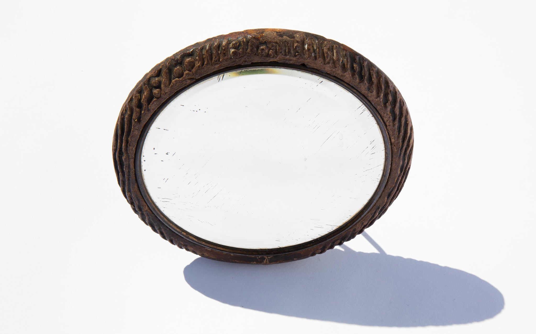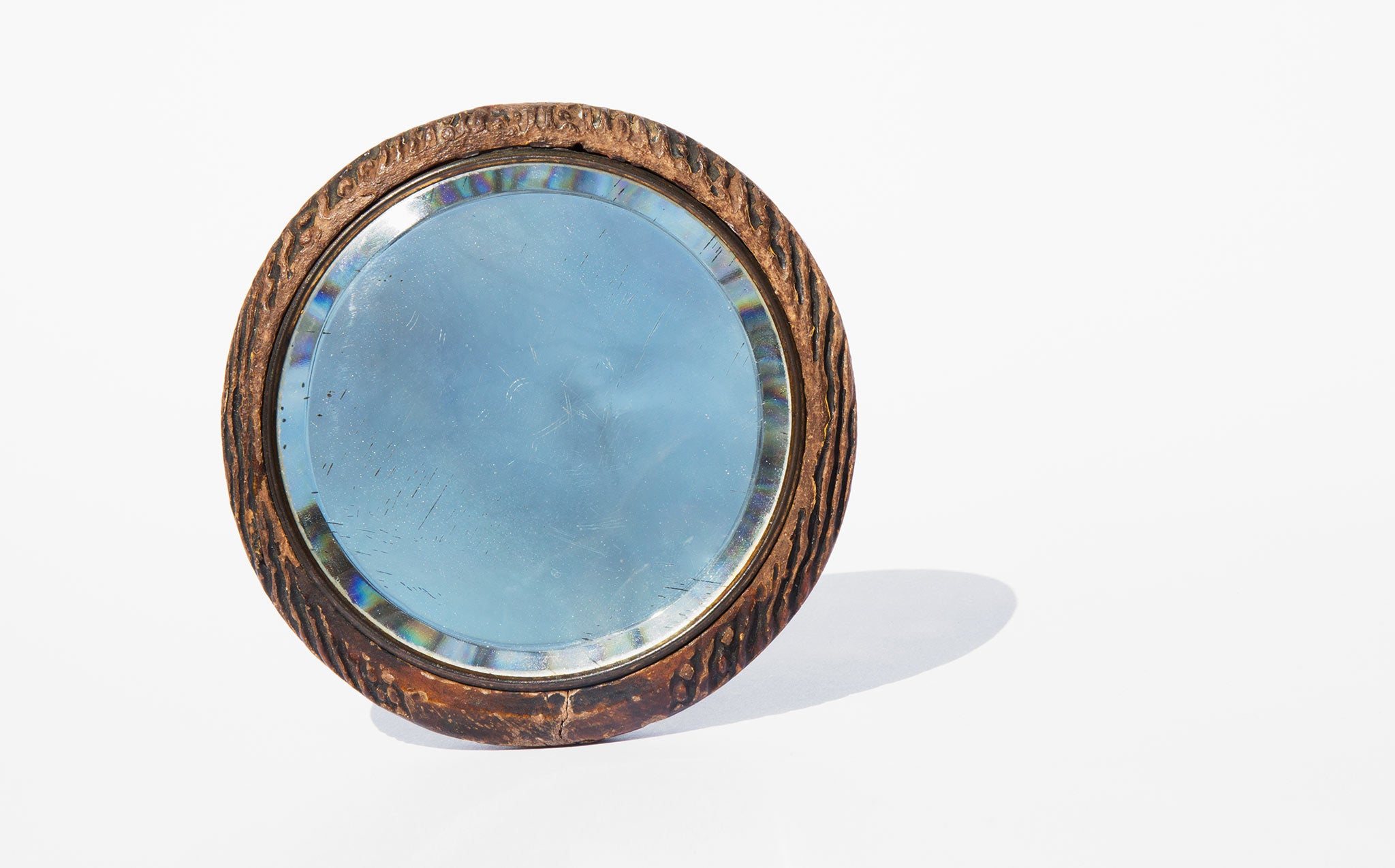 Diminutive antique wooden stand mirror, carved to resemble horn.