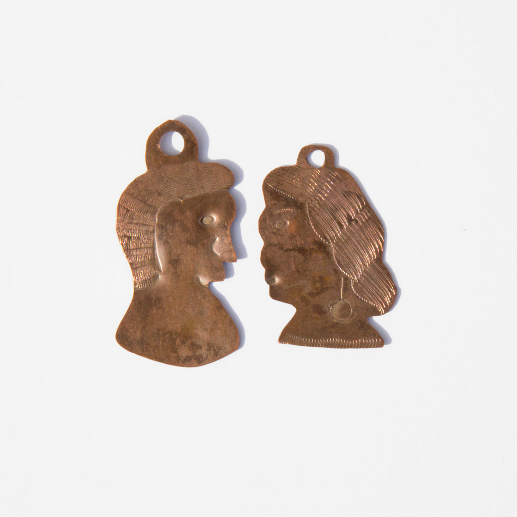 Antique Peruvian, hammered copper milagros of a man and a woman's head. A symbol of the love between two like-minded souls.
