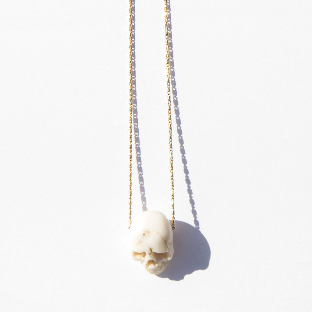 Antique coral skull pendant strung on a sparkling 14K gold vintage chain.