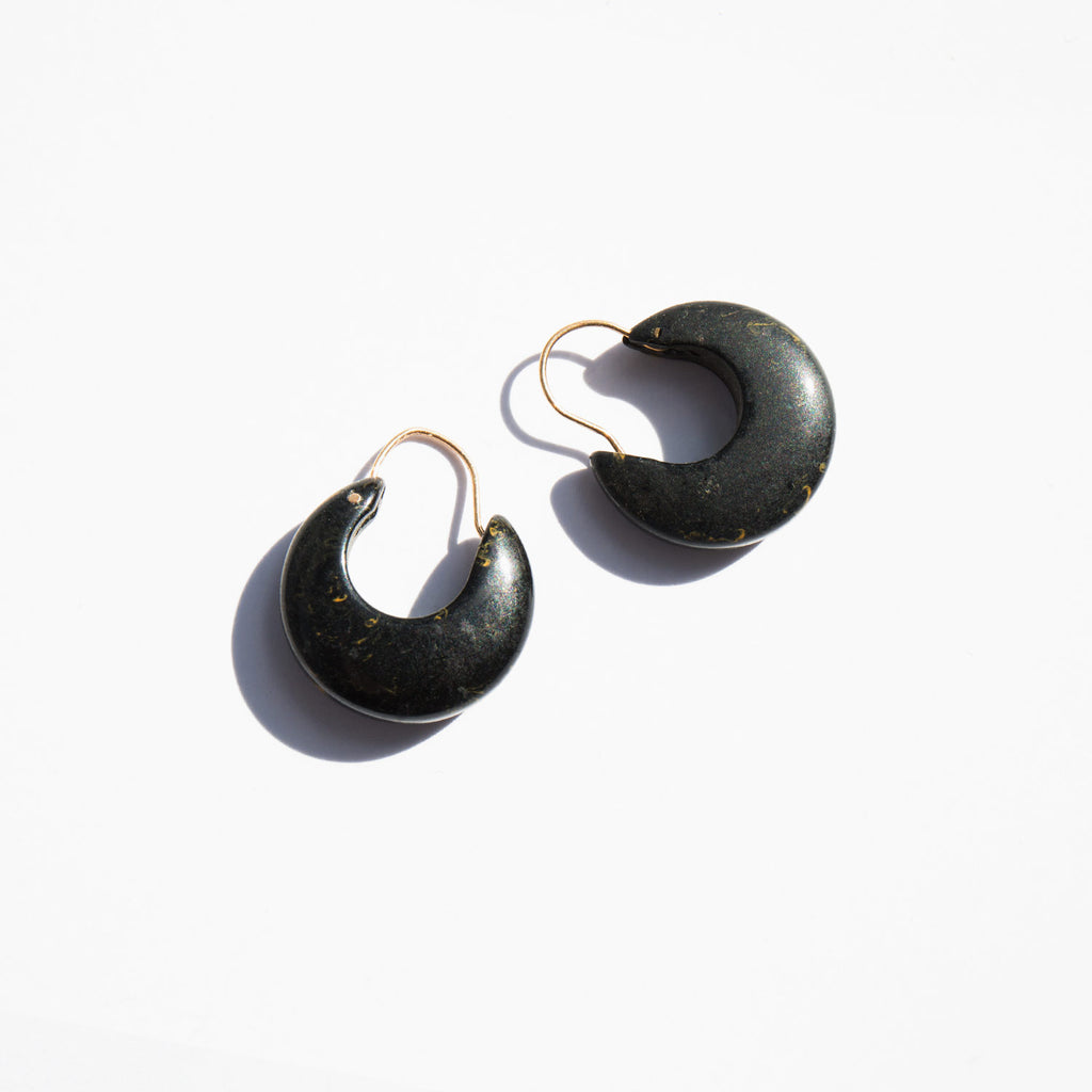 Small, crescent shaped onyx hoop earrings with delicate 14k gold curved posts.