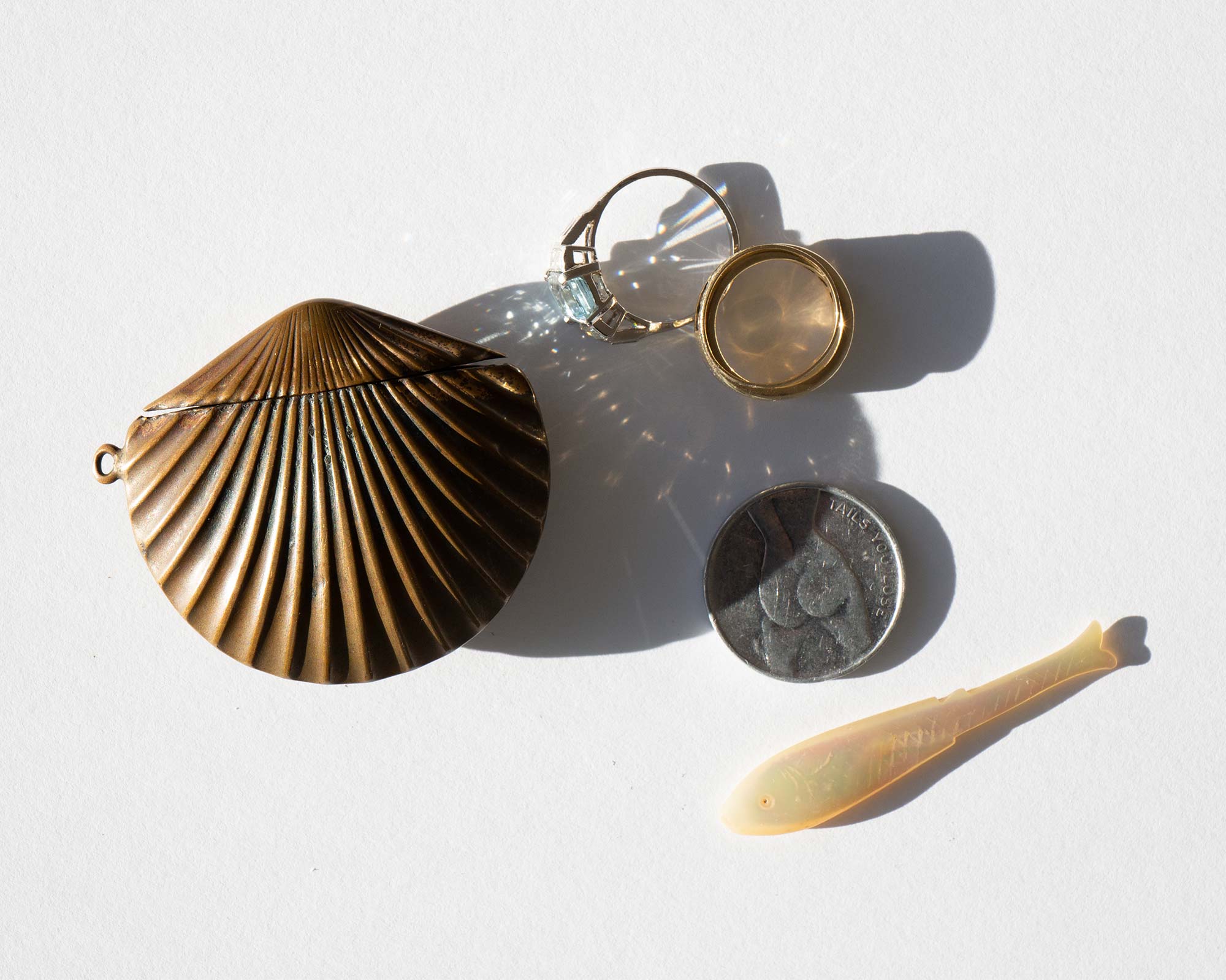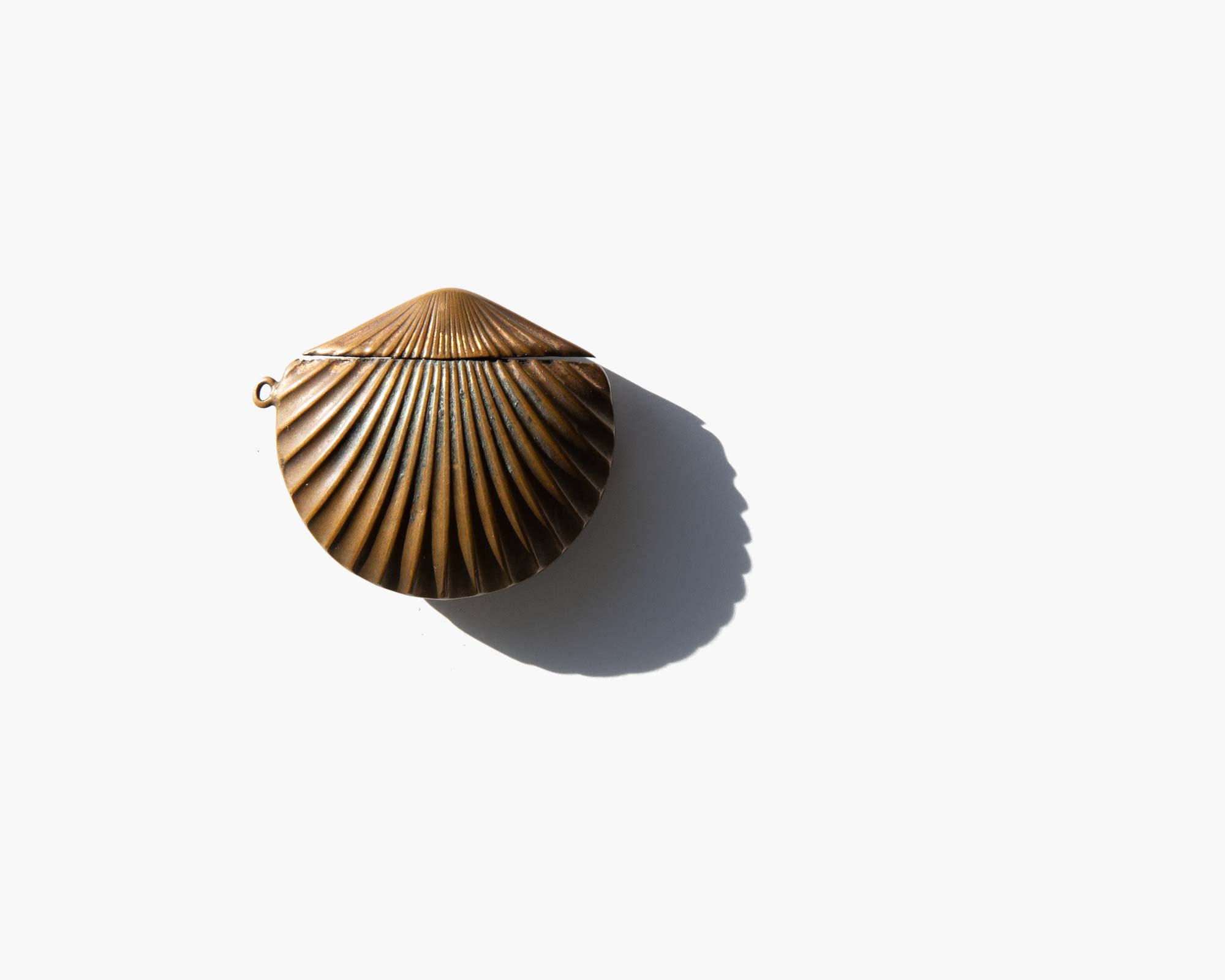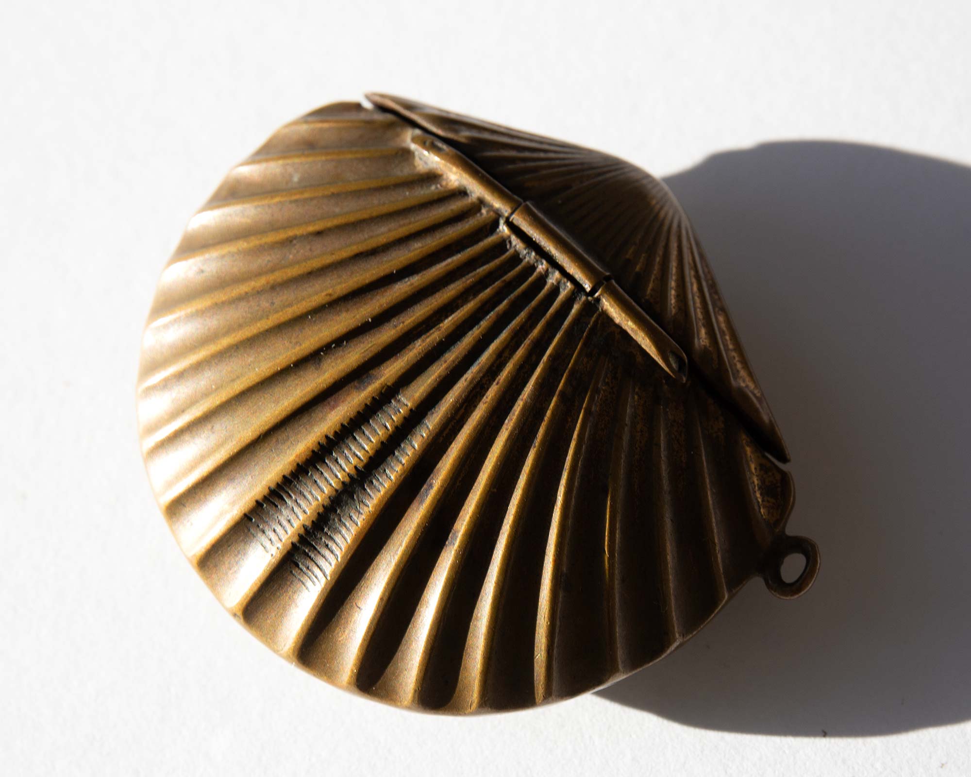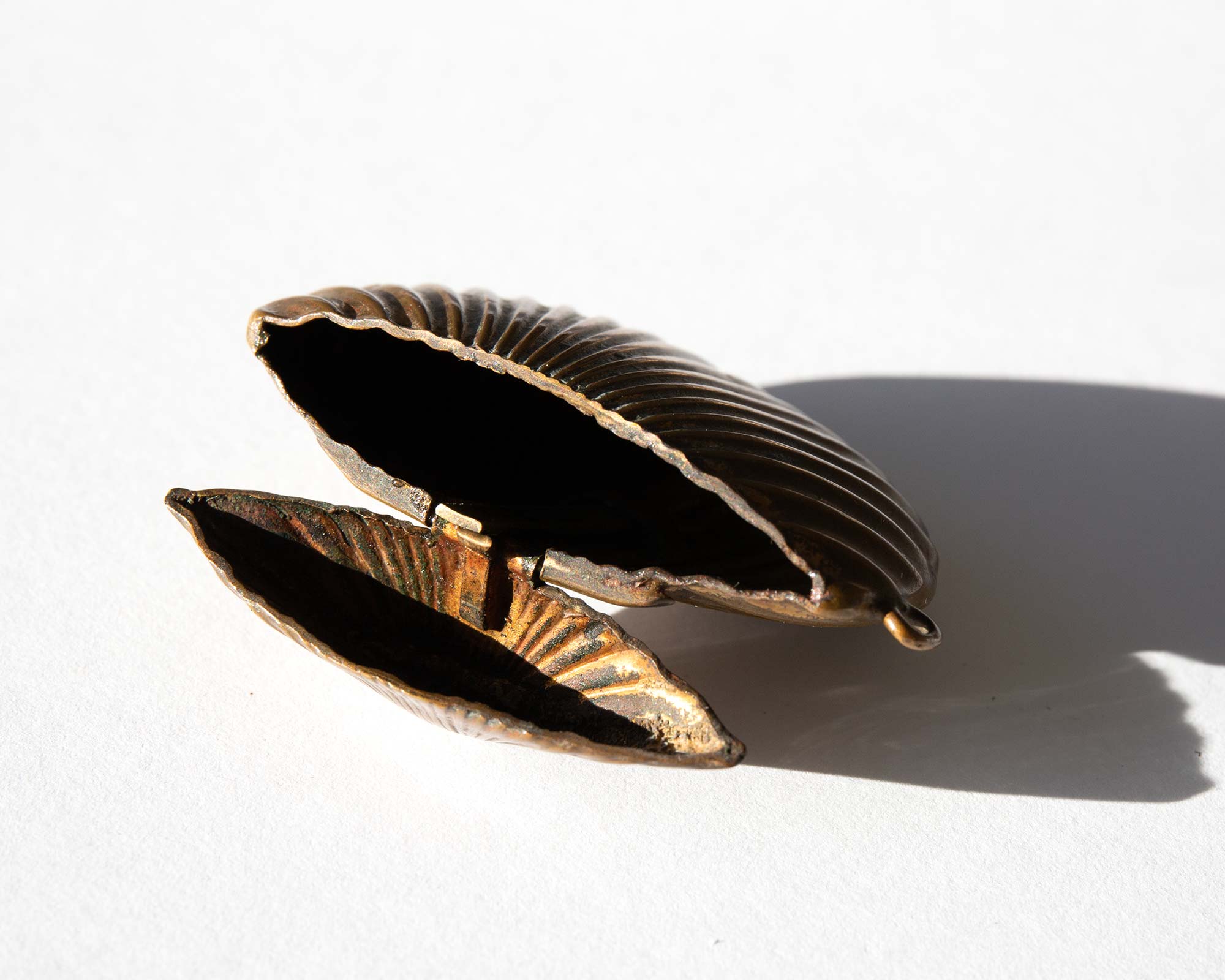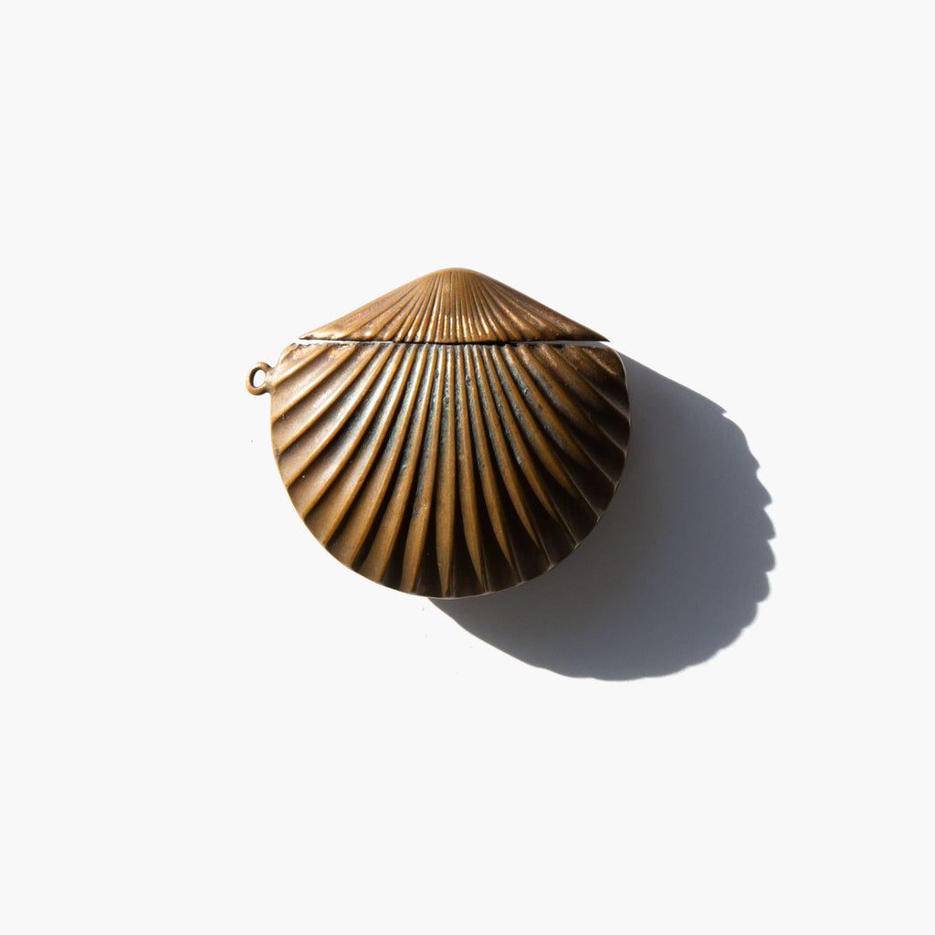 Antique Victorian brass seashell vesta case circa 1880, a small box with a lid used for keeping matches.