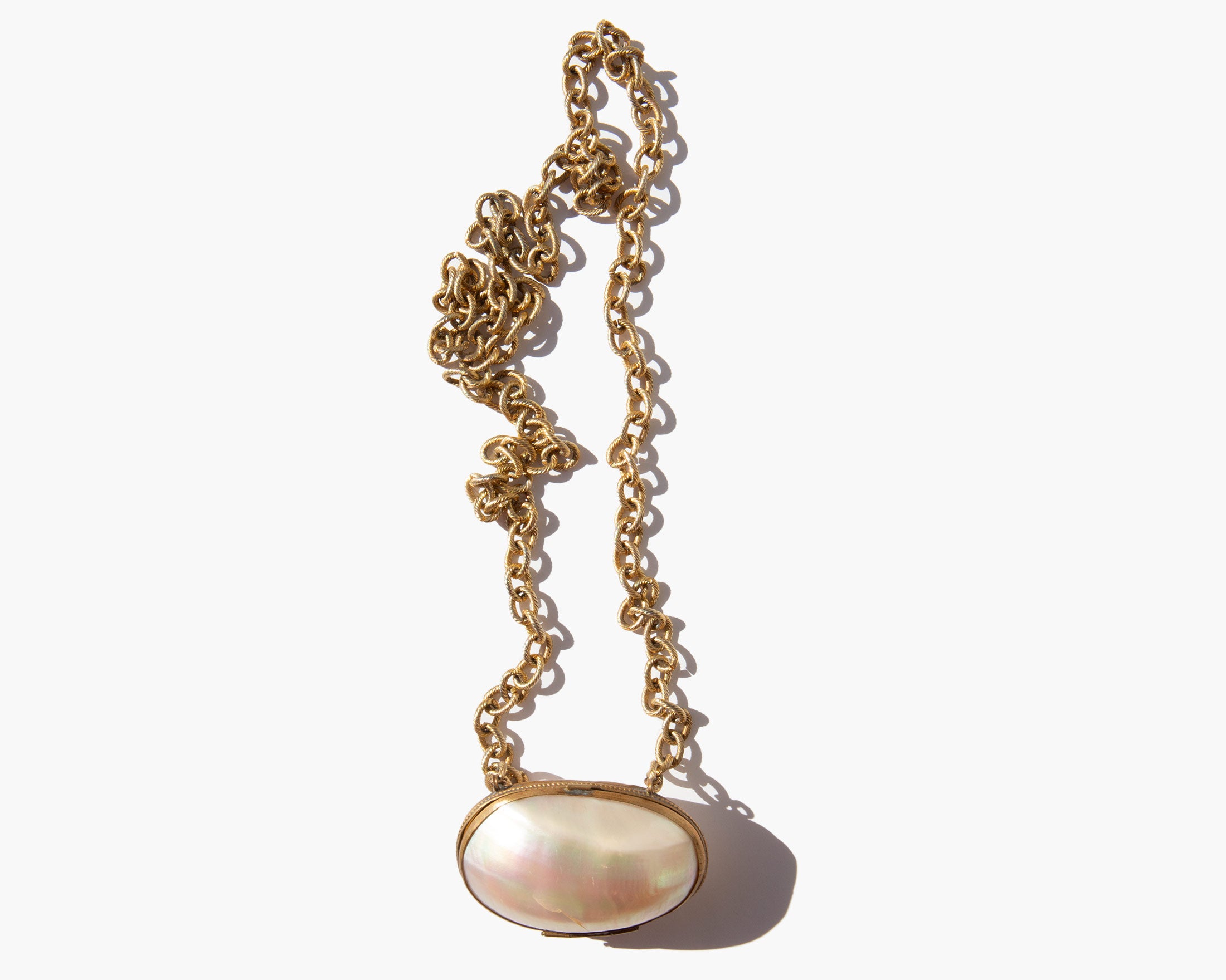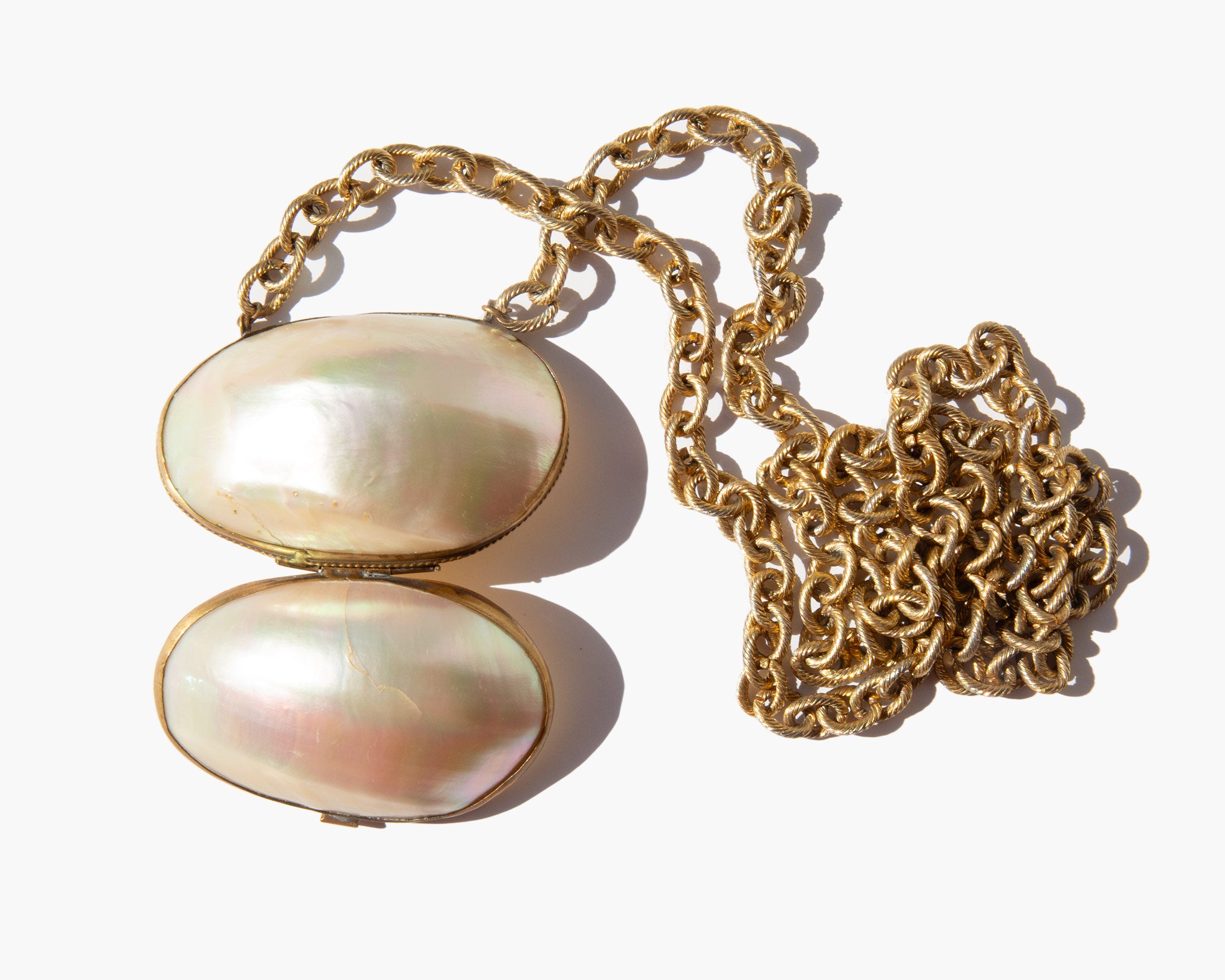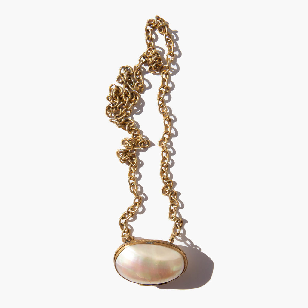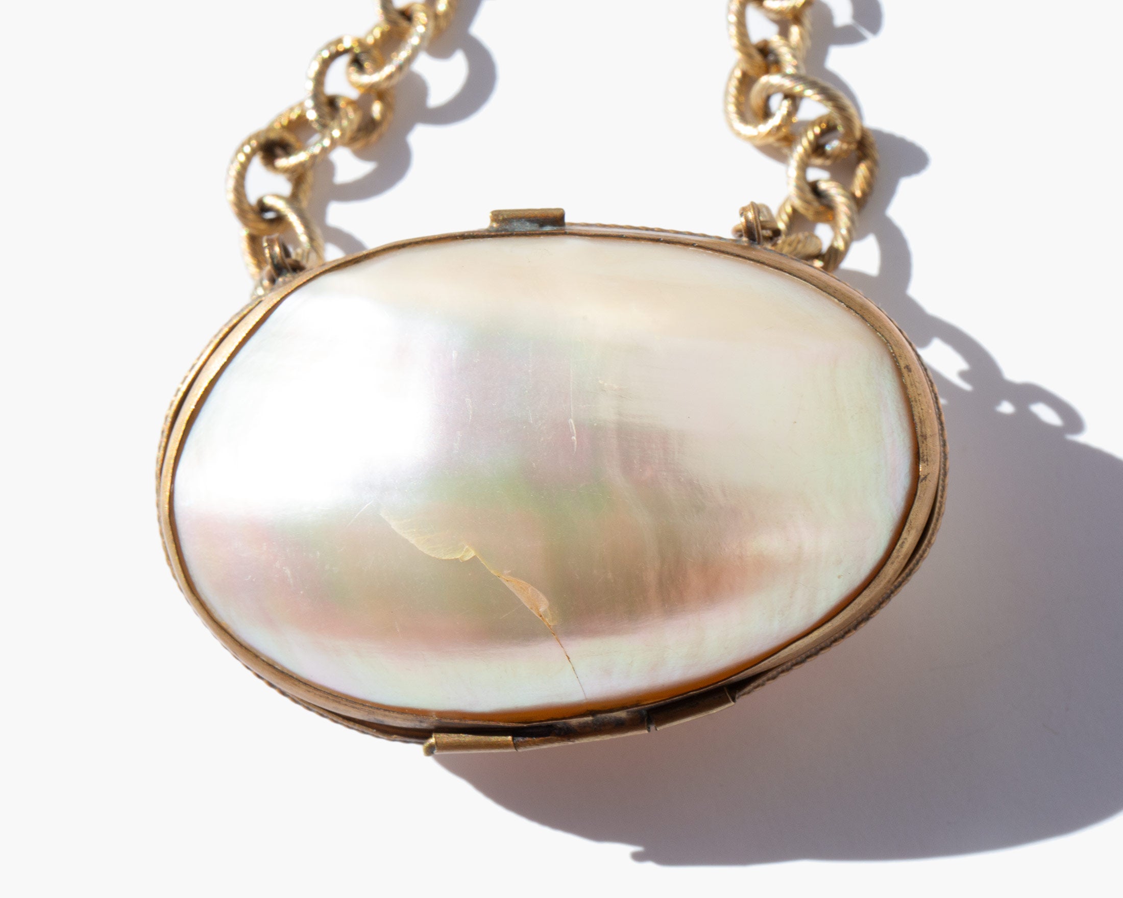 Antique Victorian mother of pearl shell chatelaine on gold tone metal chain with beaded metal mounts.