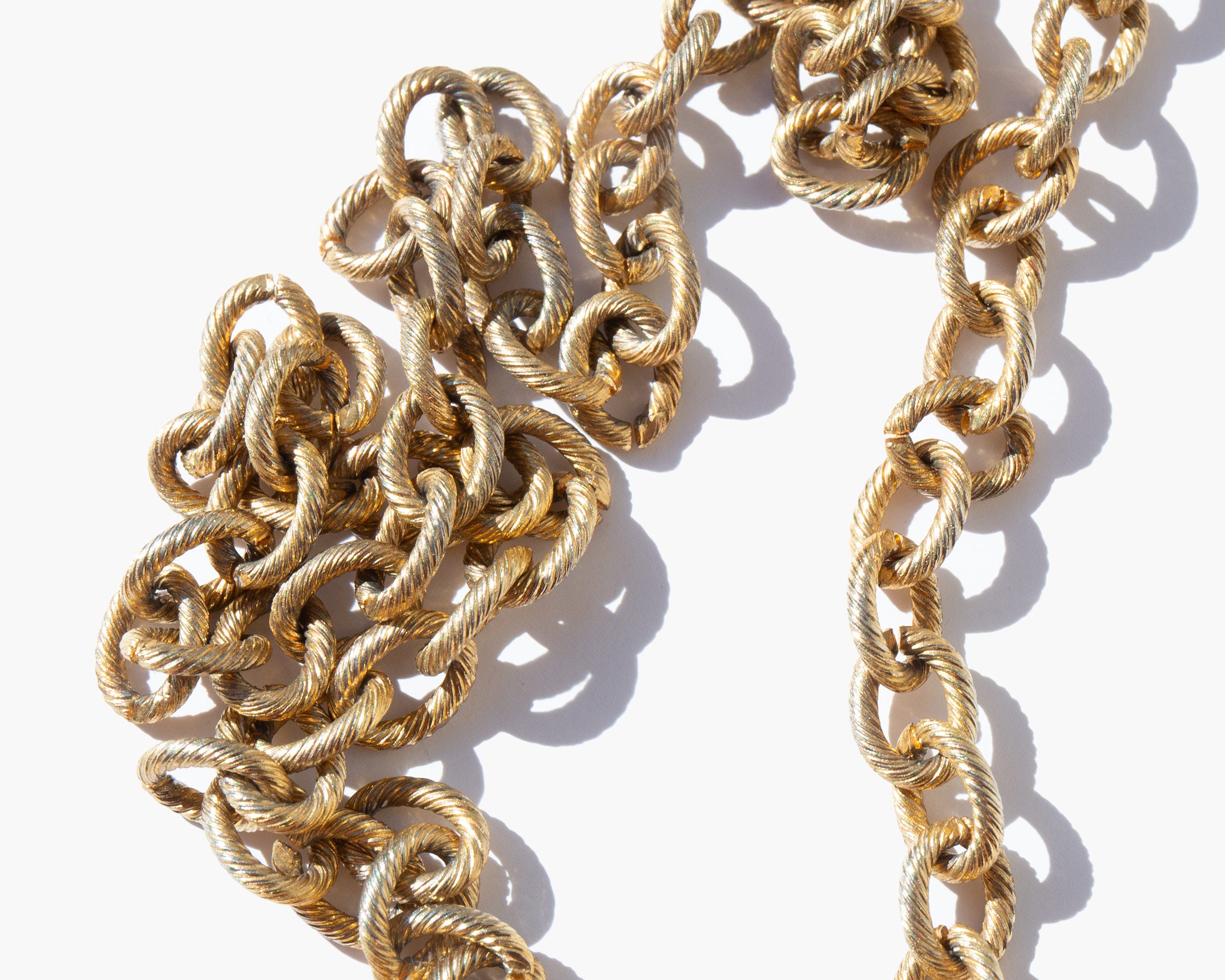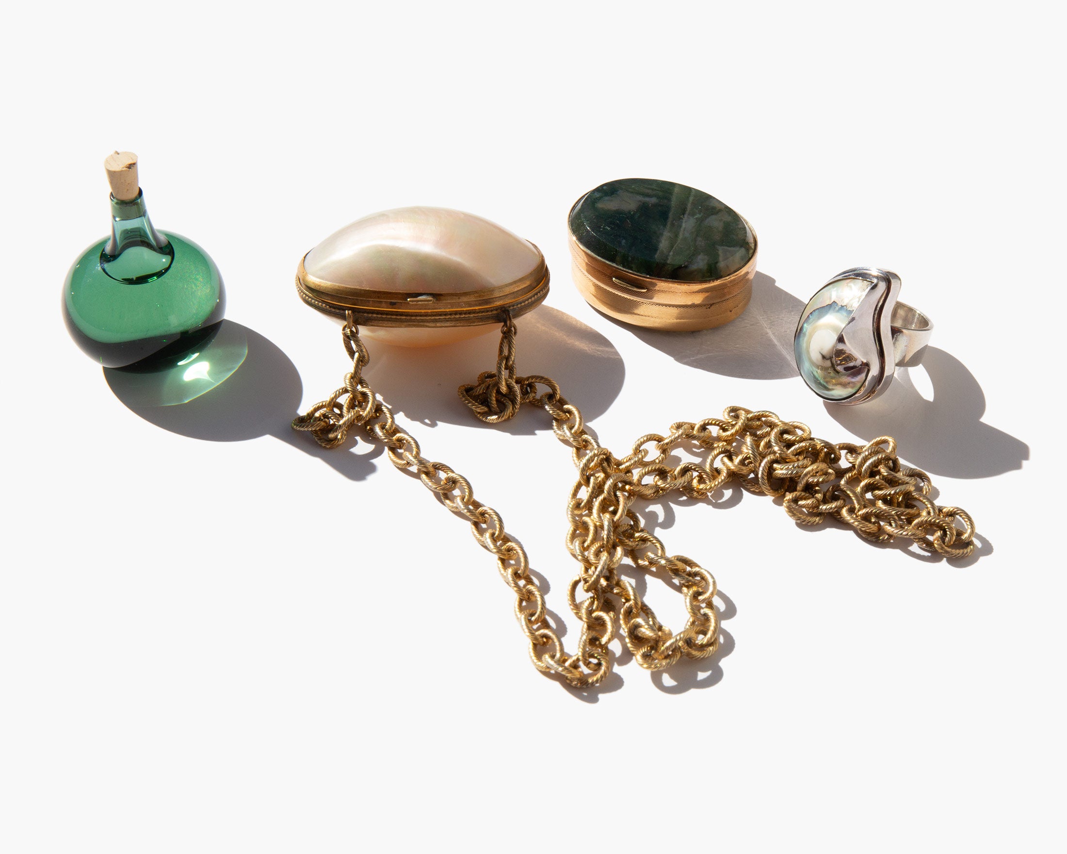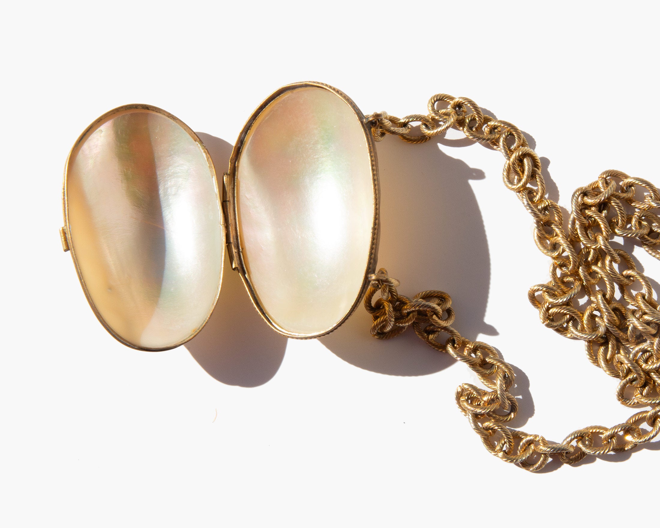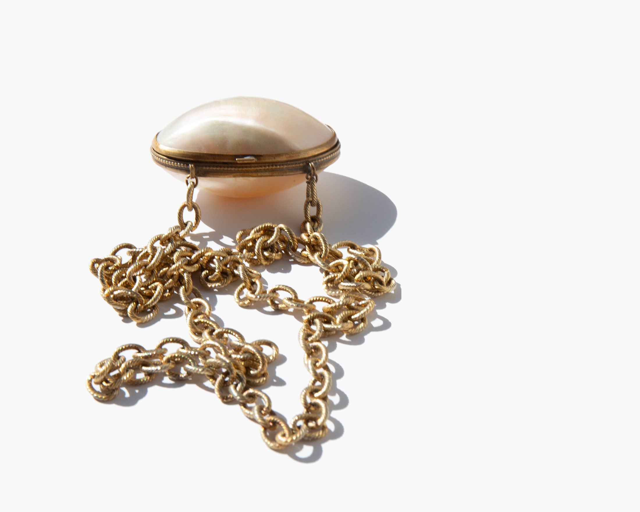 Antique Victorian mother of pearl shell chatelaine on gold tone metal chain with beaded metal mounts.