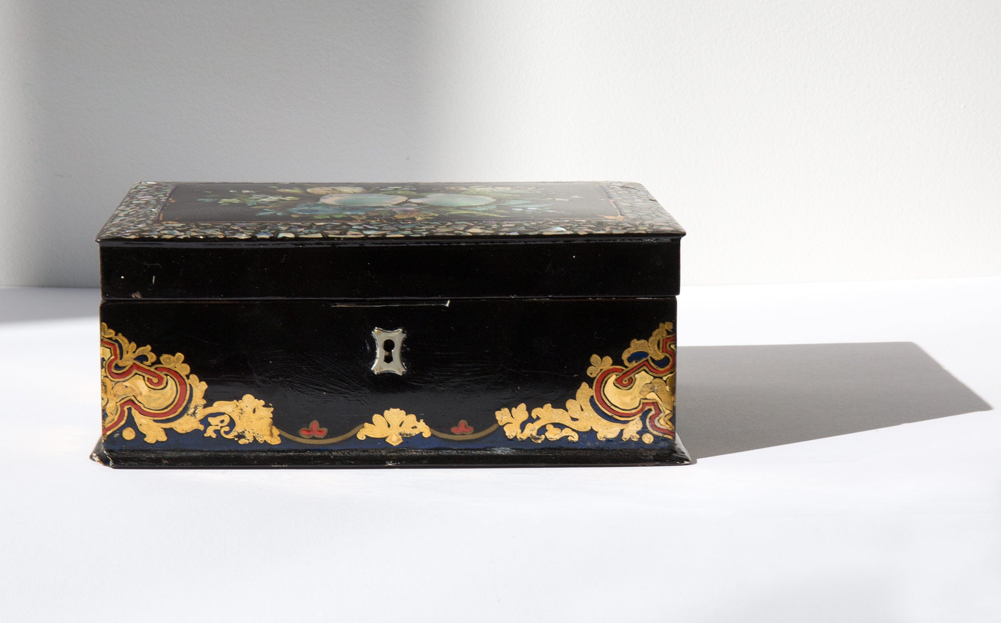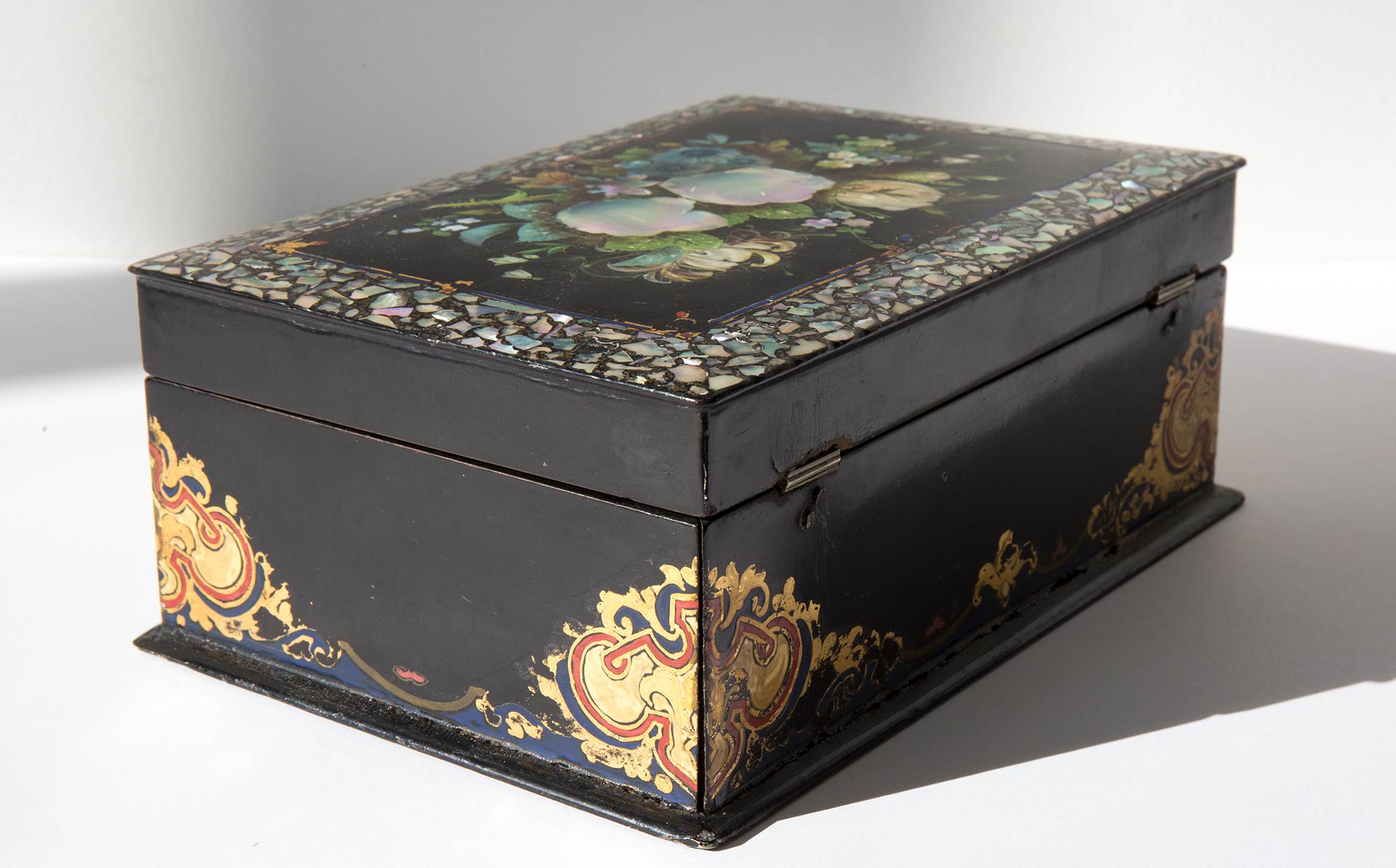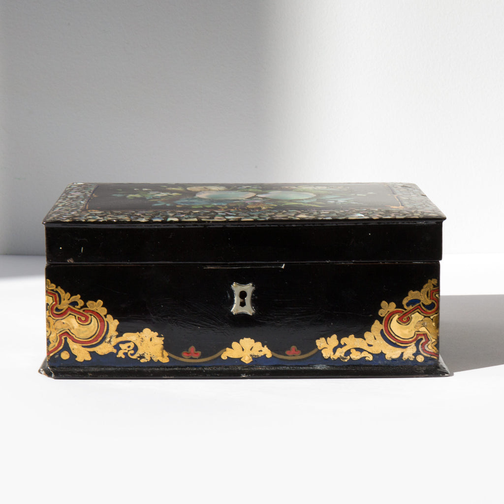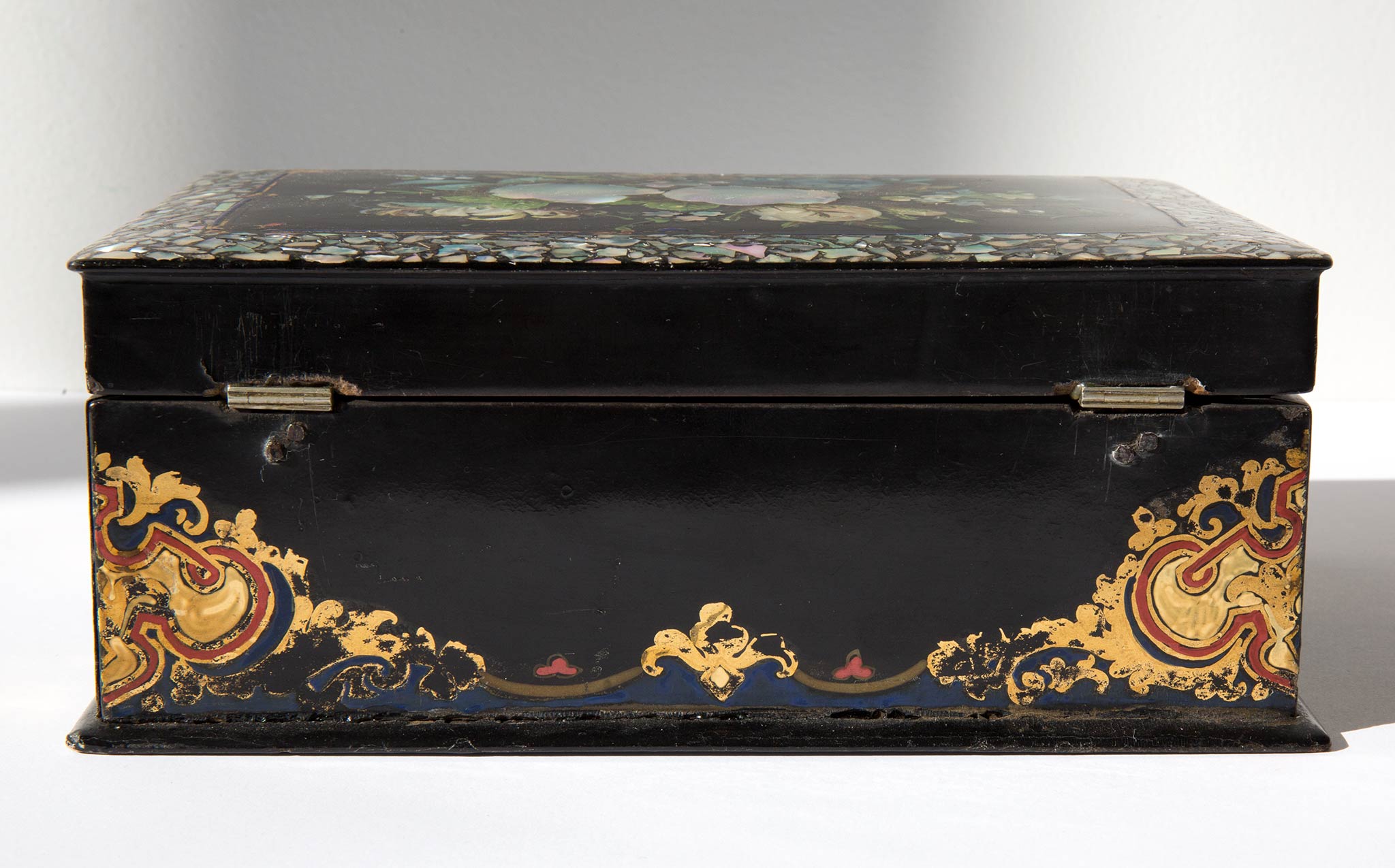 Gorgeous, hand painted Victorian paper mache box with abalone and mother-of-pearl inlay.