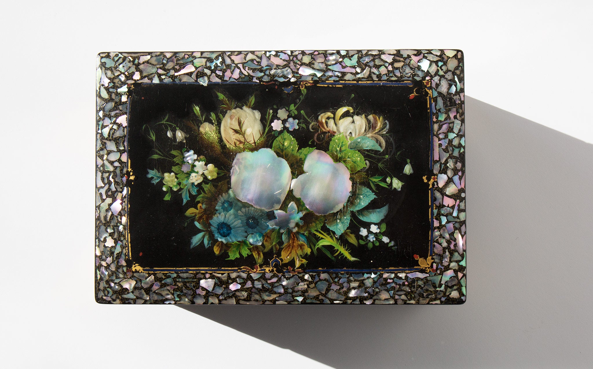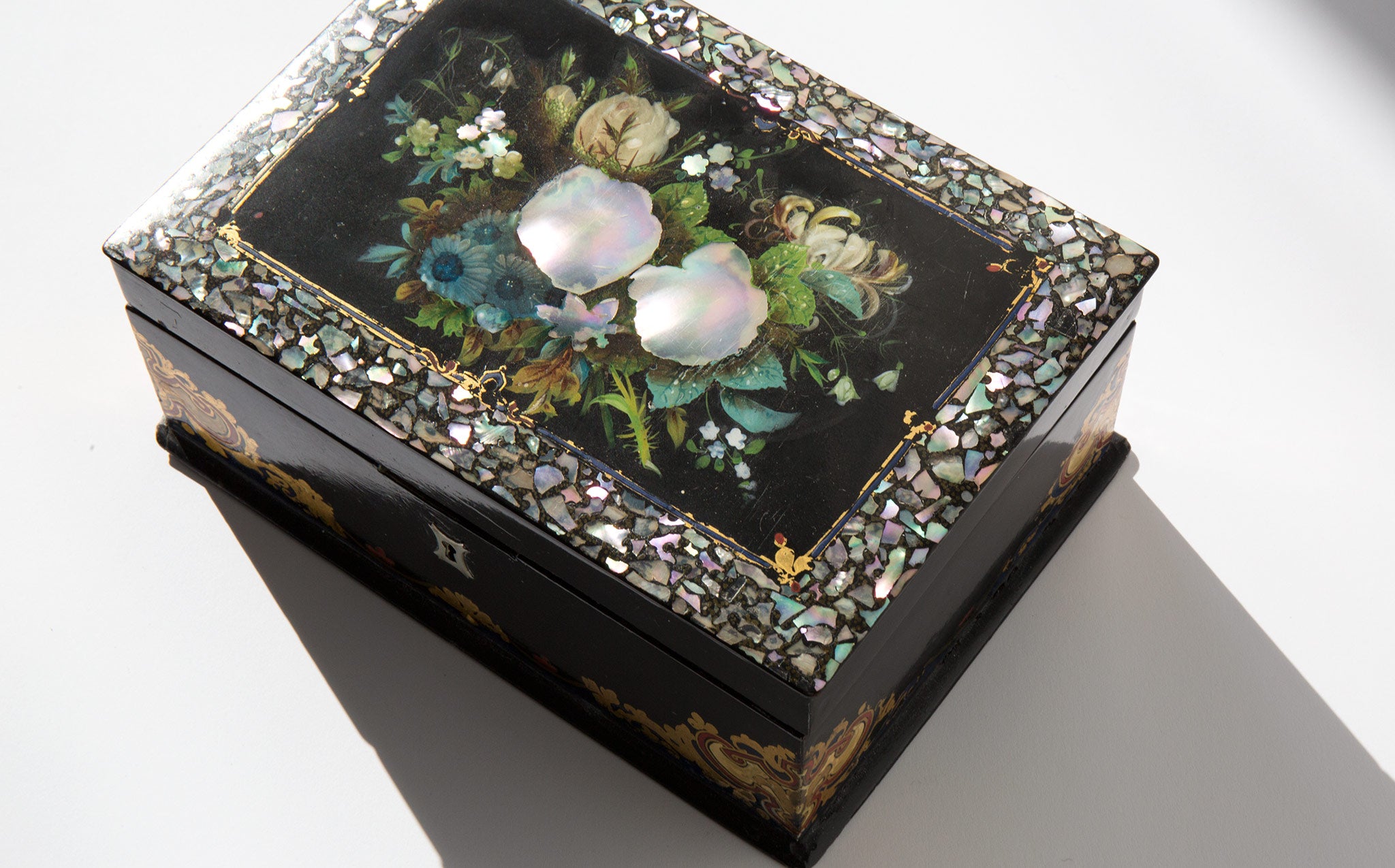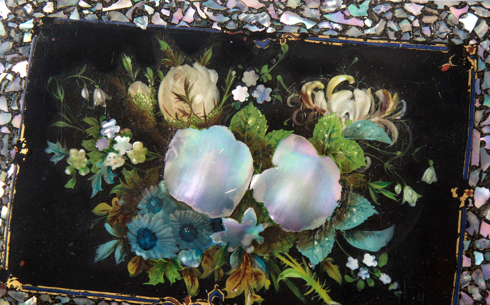Gorgeous, hand painted Victorian paper mache box with abalone and mother-of-pearl inlay.