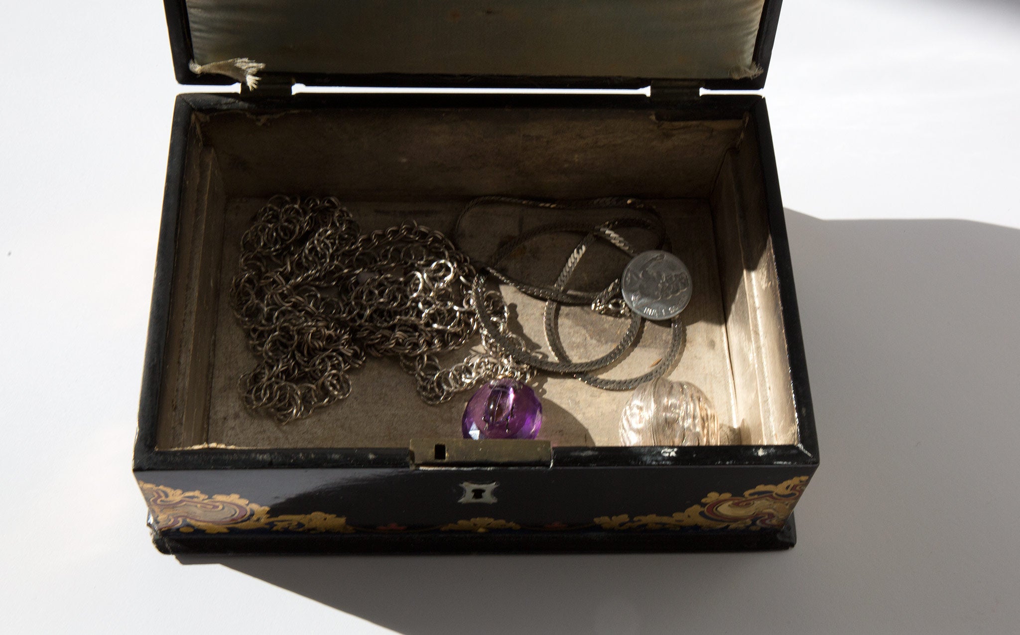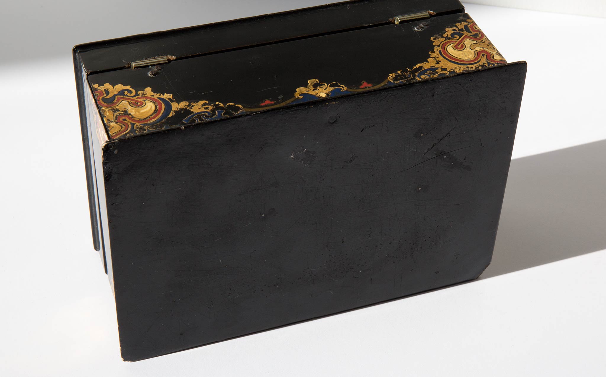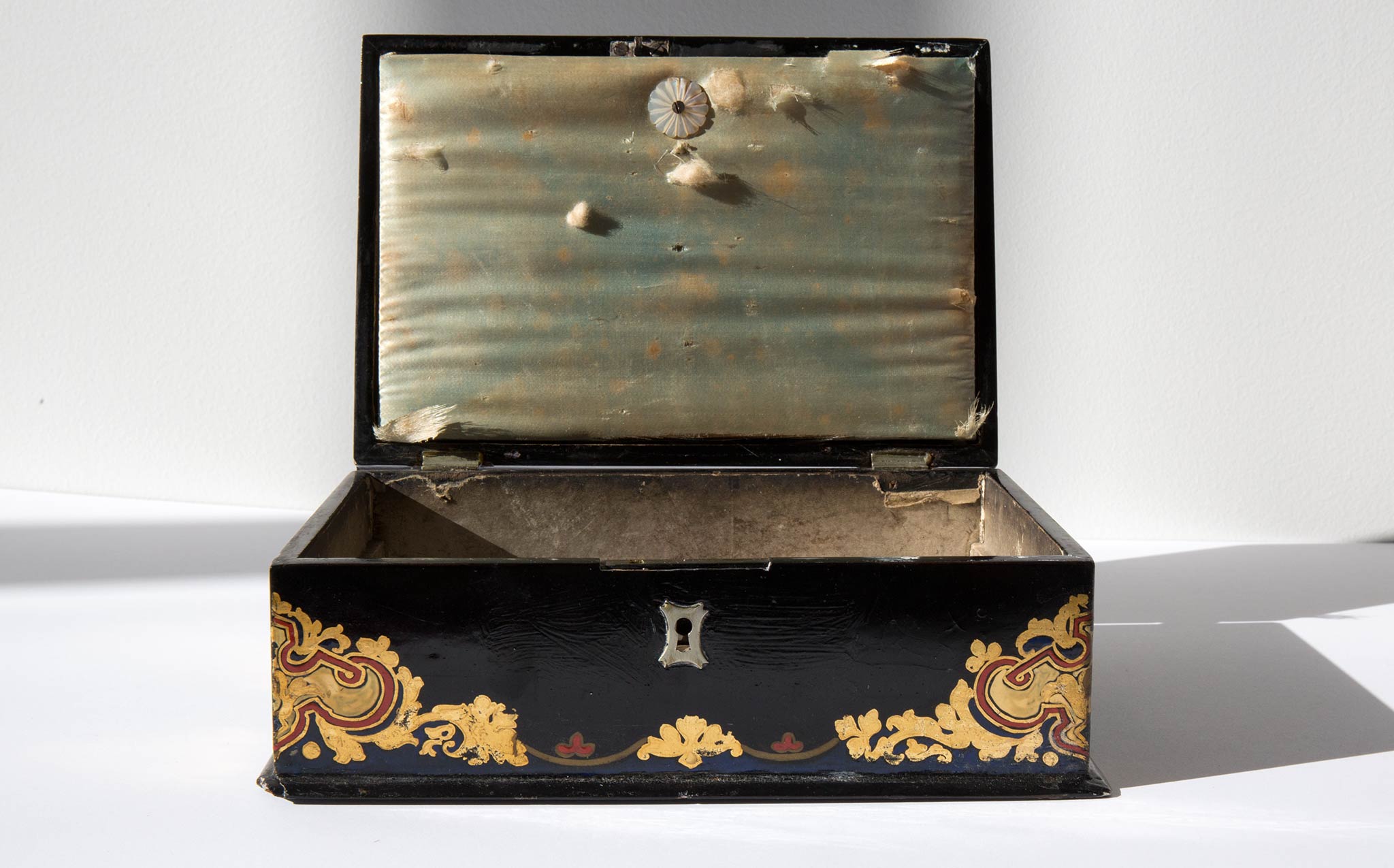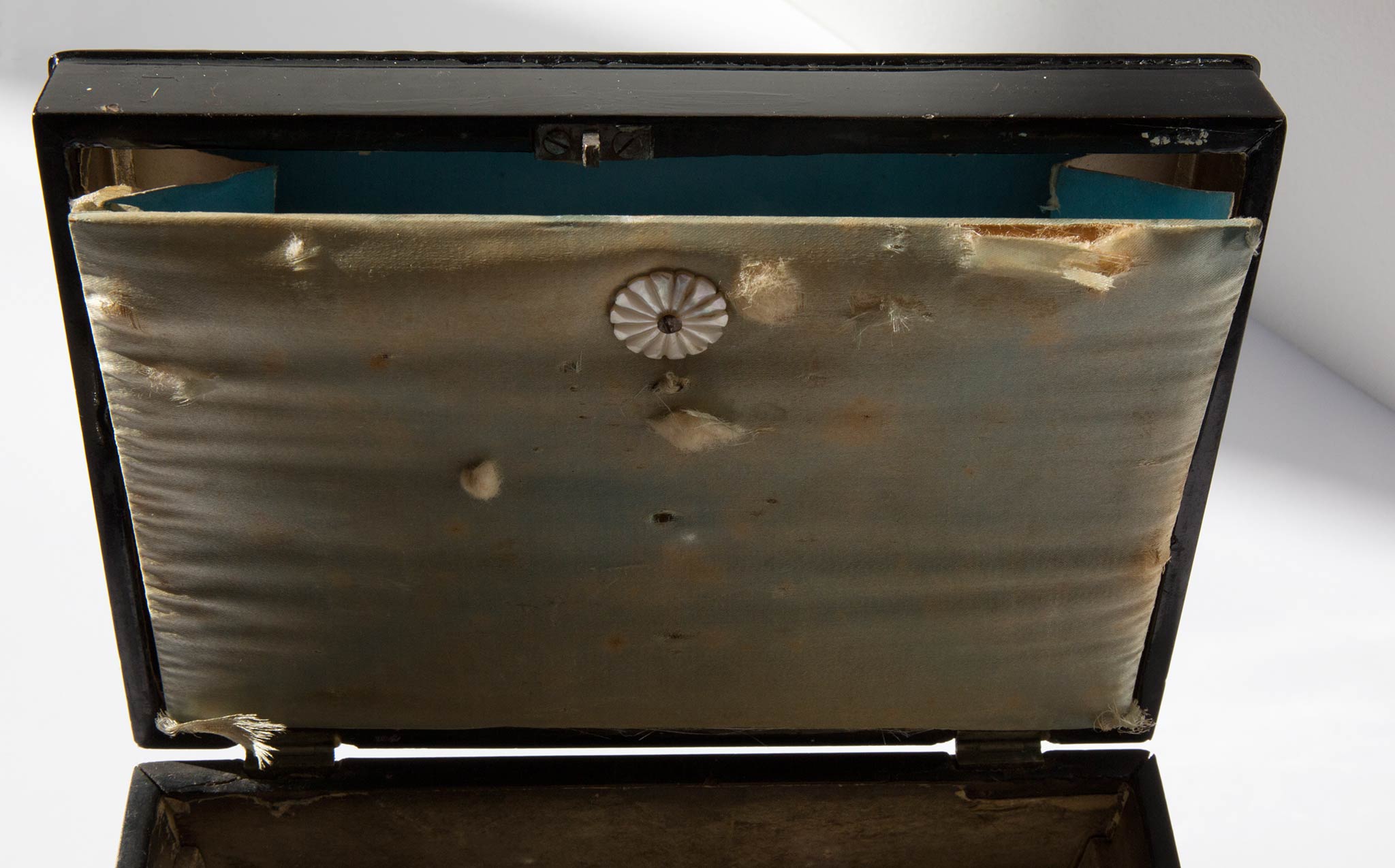 Gorgeous, hand painted Victorian paper mache box with abalone and mother-of-pearl inlay.