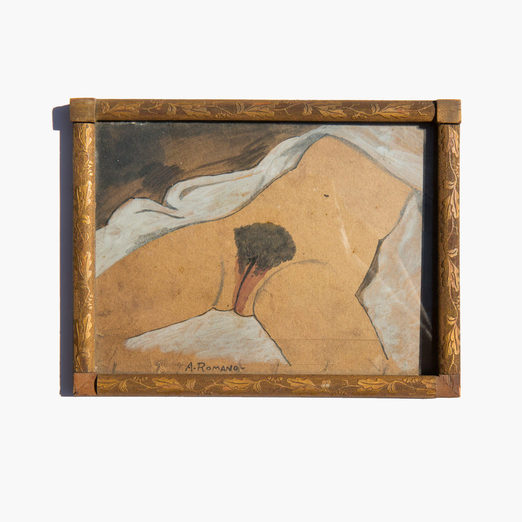 Influenced by Man Ray, Giorgio De Chirico, the Italian Futurists, Paul Delvaux and Rene Magritte, Romano had a contemporary style that was reminiscent of a bygone era. “I am looking at the future,” explained the artist, “but am fascinated with the past.” Incorporating a background in fresco painting, Romano used colors and imagery from the past to inform his unique style. The artist worked with inks and dyes, often of his own formula, and with emulsions that he created over the years, handed down by his ancestors. He applied his fresco and inks to the backsides of “found” canvases and discarded paintings and built each work around an antique frame that he hand selected to be part of the work itself. If there was a chip or a crack, Romano felt that it only enhanced the painting and everything was left as it was found.
