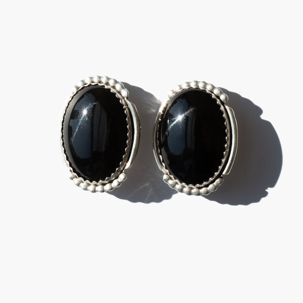 Indigenous American made sterling silver and onyx clip-on earrings. Many believe that onyx protects from harmful spirits and can prevent a spirit from draining your psychic energy. It is said to shield one against psychic attack by absorbing and transmuting negative energy, making it a particularly potent protection against black magic.