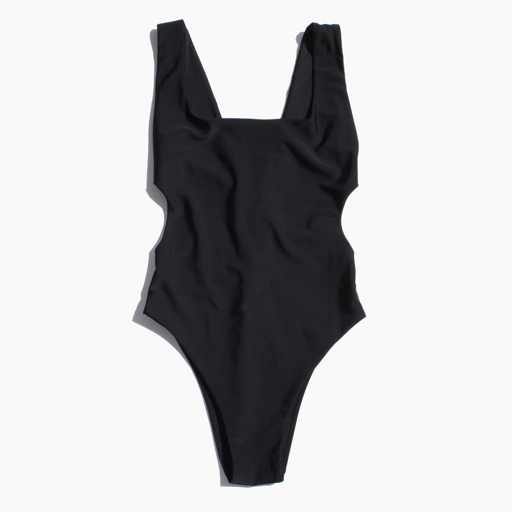 The Apricoss Alicia Swimsuit is a body contouring, one-piece swimsuit with side cut-outs and a lace-up back. A perfectly tailored suit that flatters the body and can easily double as apparel, especially paired with denim. Made from high quality, Italian, recycled nylon and polyester that is created from waste such as carpets, clothing, and fishing nets.