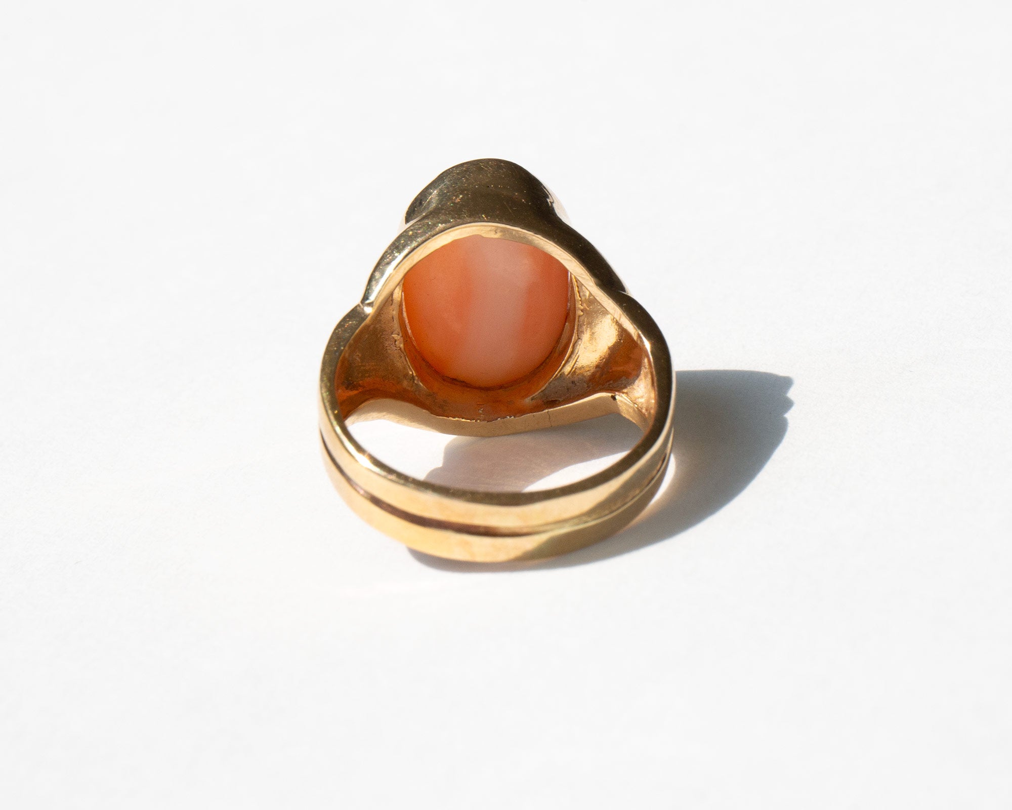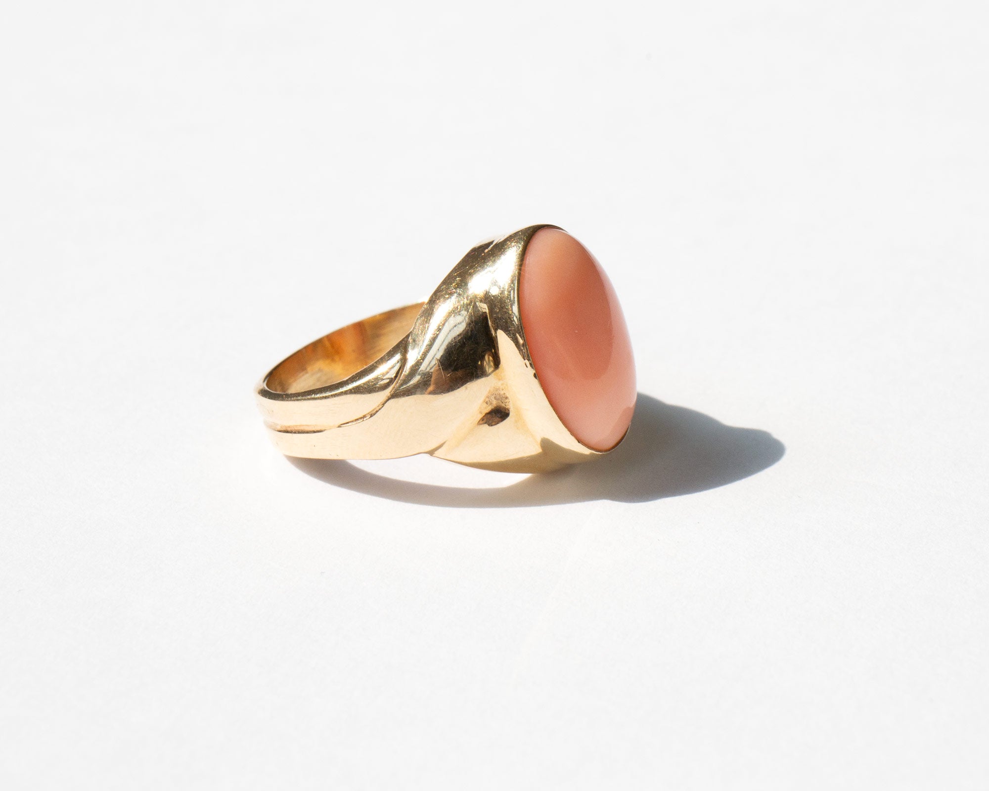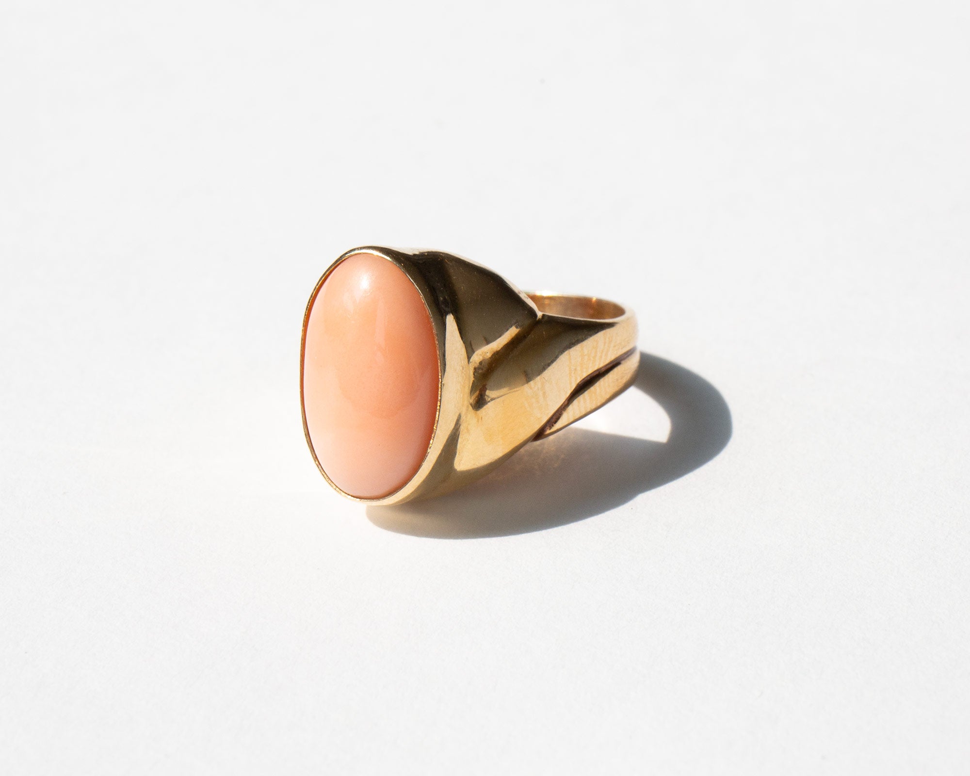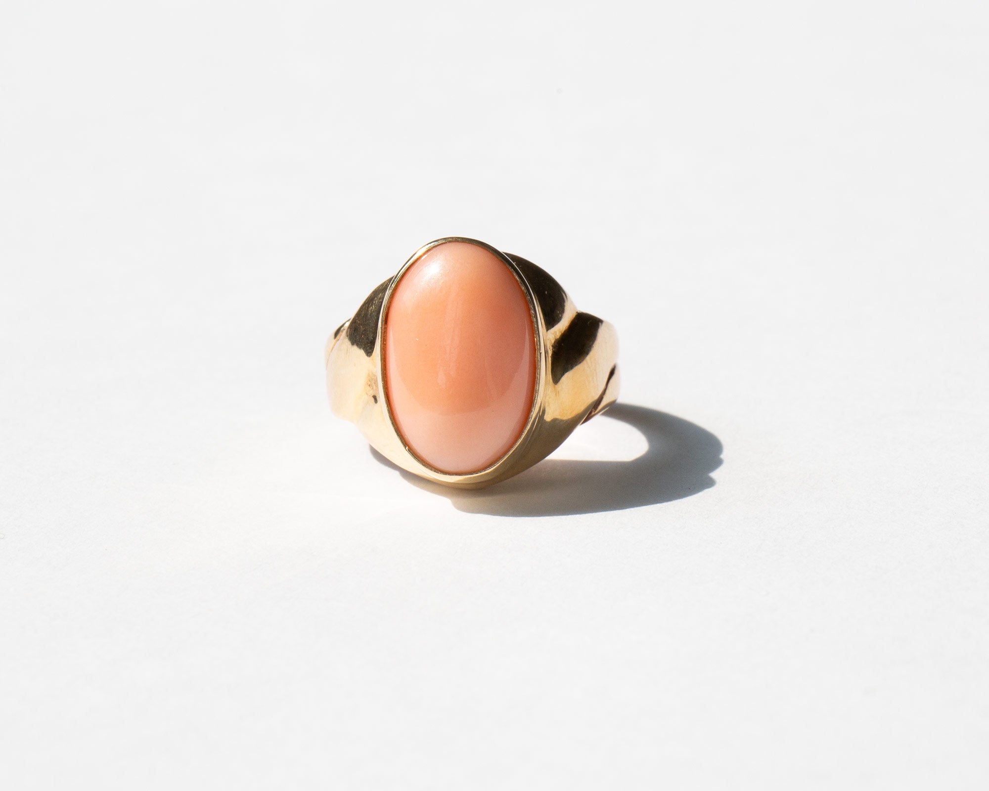 Elegant 14k gold and pink coral ring. During the Victorian period coral was given to children to protect them from becoming a changeling, a fairy child swapped and left in the place of a human child. Still thought to have protective powers, coral is said to guard against demonic powers, curses, and the destructive forces of the Evil Eye.
