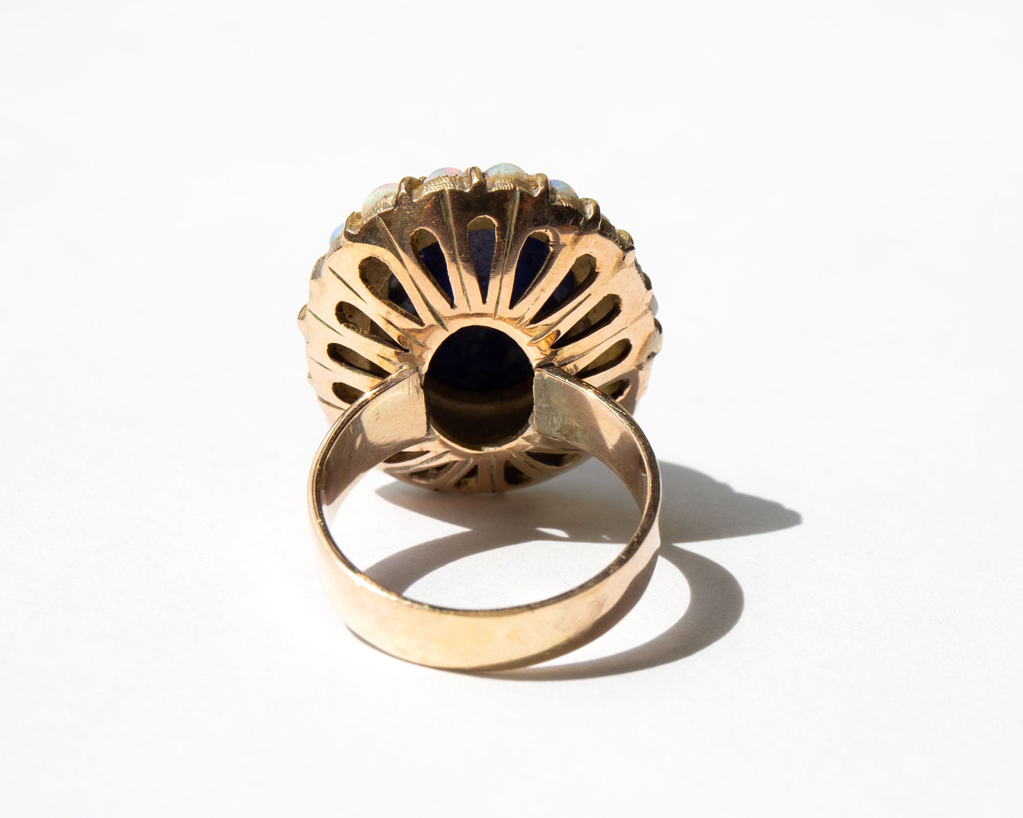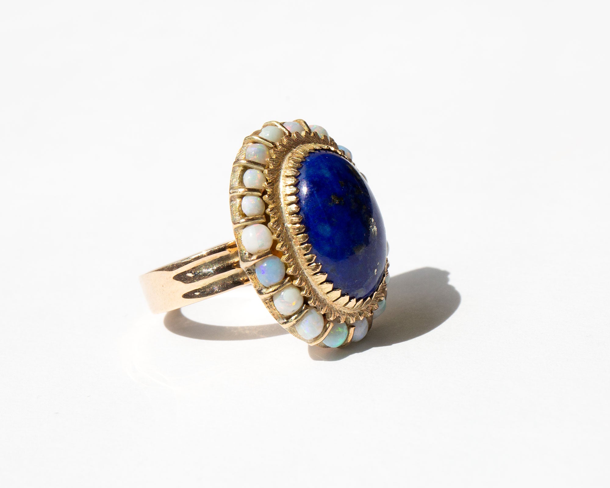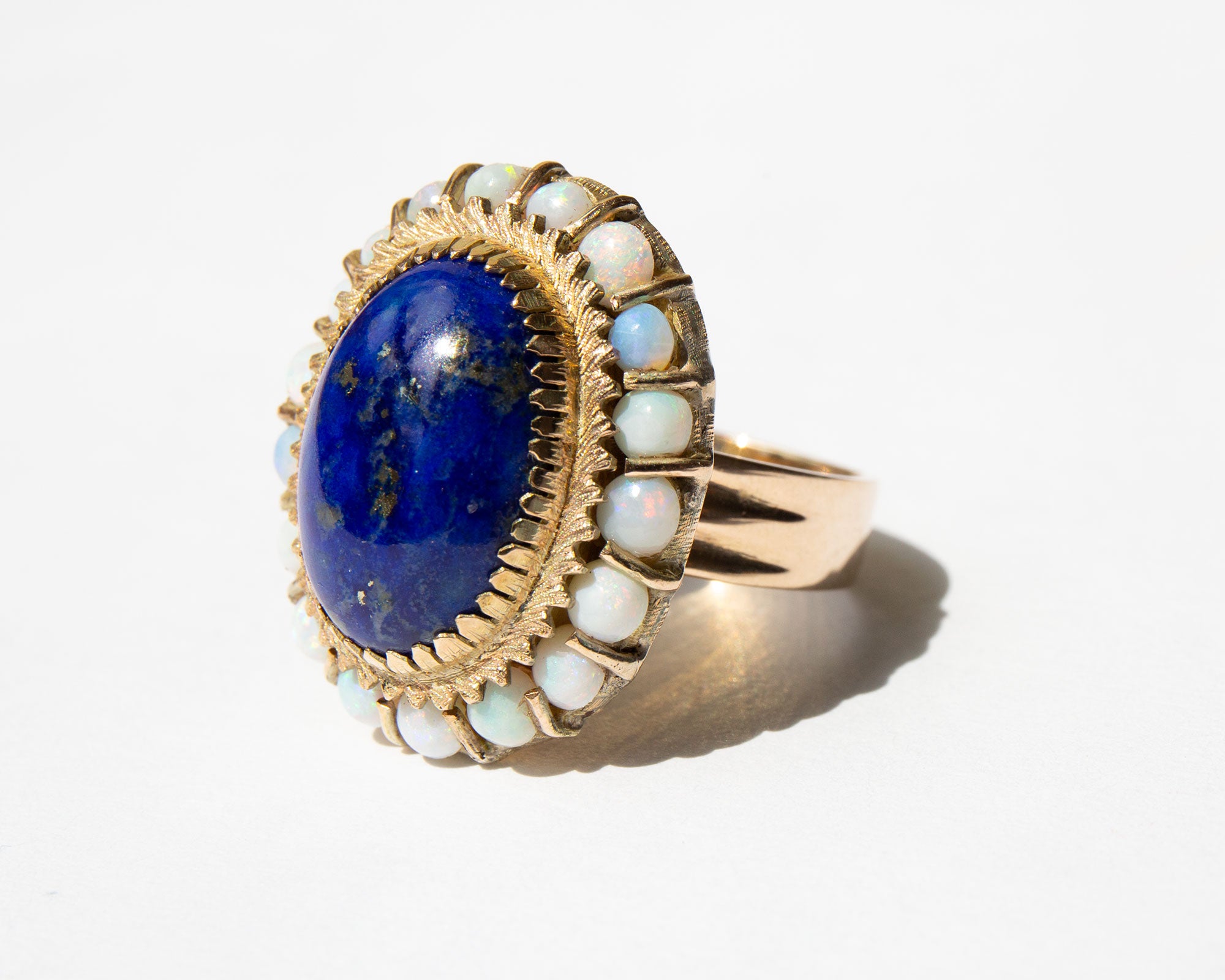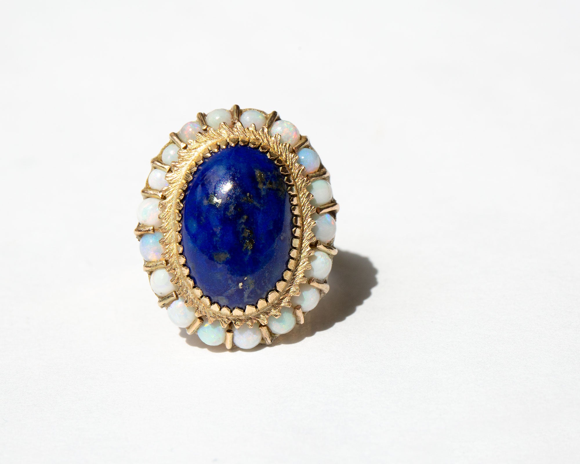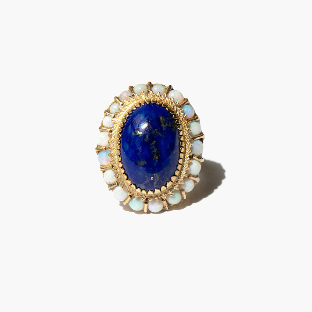 Gorgeous 14k gold setting with a large center lapis cabochon surrounded by pastel-hued opals. Lapis is thought to be protective against spirits of the darkness and all manner of evil but is also used to release stress and encourage peace and harmony.