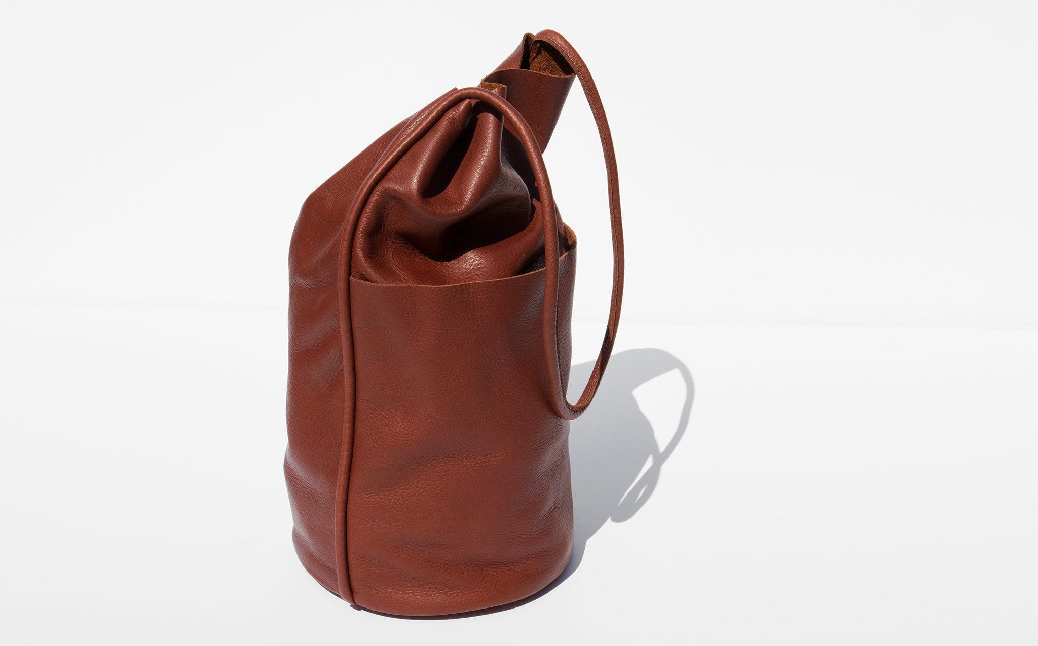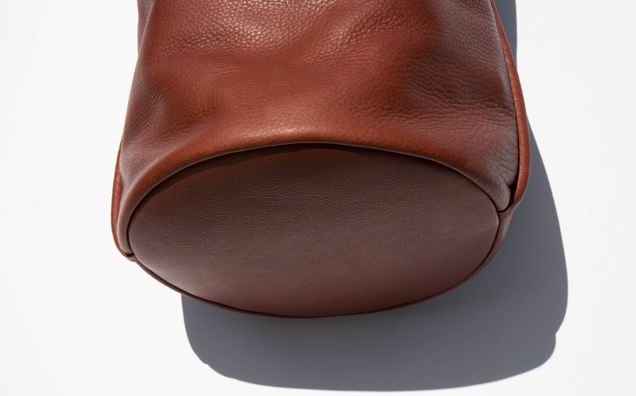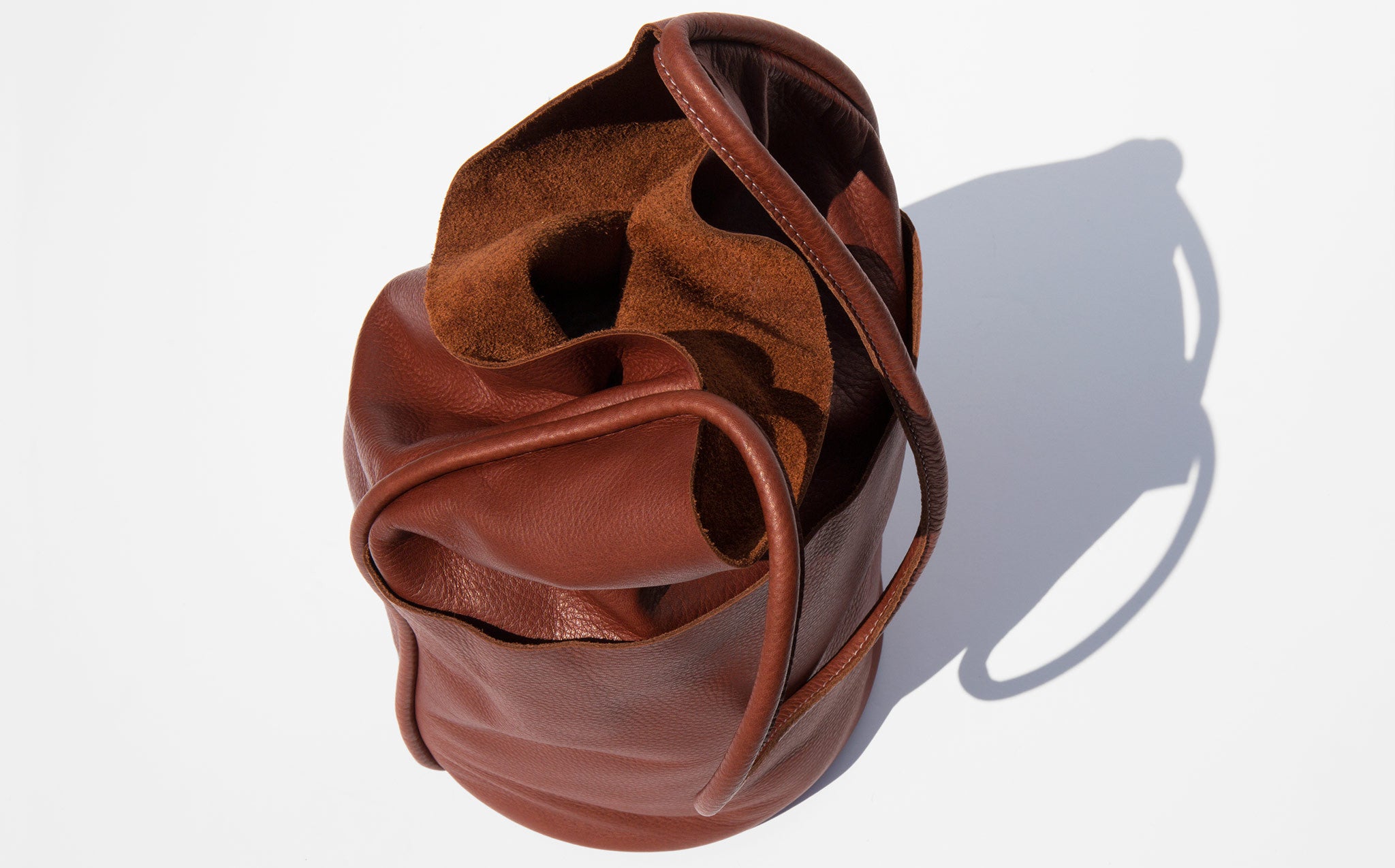 Minimal and relaxed circular bucket tote, made with untreated velvet-soft leather.