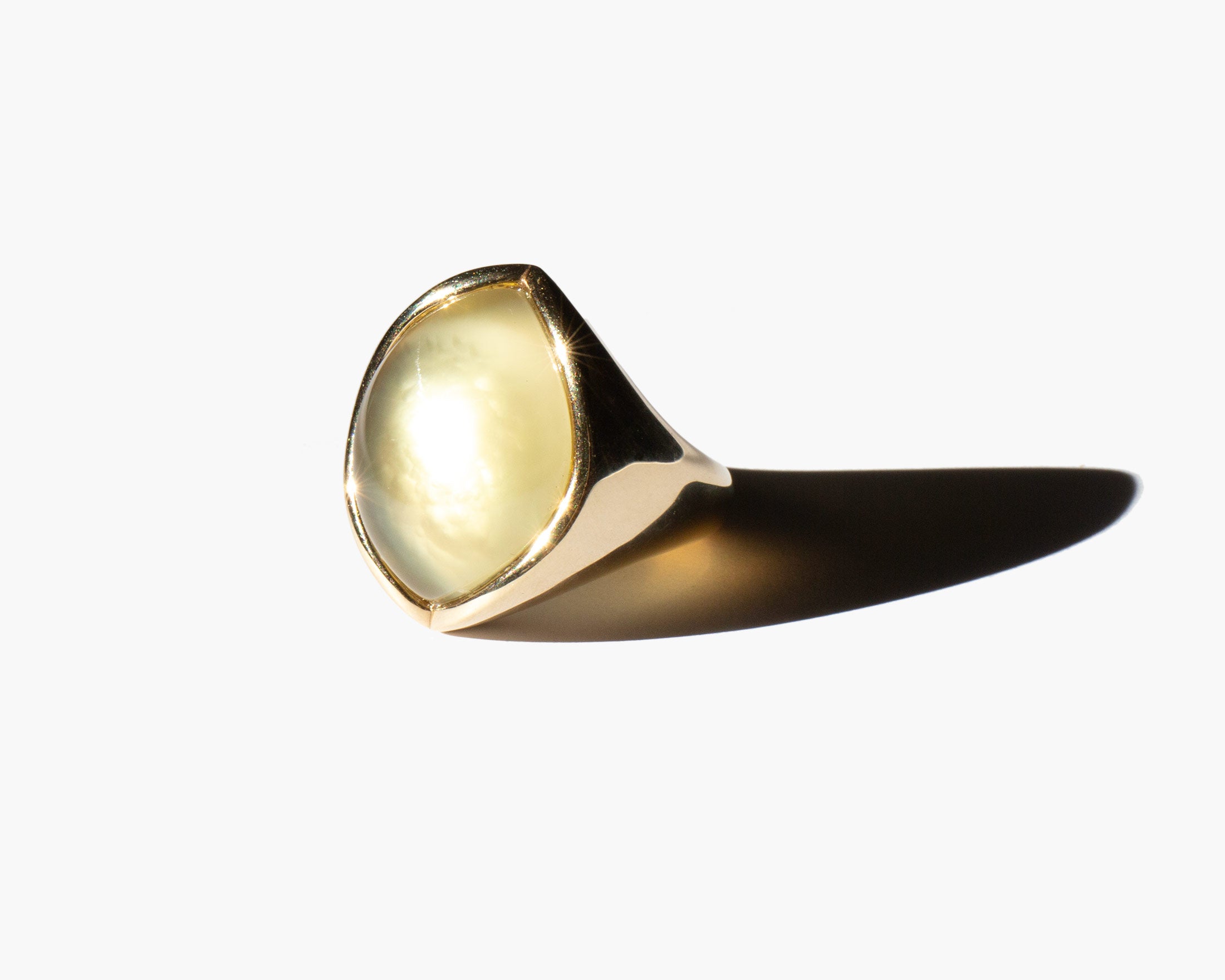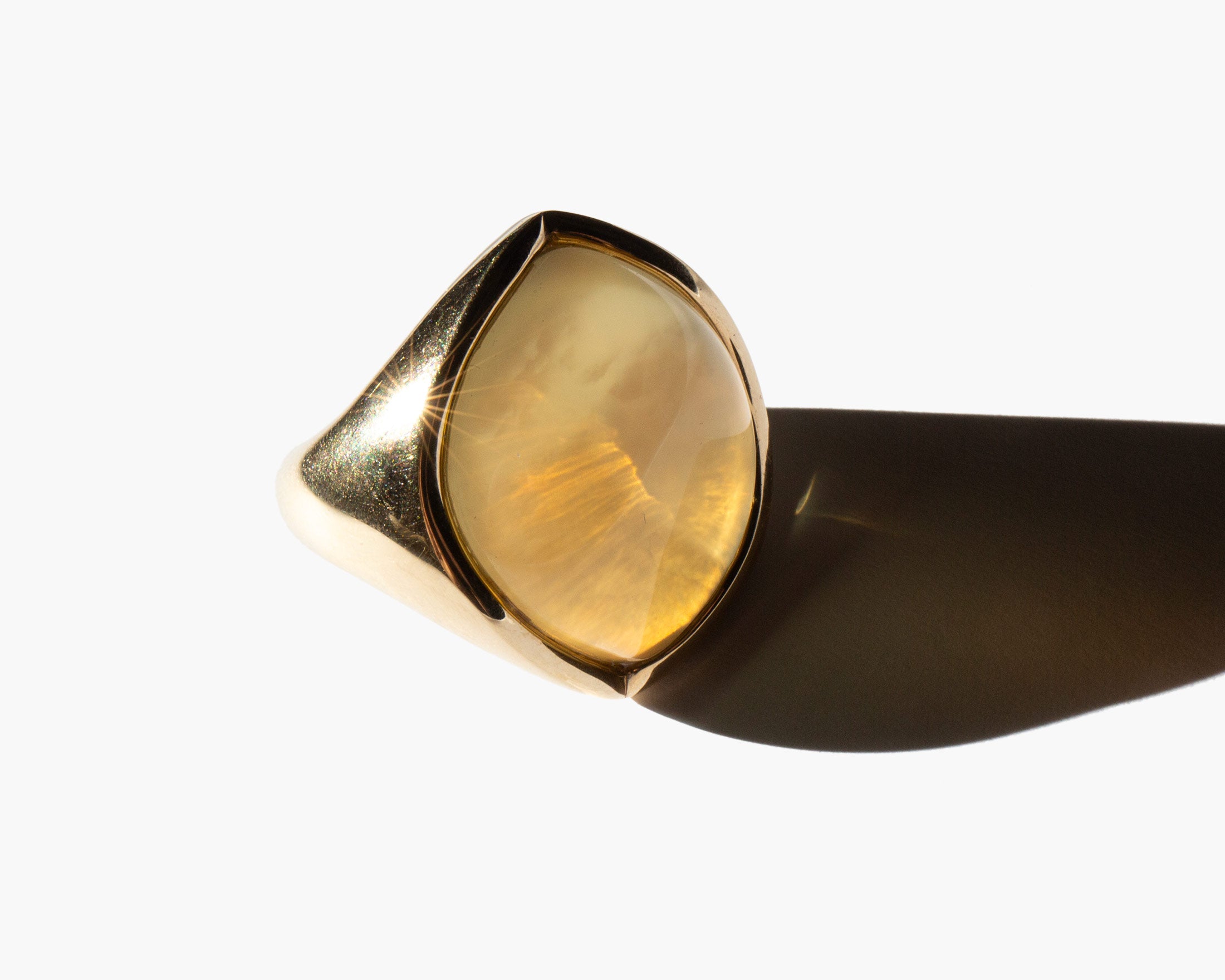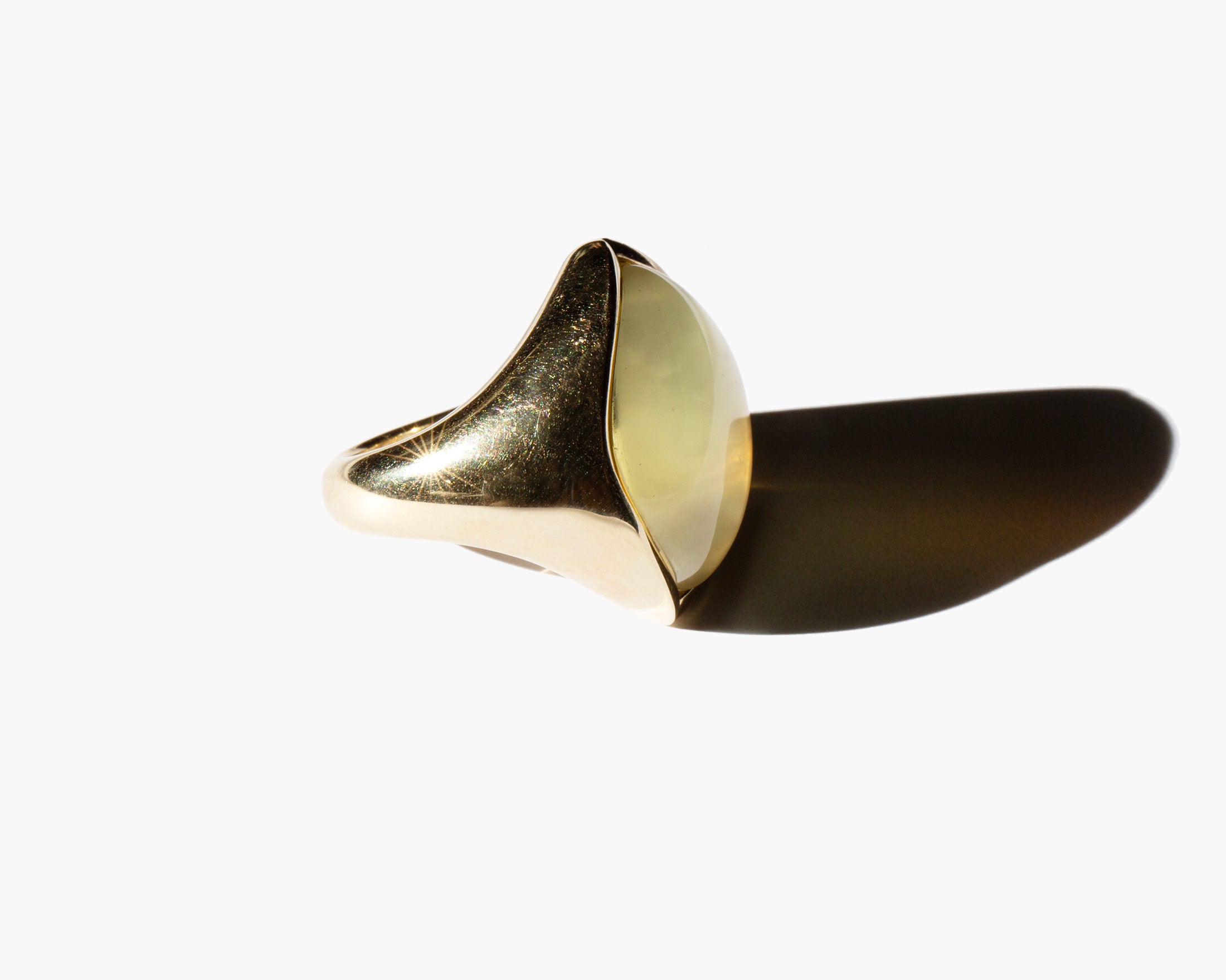 Ravishing 14k gold ring with a large chalcedony stone. A stone of warmth and vitality, yellow chalcedony is said to radiate peace and harmony and repel negativity.