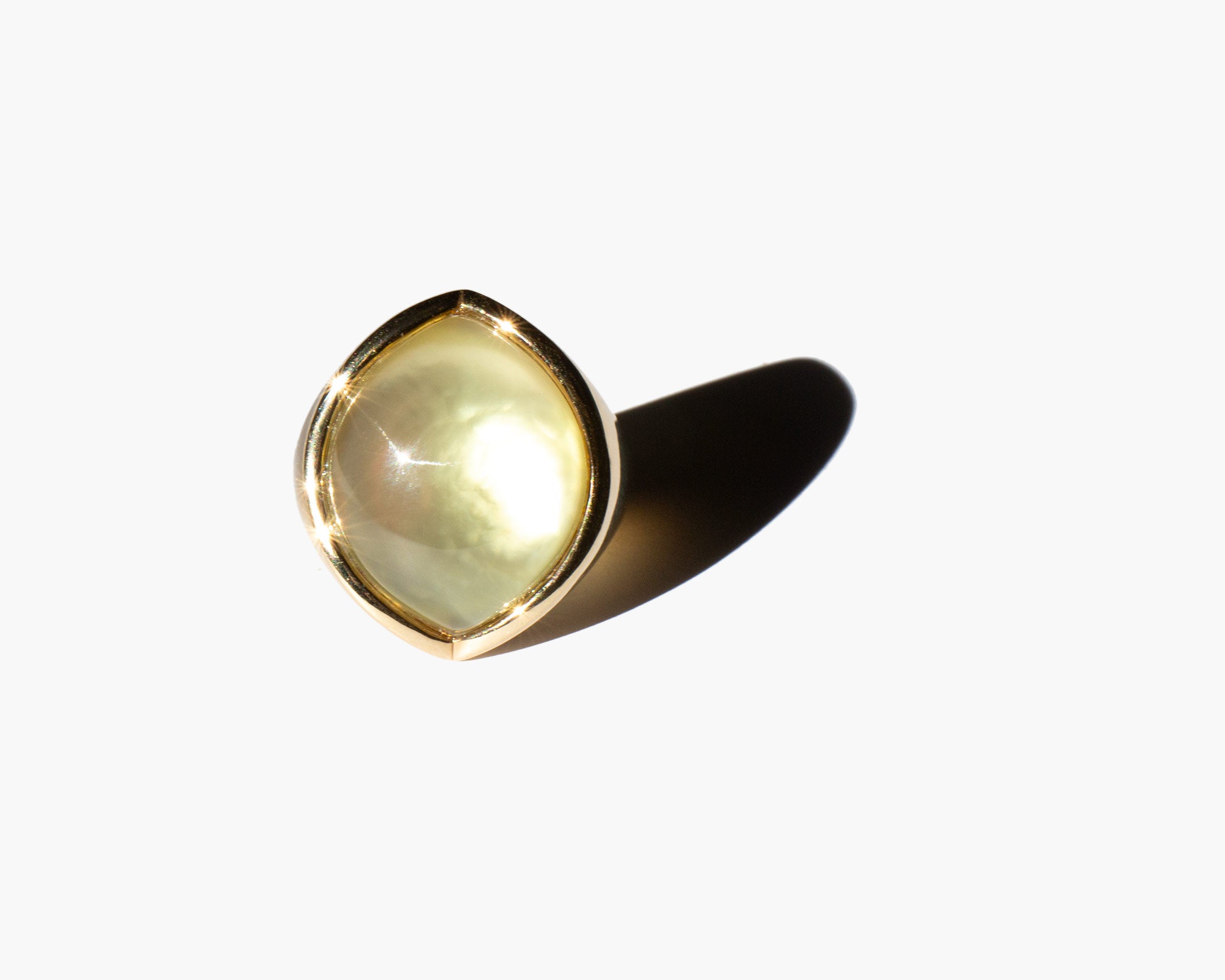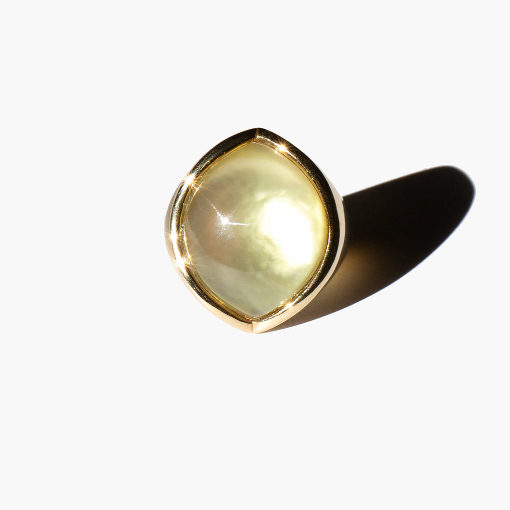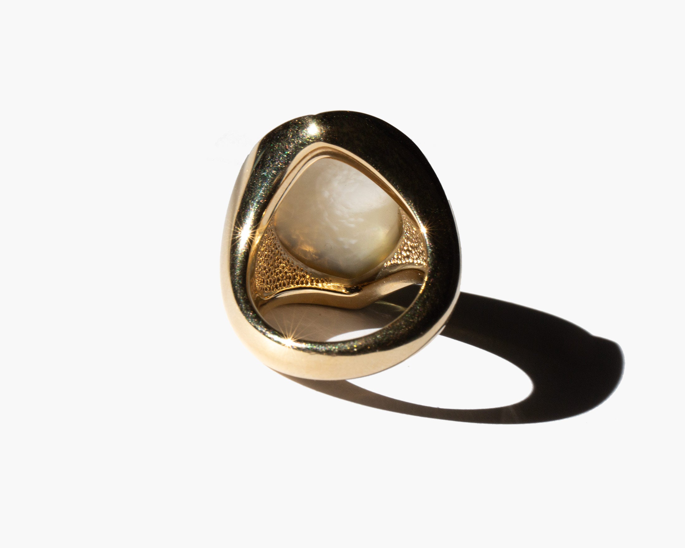 Ravishing 14k gold ring with a large chalcedony stone. A stone of warmth and vitality, yellow chalcedony is said to radiate peace and harmony and repel negativity.