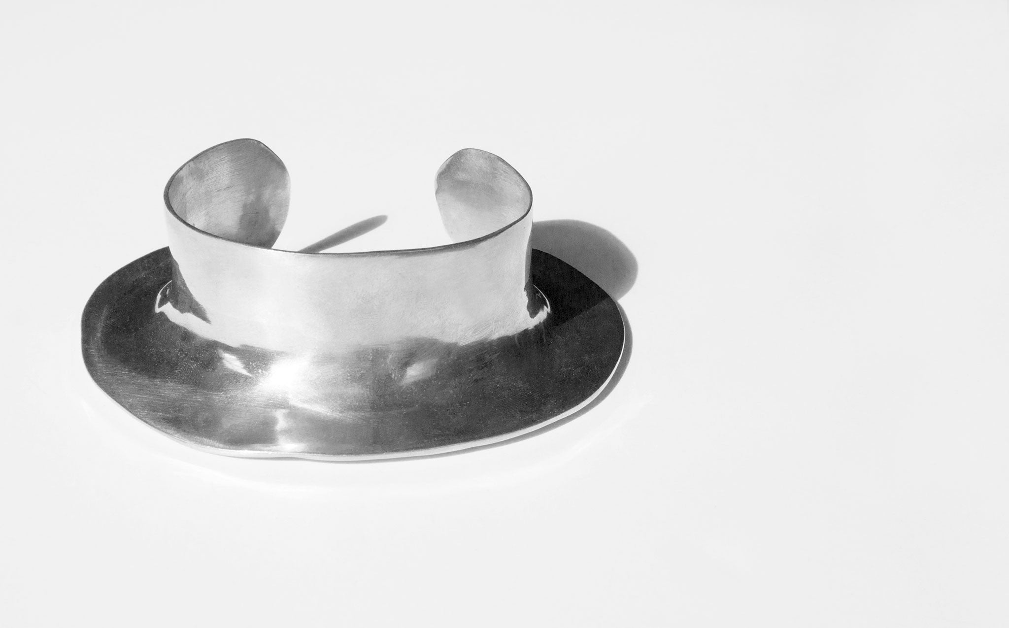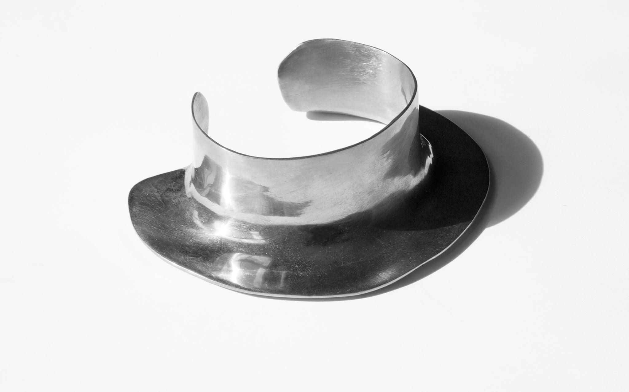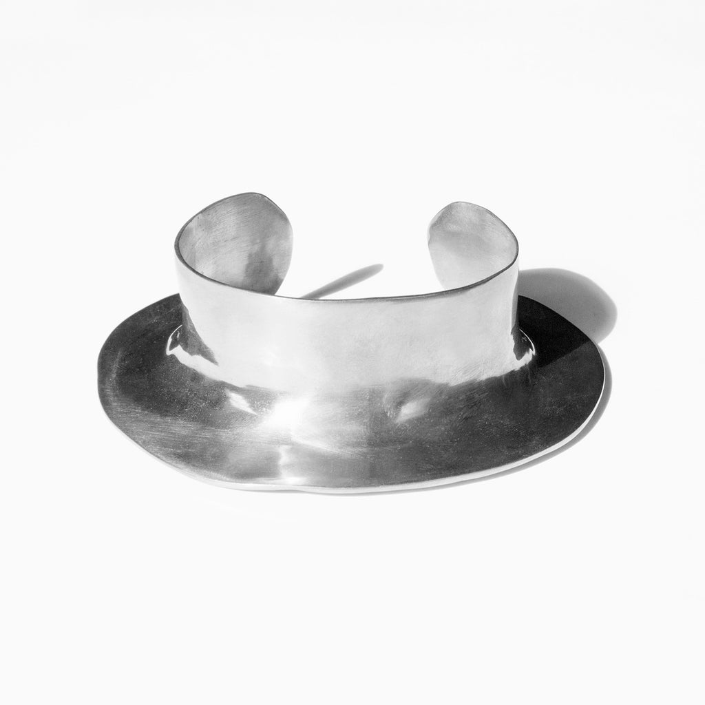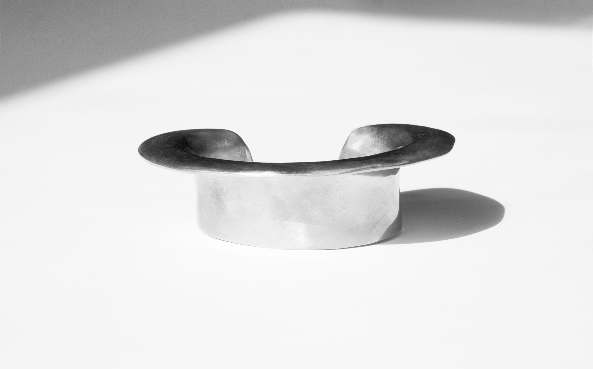Statement fanning cuff based on primitive tribal jewelry. Made with solid, rough cut sterling silver.
