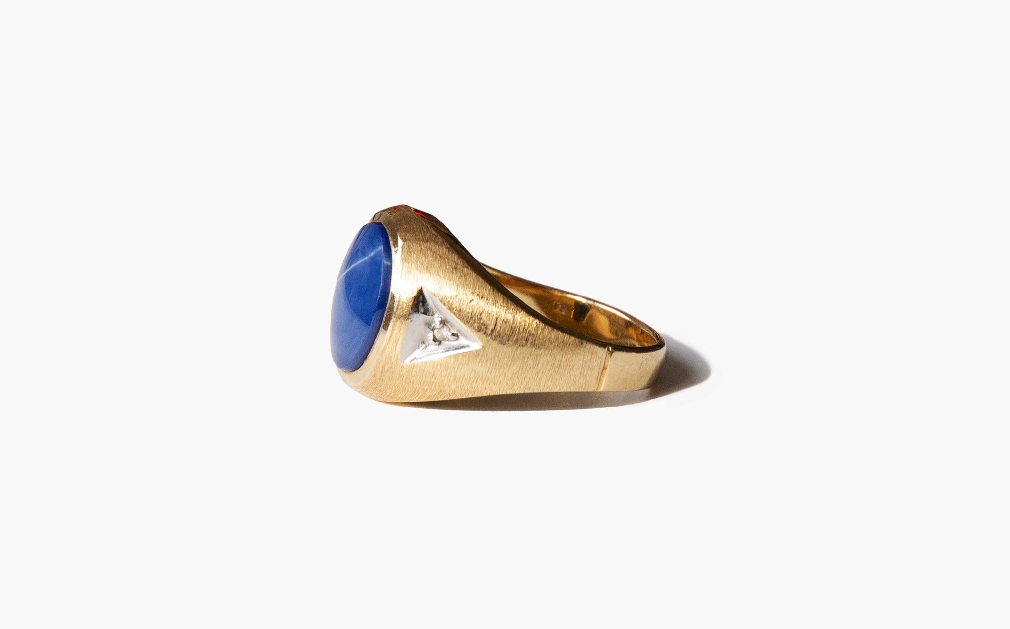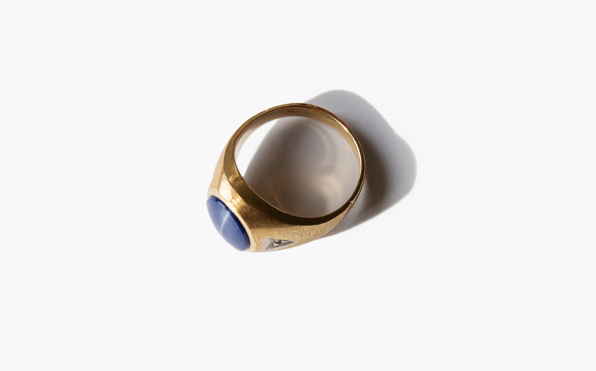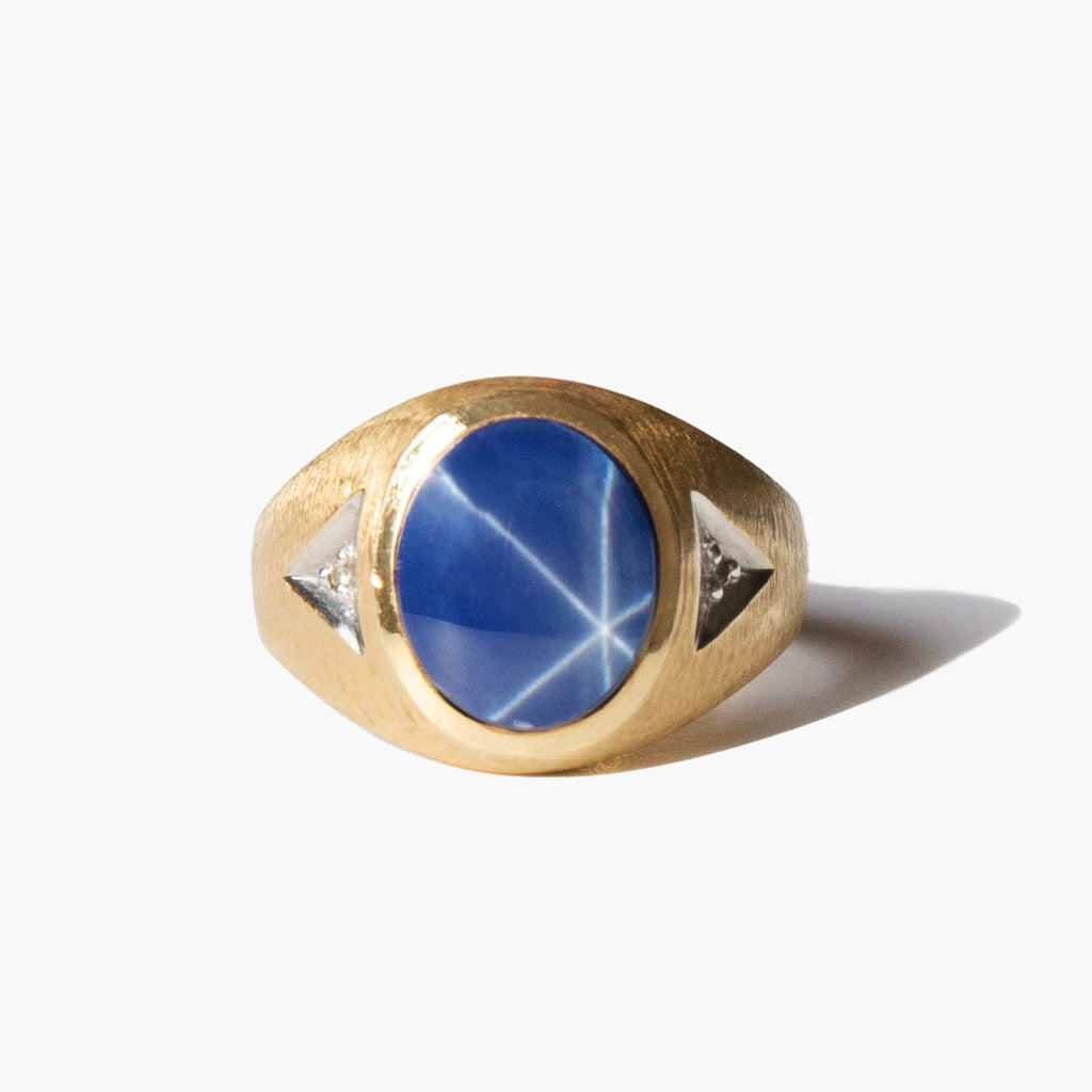 Brilliant blue star sapphire set in 14k gold with two tiny accent diamonds.
