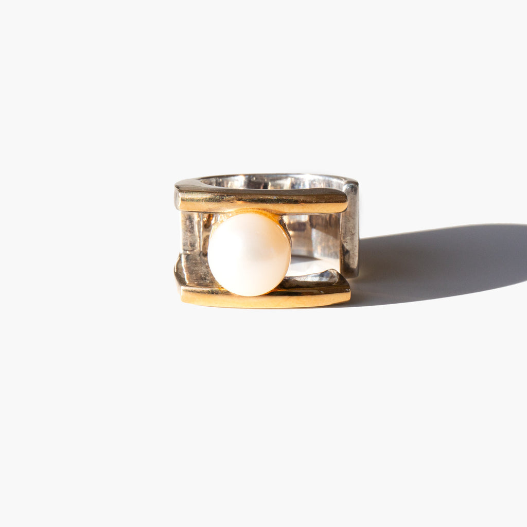 Geometric sterling silver ring with a large pearl and 14k gold accents.