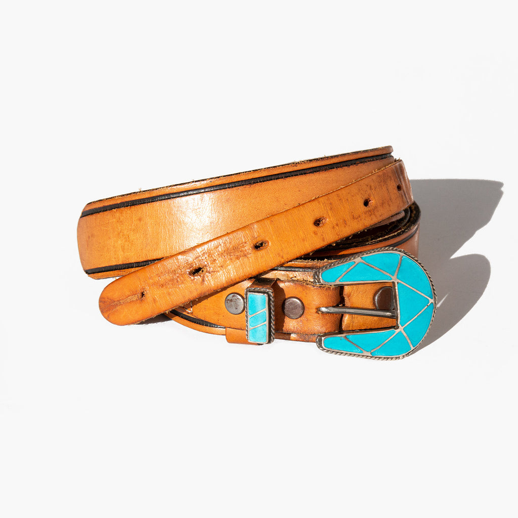 Vintage layered leather belt with a solid sterling silver and turquoise stone buckle.