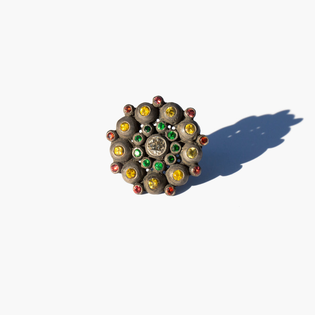 Artisan made ring of oxidized sterling silver and precious gems including diamonds, sapphires, and garnets.
