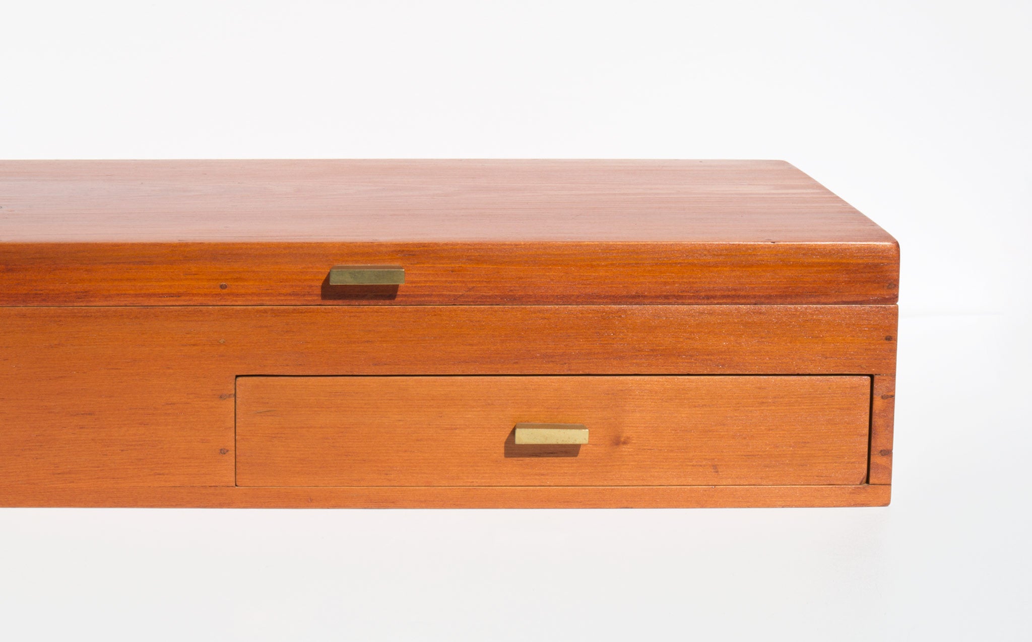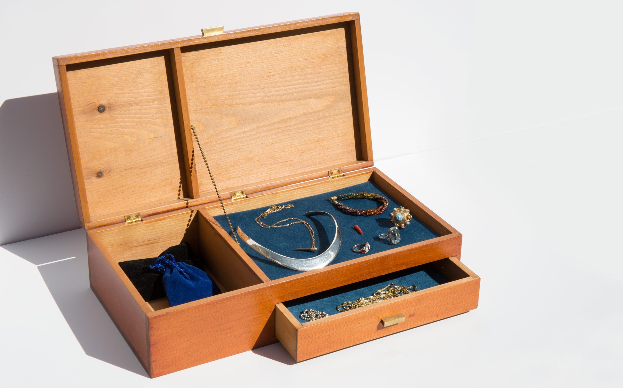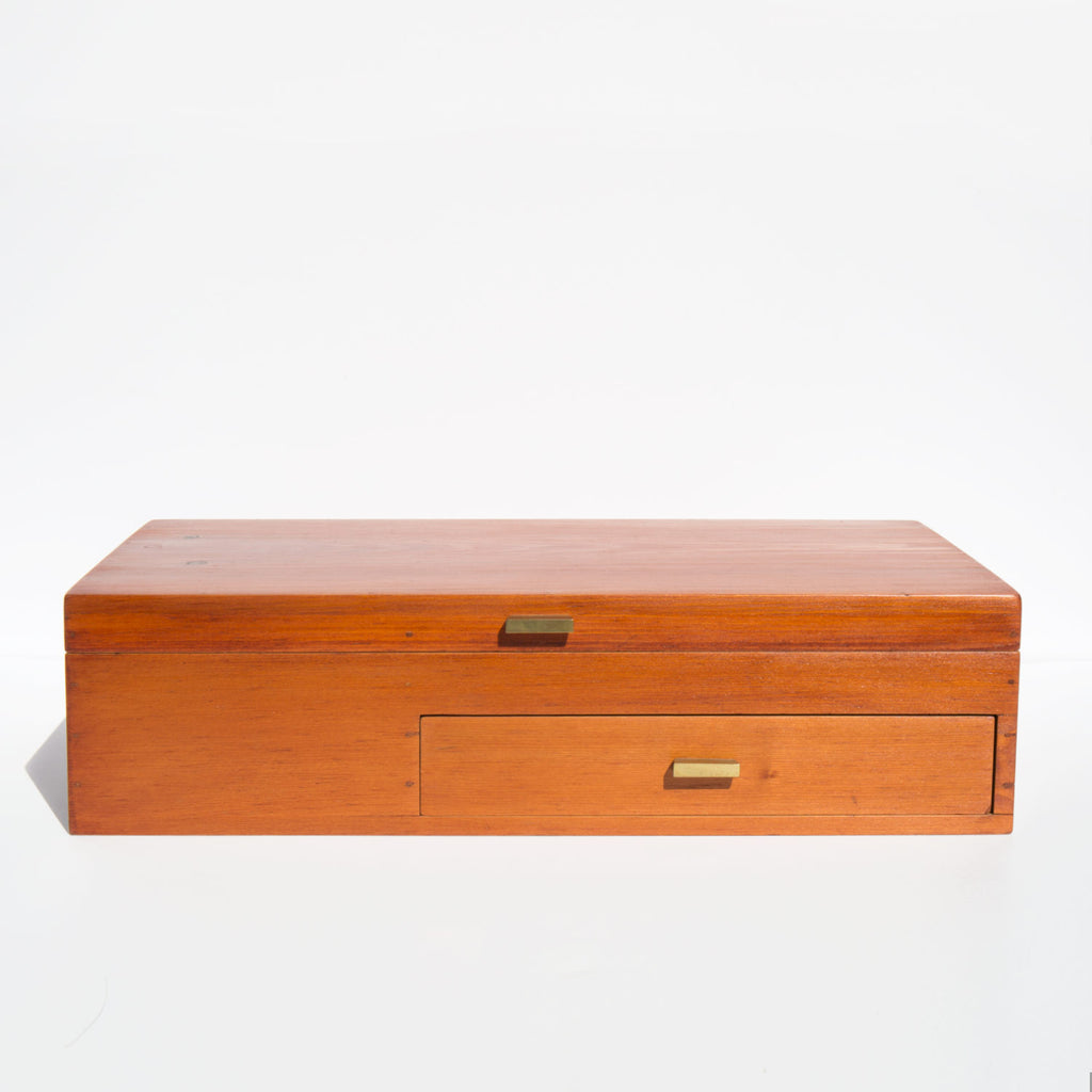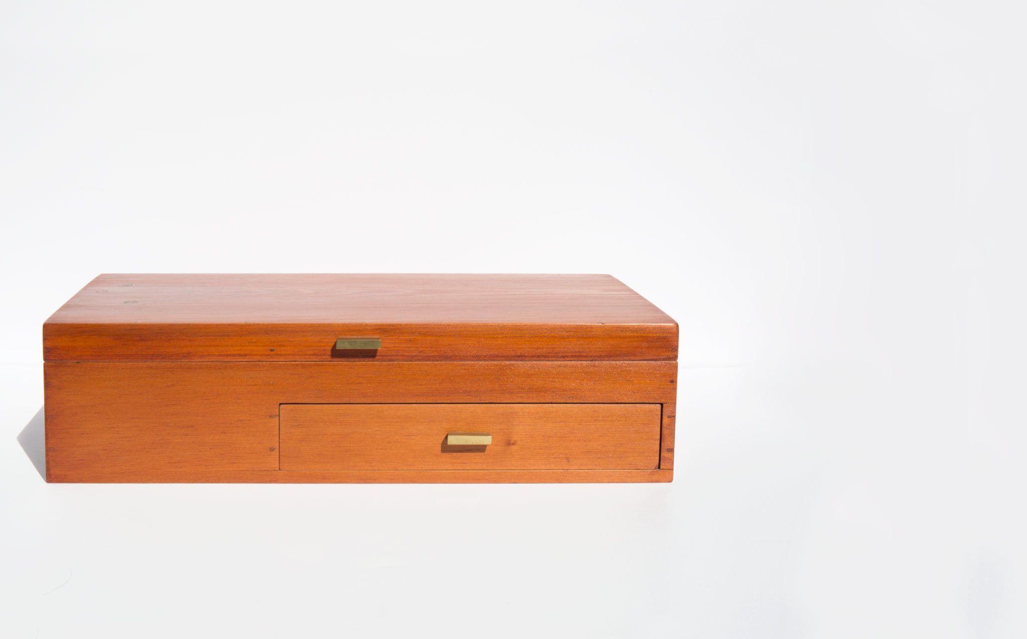 Solid pine jewelry box with brass hardware and velvet lined drawer. Hand refurbished in Pennsylvania.
