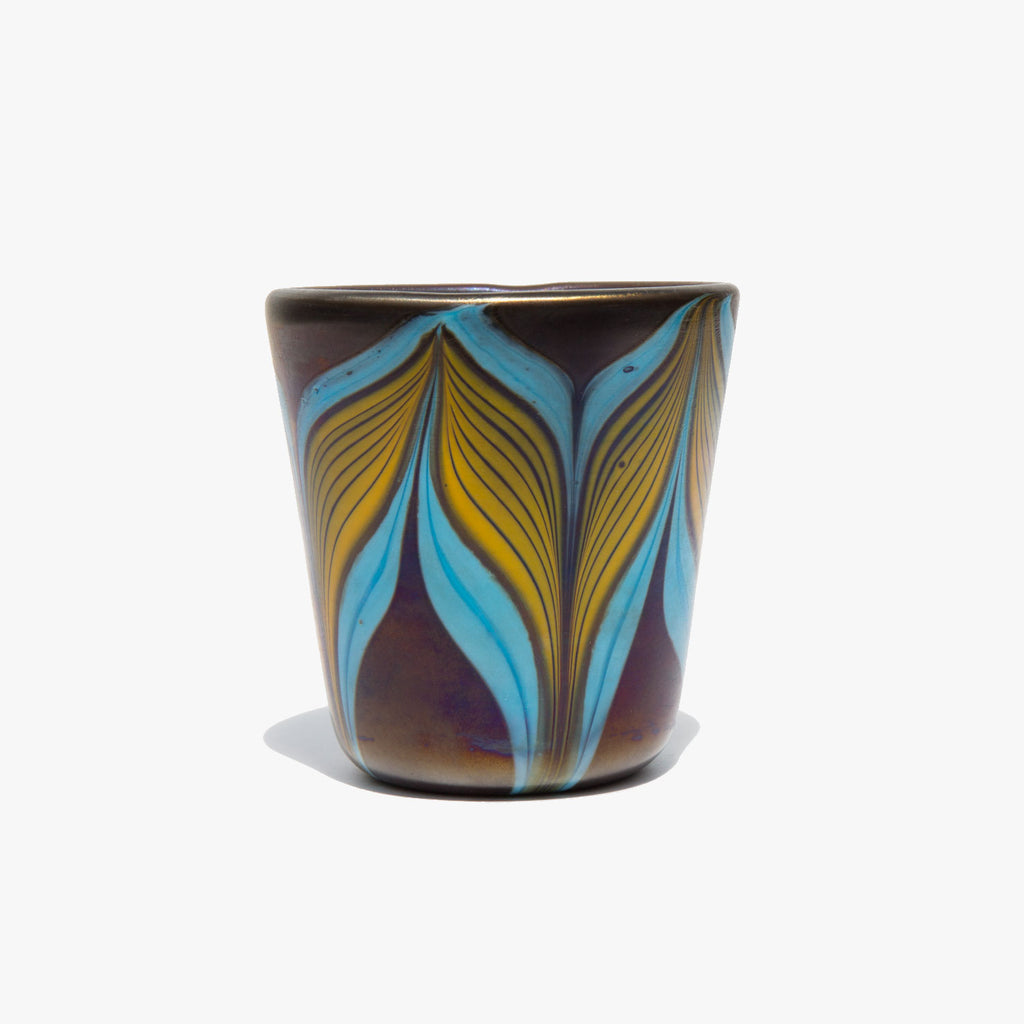 Signed iridescent art glass tumbler with swirls of ochre and sky.