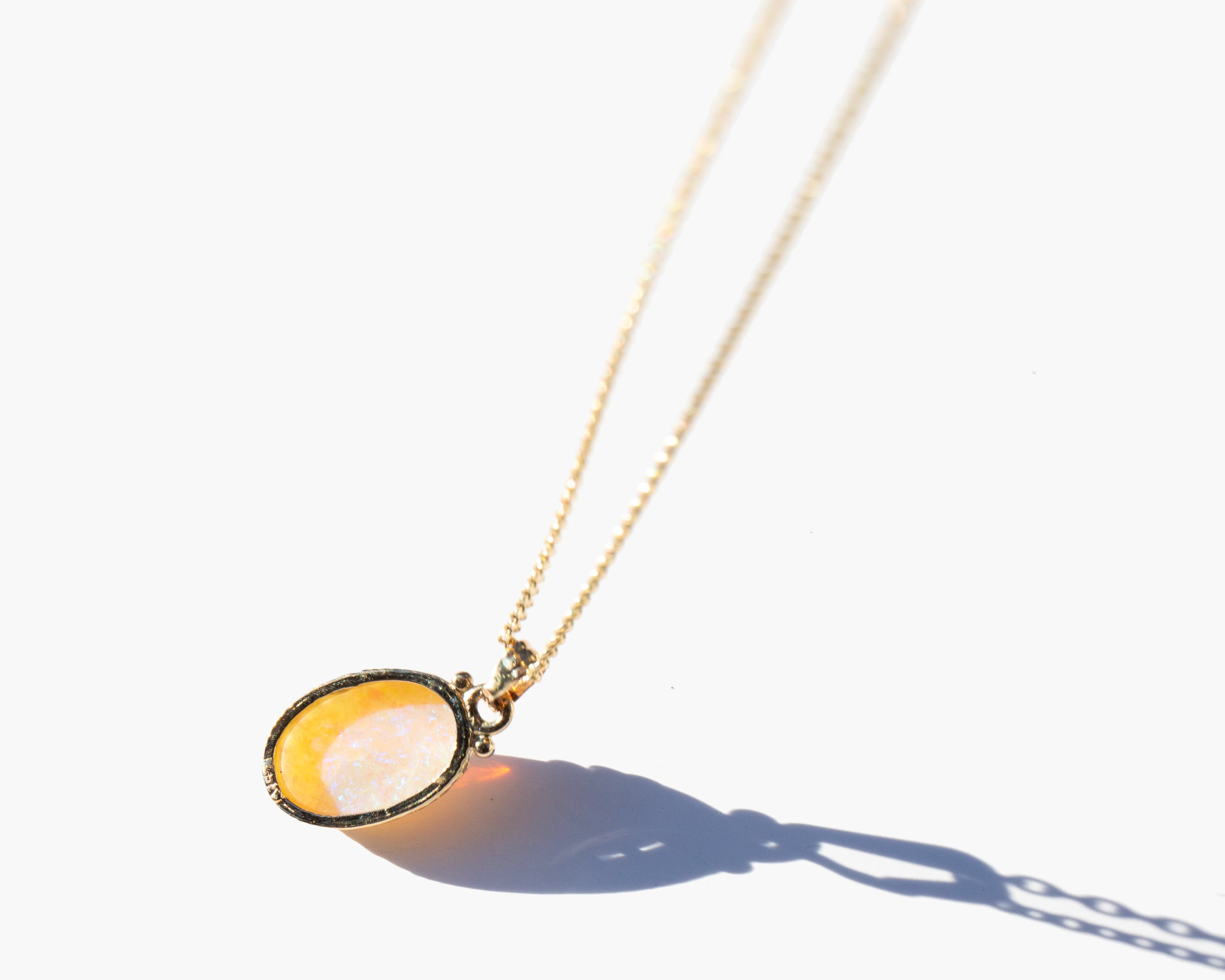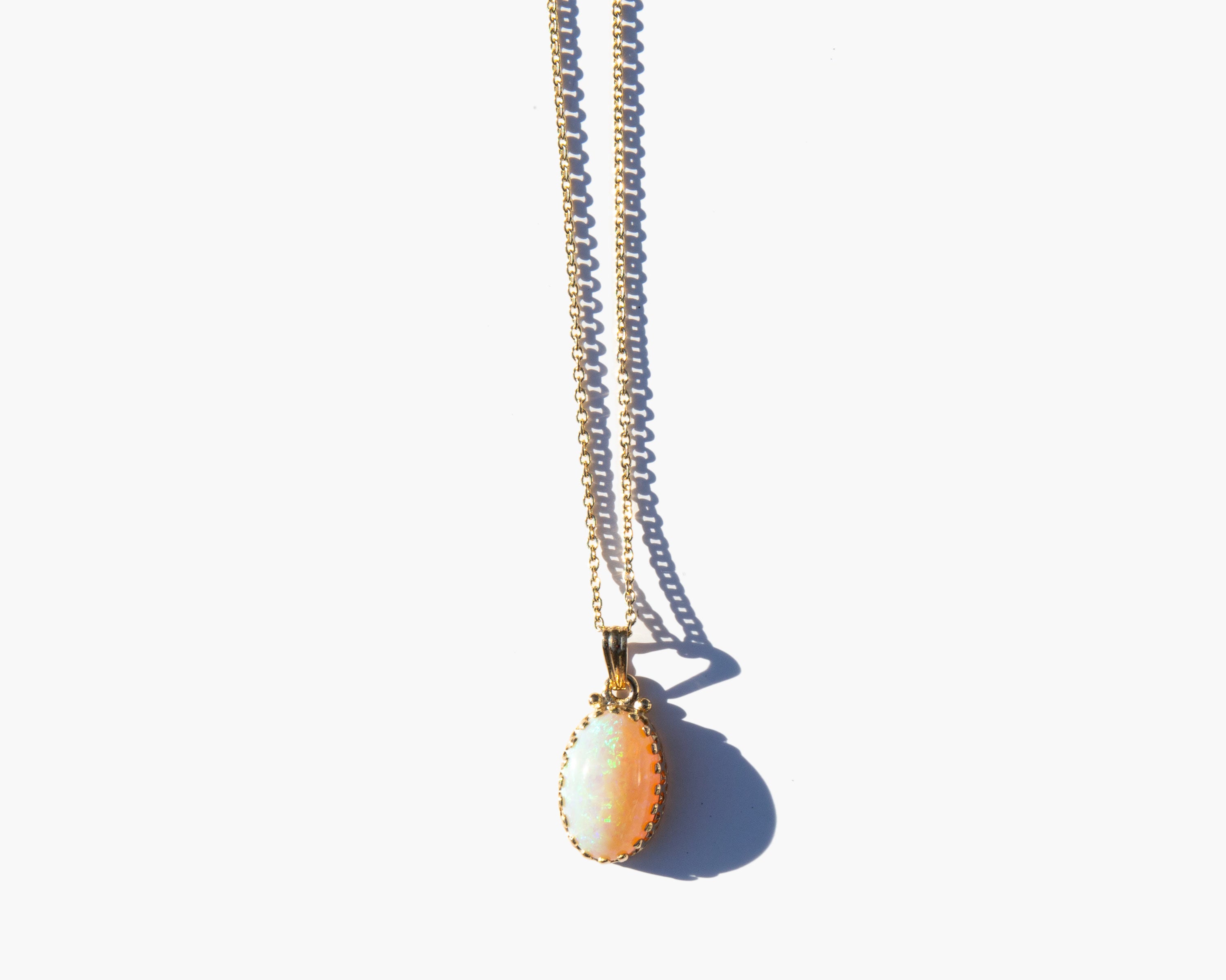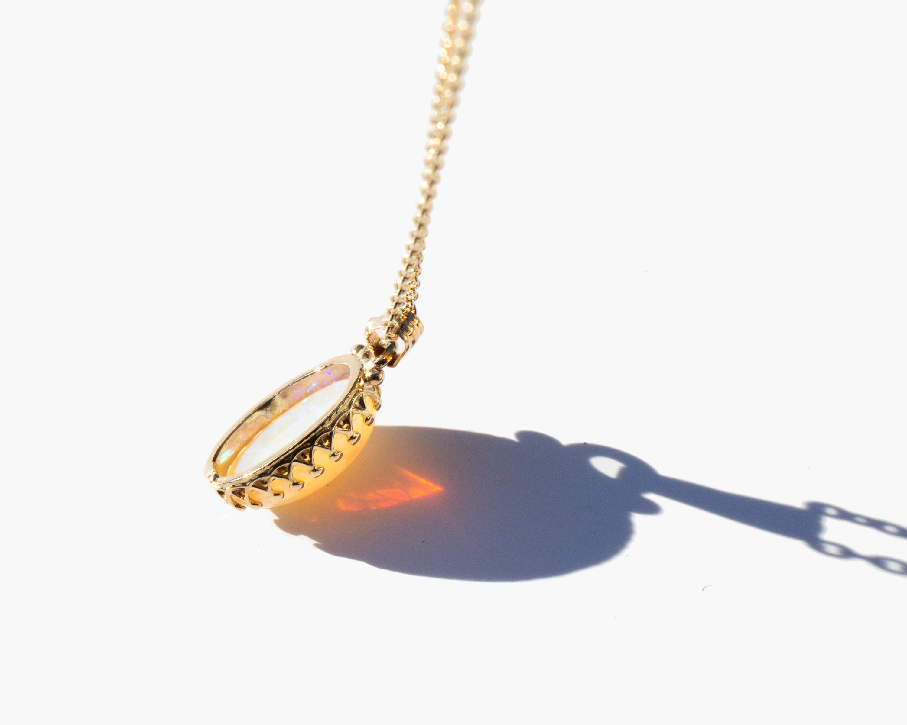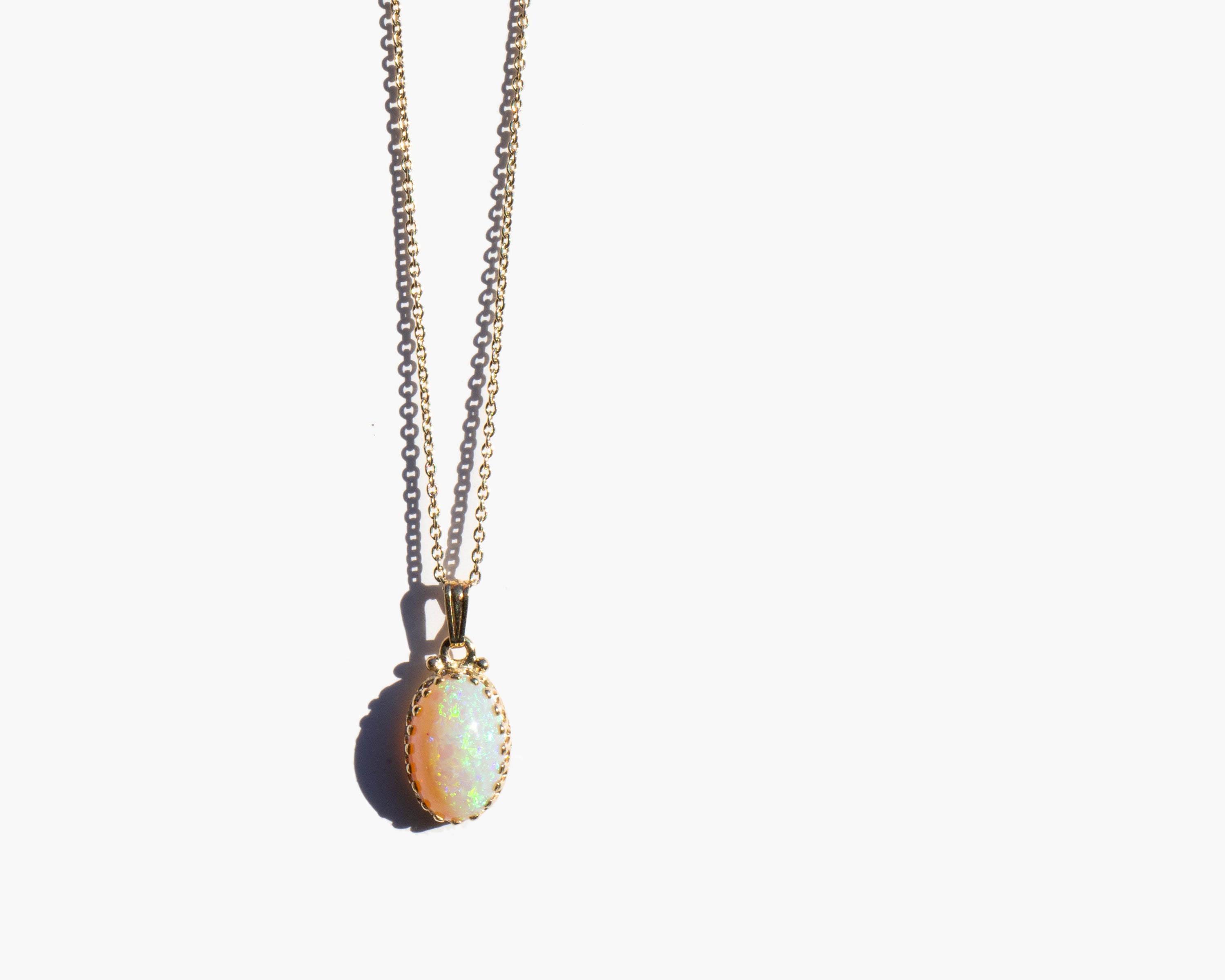 Elegant, petite opal and 14k gold pendant strung on a 14k gold chain. Throughout most of history, the opal has been regarded as the luckiest and most magical of all the gems because it embodies all of the colors in the visible spectrum. In ancient Rome, the gem symbolized love and hope. Arabic legends say it falls from the heavens in flashes of lightning. The ancient Greeks believed opals were the tears of Zeus and would impart them with the gift of prophecy and protect them from disease. During the middle ages opals were thought to have the power to preserve the life and color of blond hair. In Europe, the monarchs wore opals in crowns and necklaces as symbols of hope, purity and truth.