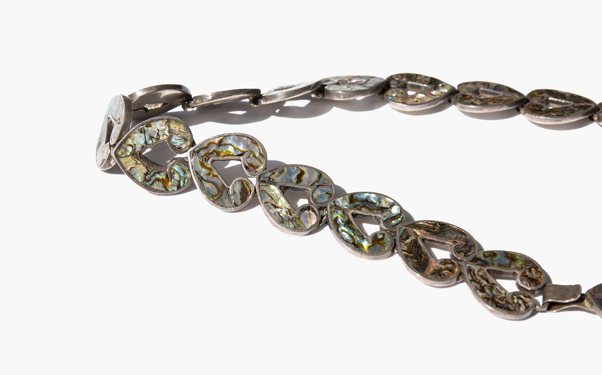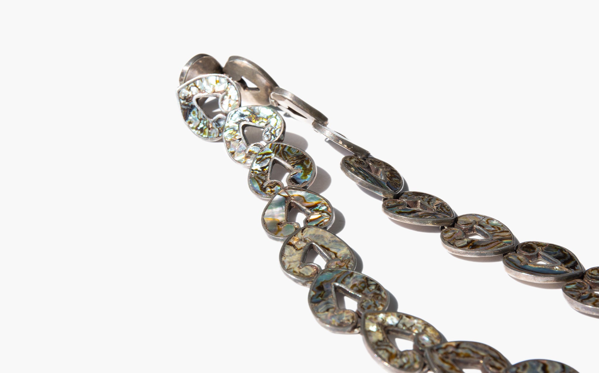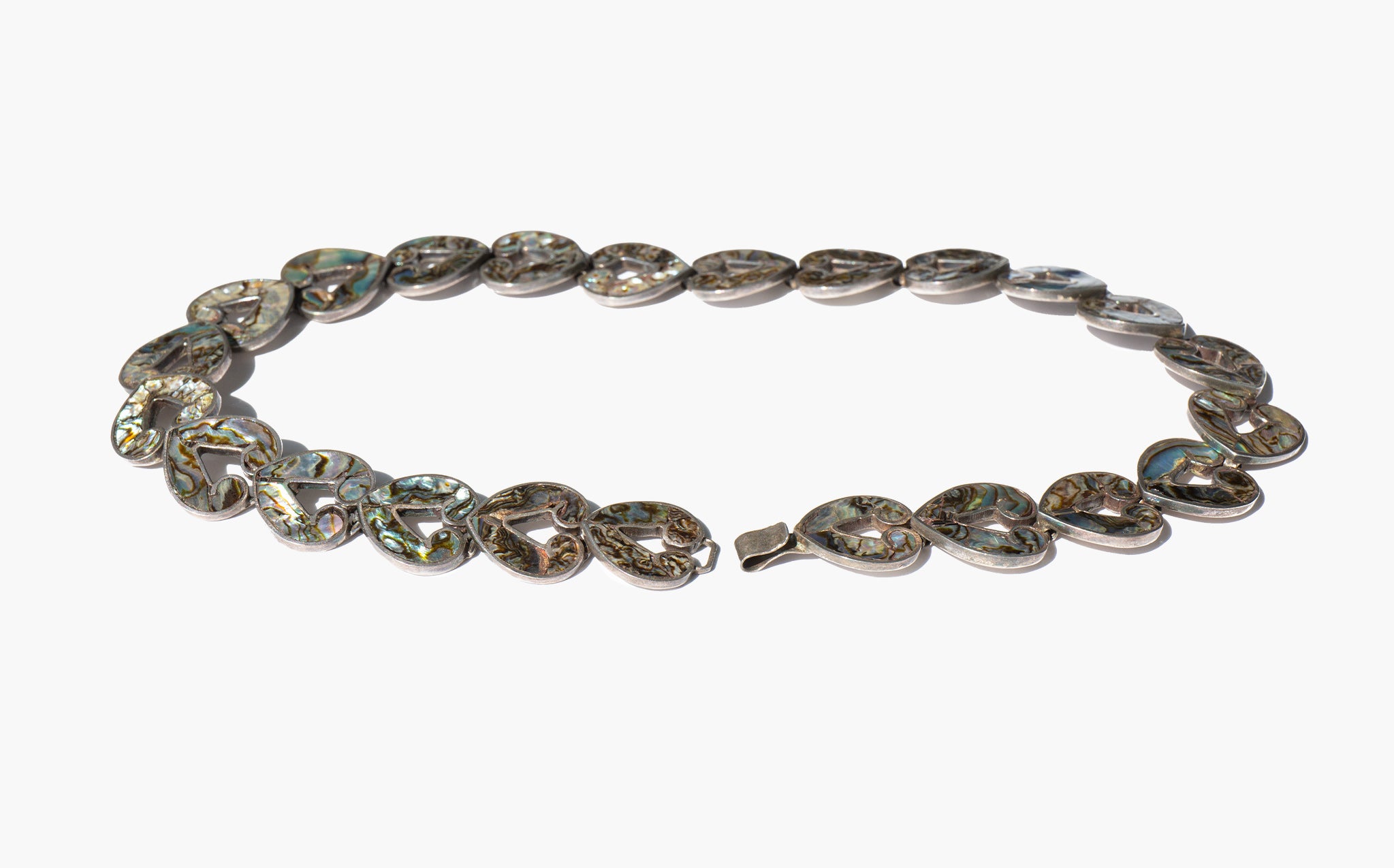 Striking and beautifully iridescent abalone and sterling silver collar. A sacred shell, abalone is said to heal the soul, relieve stress, and increase feelings of relaxation.