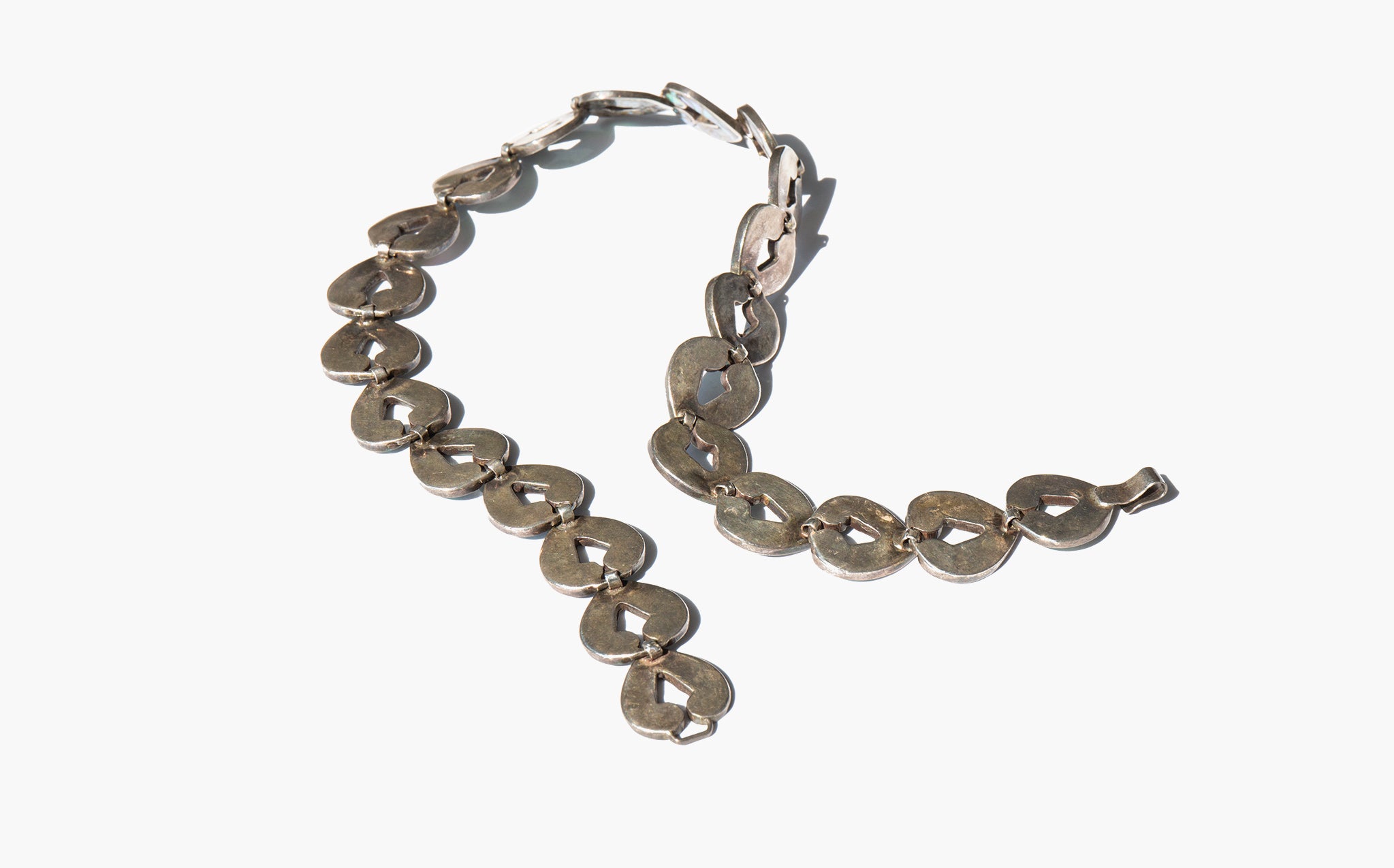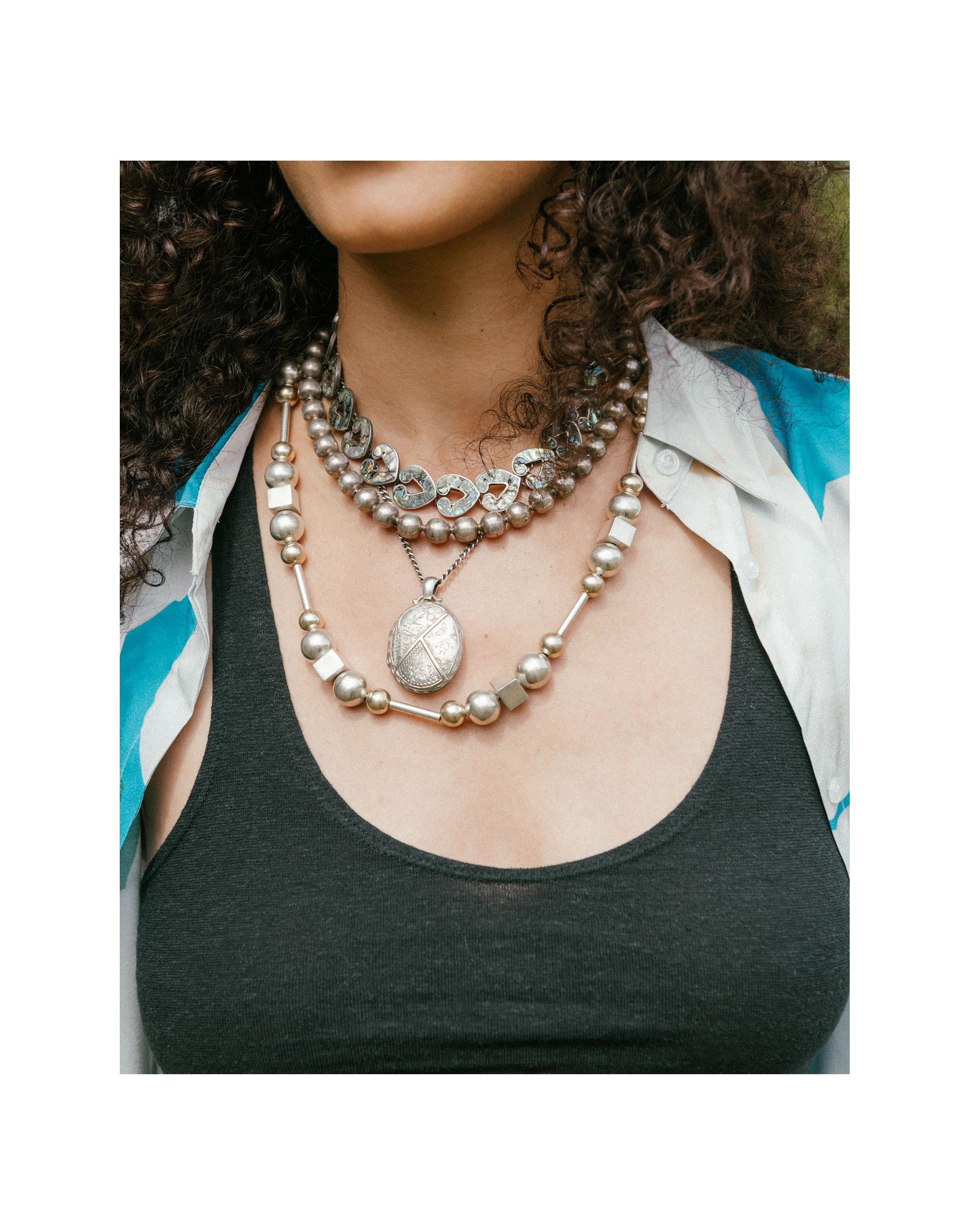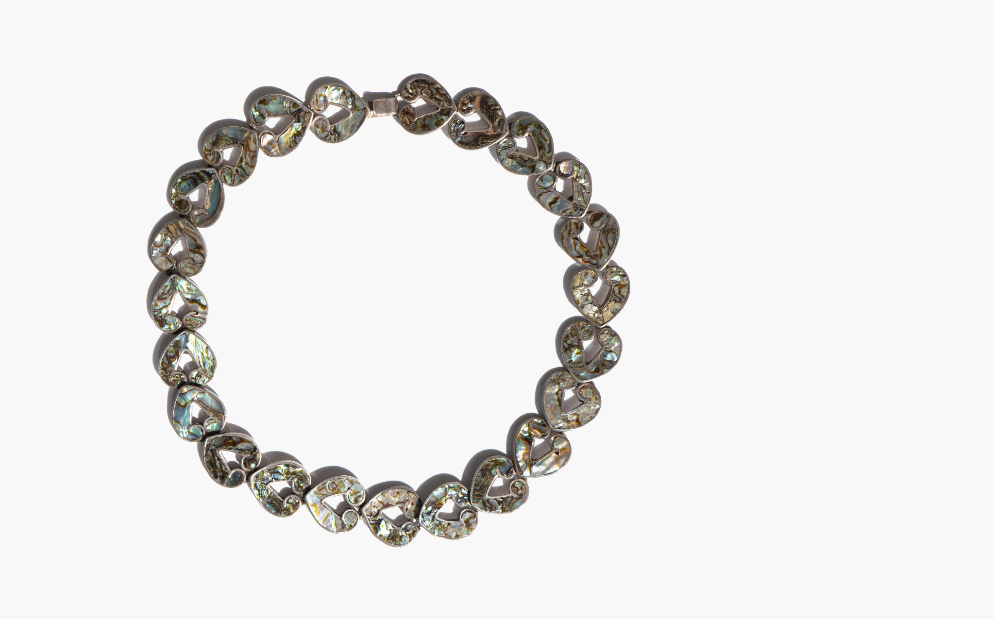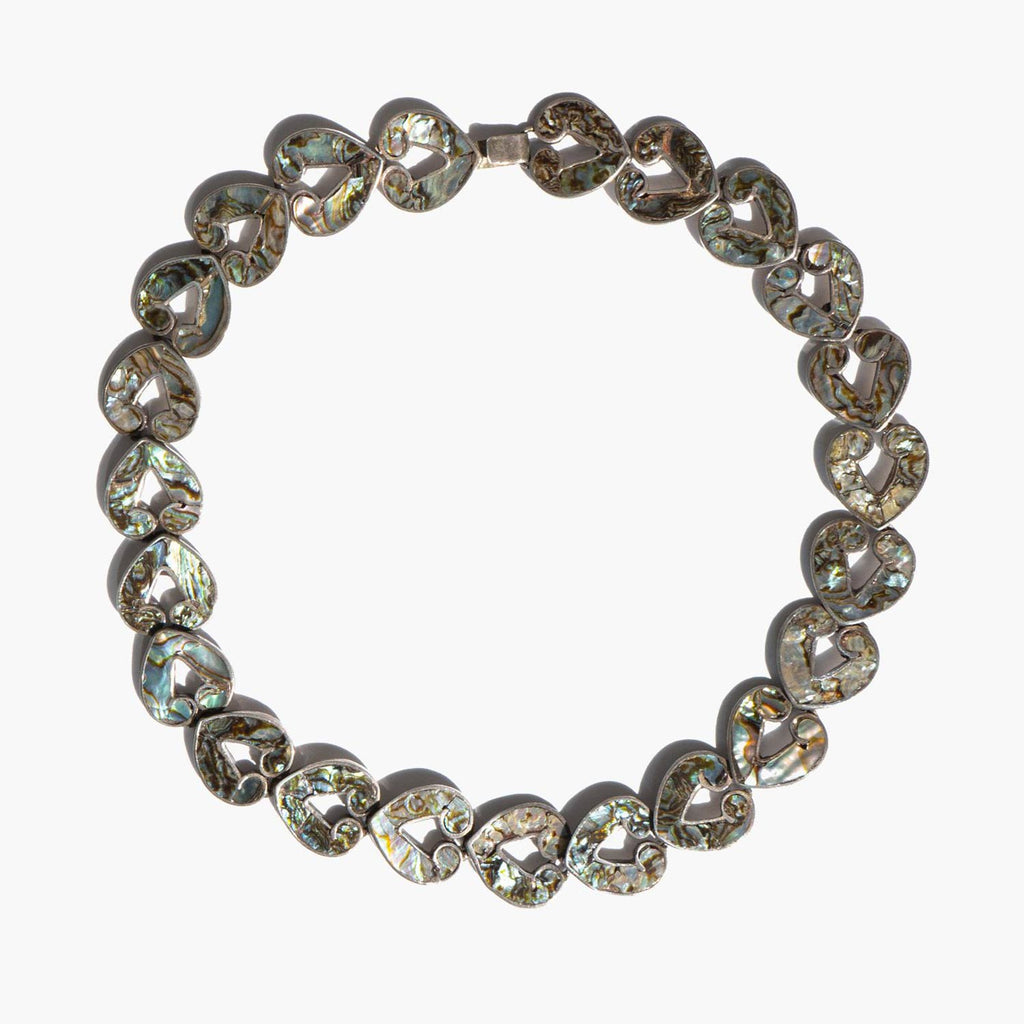 Striking and beautifully iridescent abalone and sterling silver collar. A sacred shell, abalone is said to heal the soul, relieve stress, and increase feelings of relaxation.