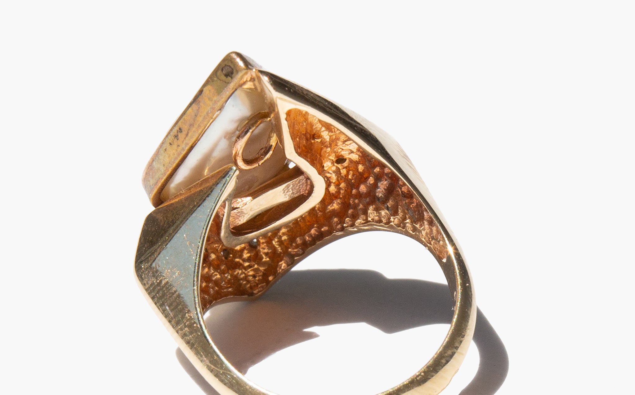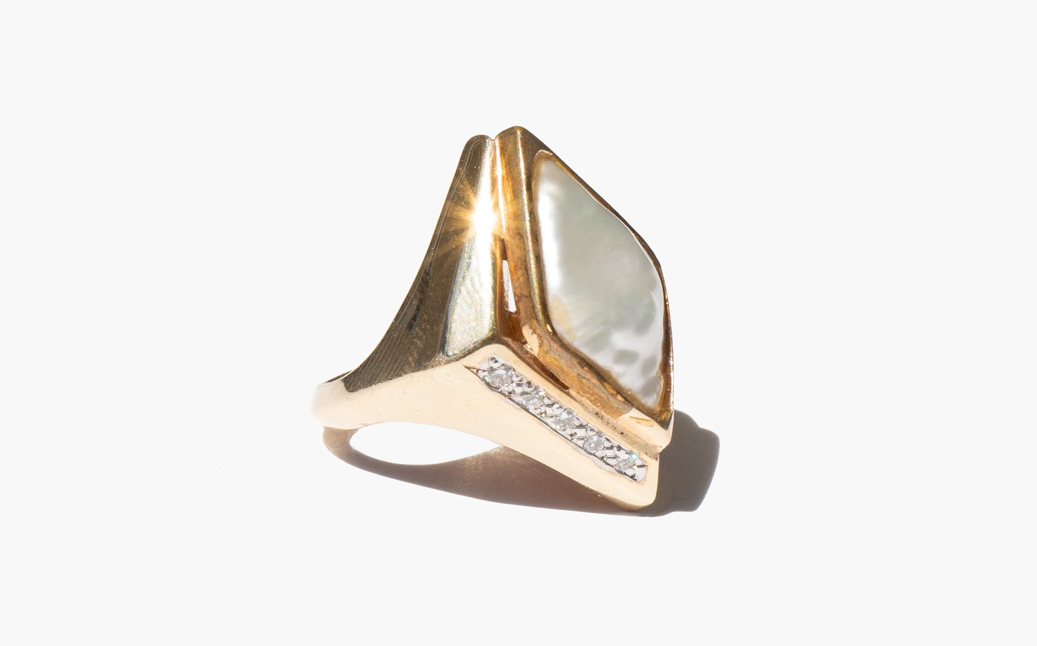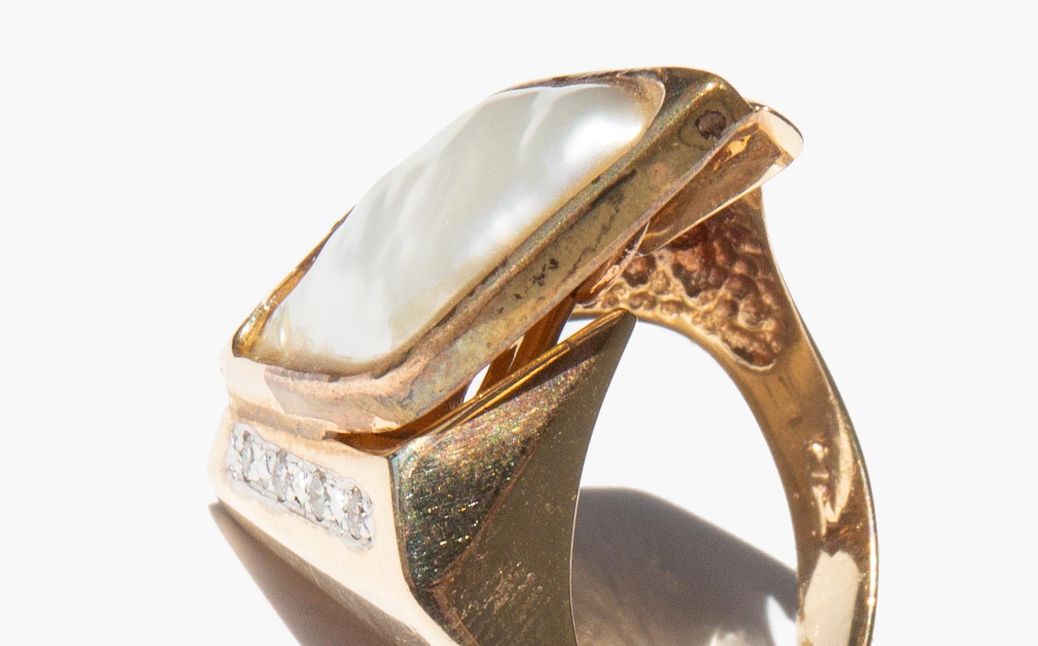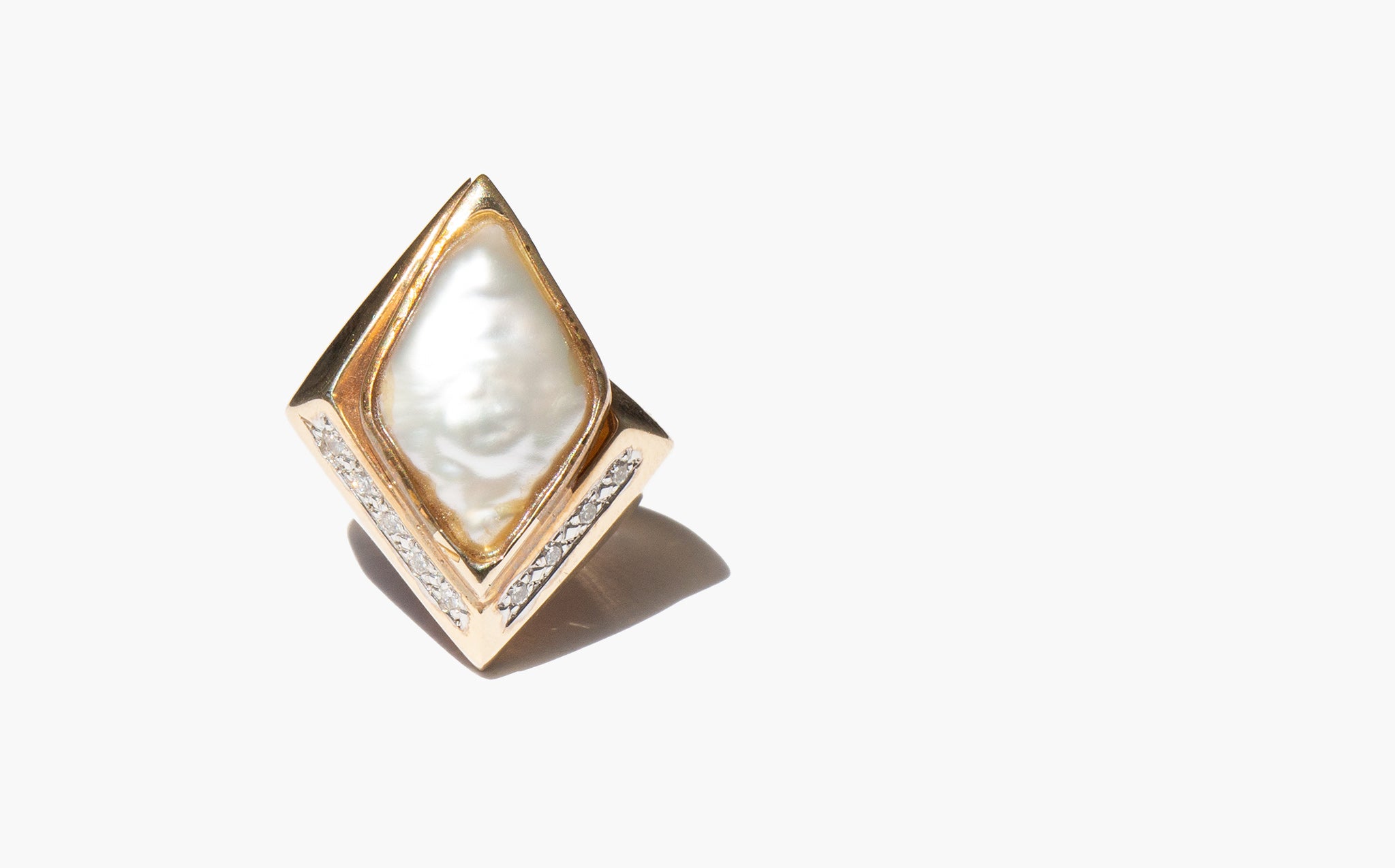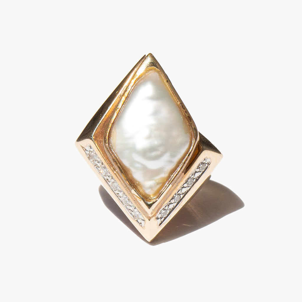 Large and beautiful 14k gold setting with a freshwater pearl nestled in diamonds.