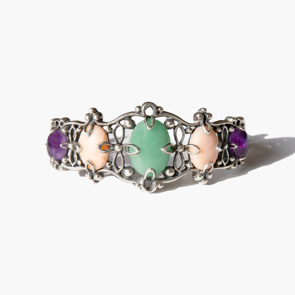 Ornate sterling silver floral cuff bracelet accented with large stones of jade, coral, and amethyst. A magical trio, jade is said to dispel negative energy, amethyst offers protection against evil, and coral is known to guard against curses and the destructive forces of the Evil Eye.