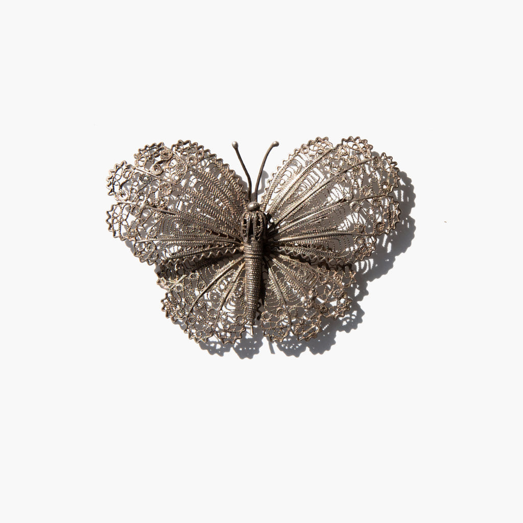 Ornate antique filigree sterling silver butterfly. Exceptionally beautiful and graceful, butterflies can also represent rebirth, transformation and change. Tohono O'odham legend holds that butterflies were made by the world's creator when it gathered colors from all around the land into a sack and shook them up – orange and yellow sunlight, green leaves, blue sky, white cornmeal, and the blackness of a beautiful girl's hair were released into the air as thousands of brilliantly colored butterflies.