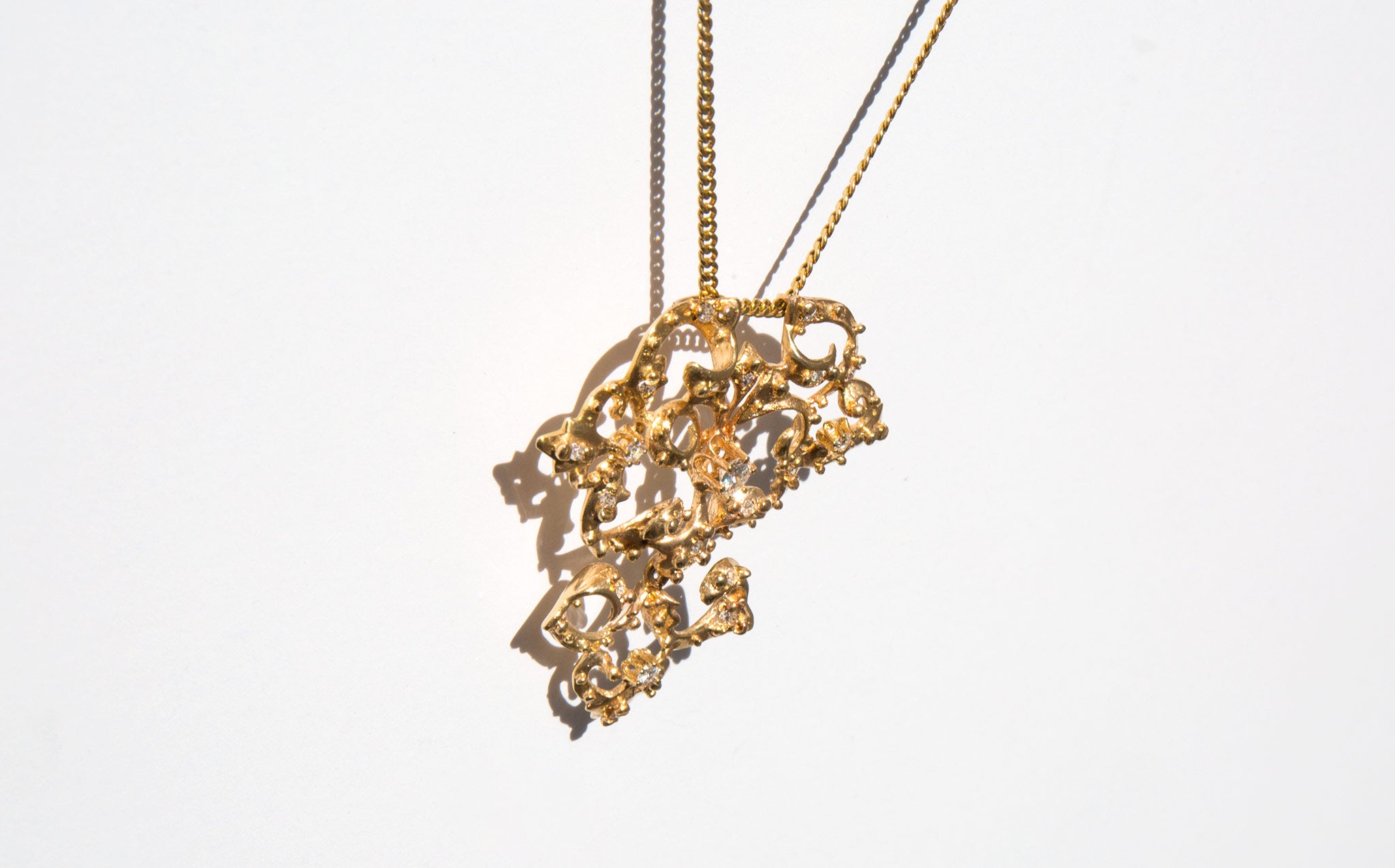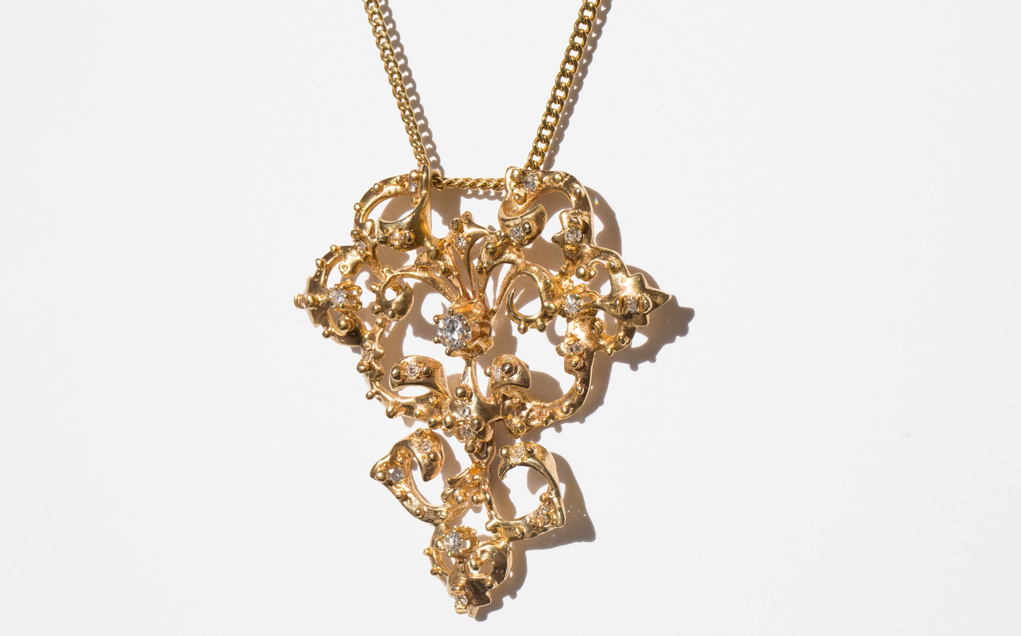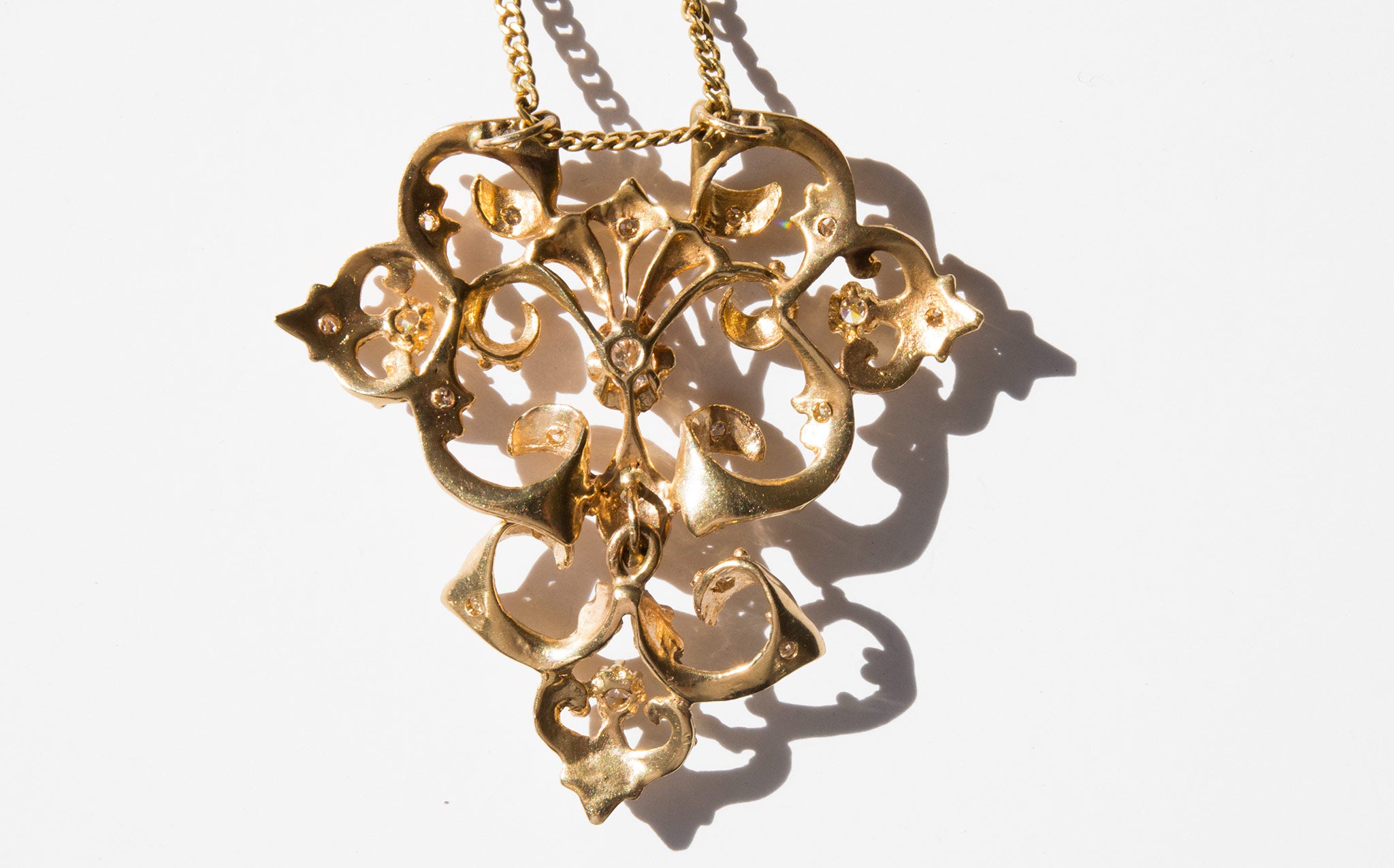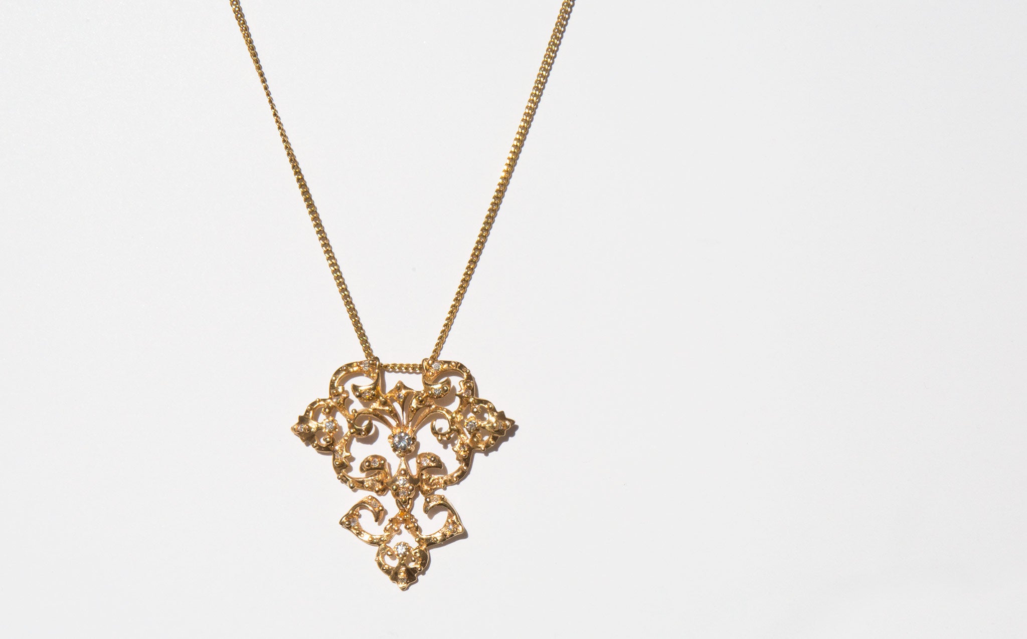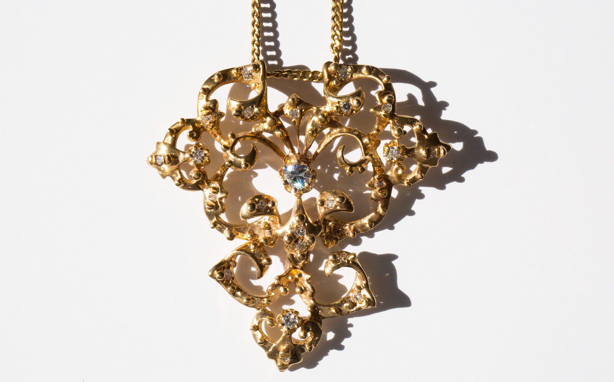 Glittering Baroque style necklace of solid 14k gold with diamond accents.