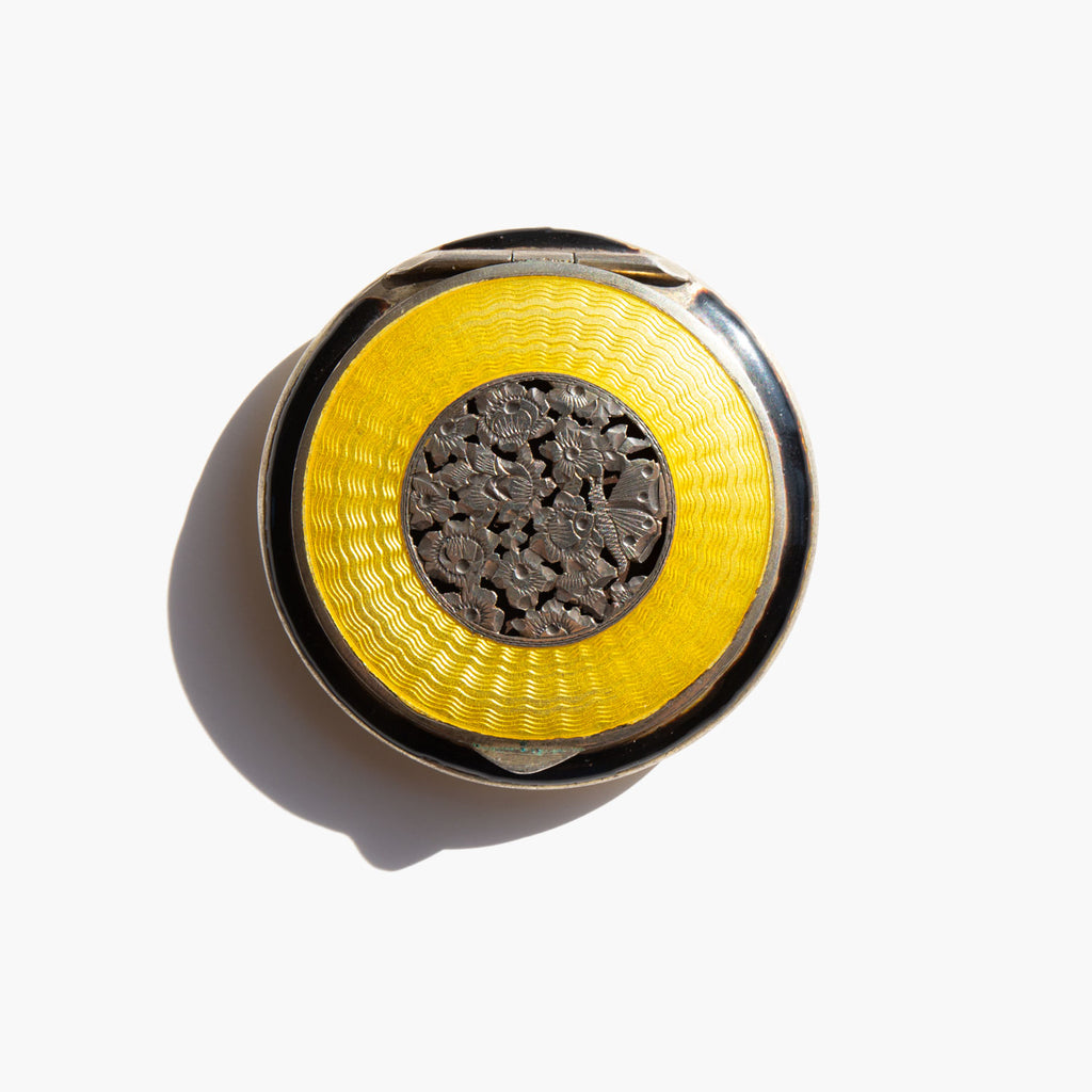 Antique Austrian sterling silver vanity compact with guilloché enameling in a bright sunburst yellow.