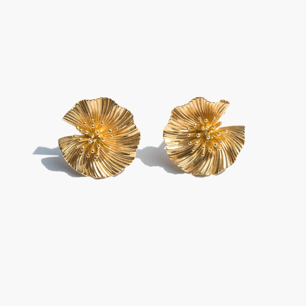 Solid 14k gold water lily stud earrings. Water lilies symbolize resurrection because of the way they close their flowers at night and reopen and blossom again in the morning in response to the sunrise. Buddhists also associate the water lily with enlightenment because of the way the magnificent bloom emerges from the unsightly muddy waters.