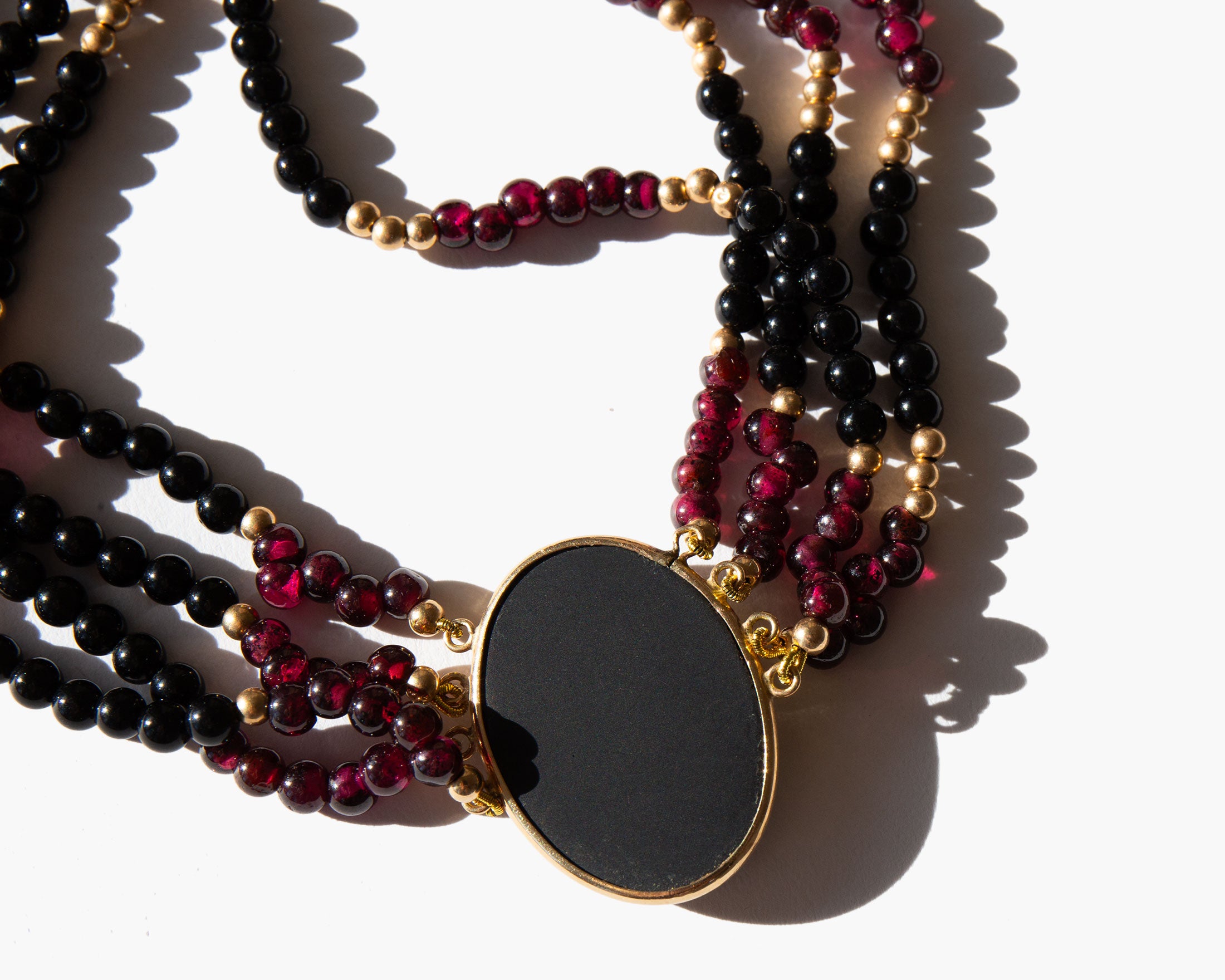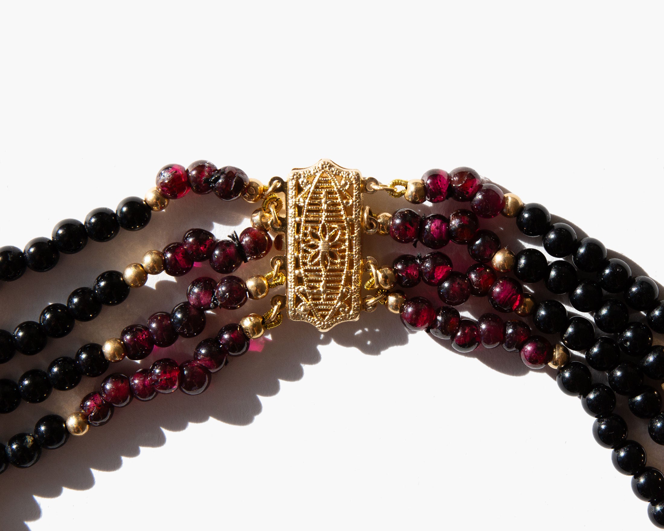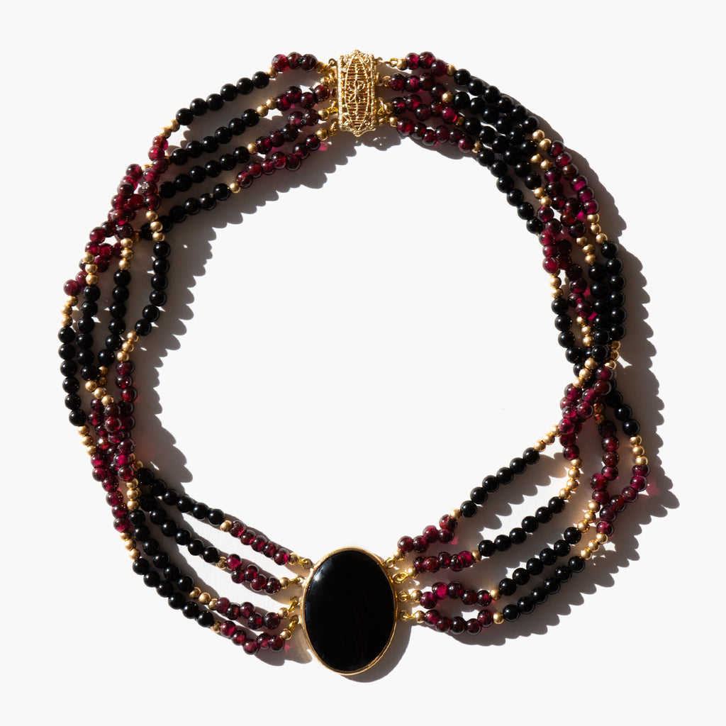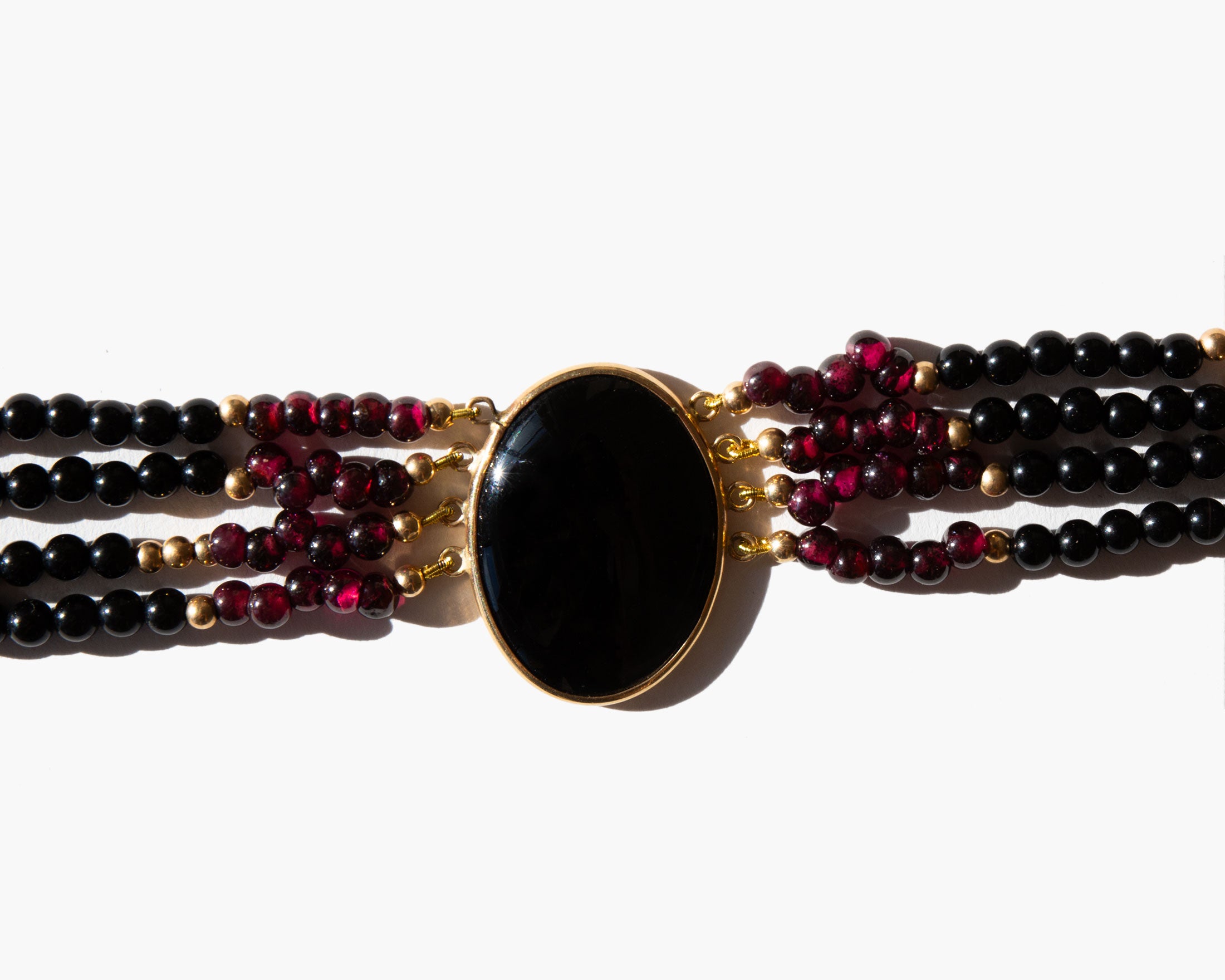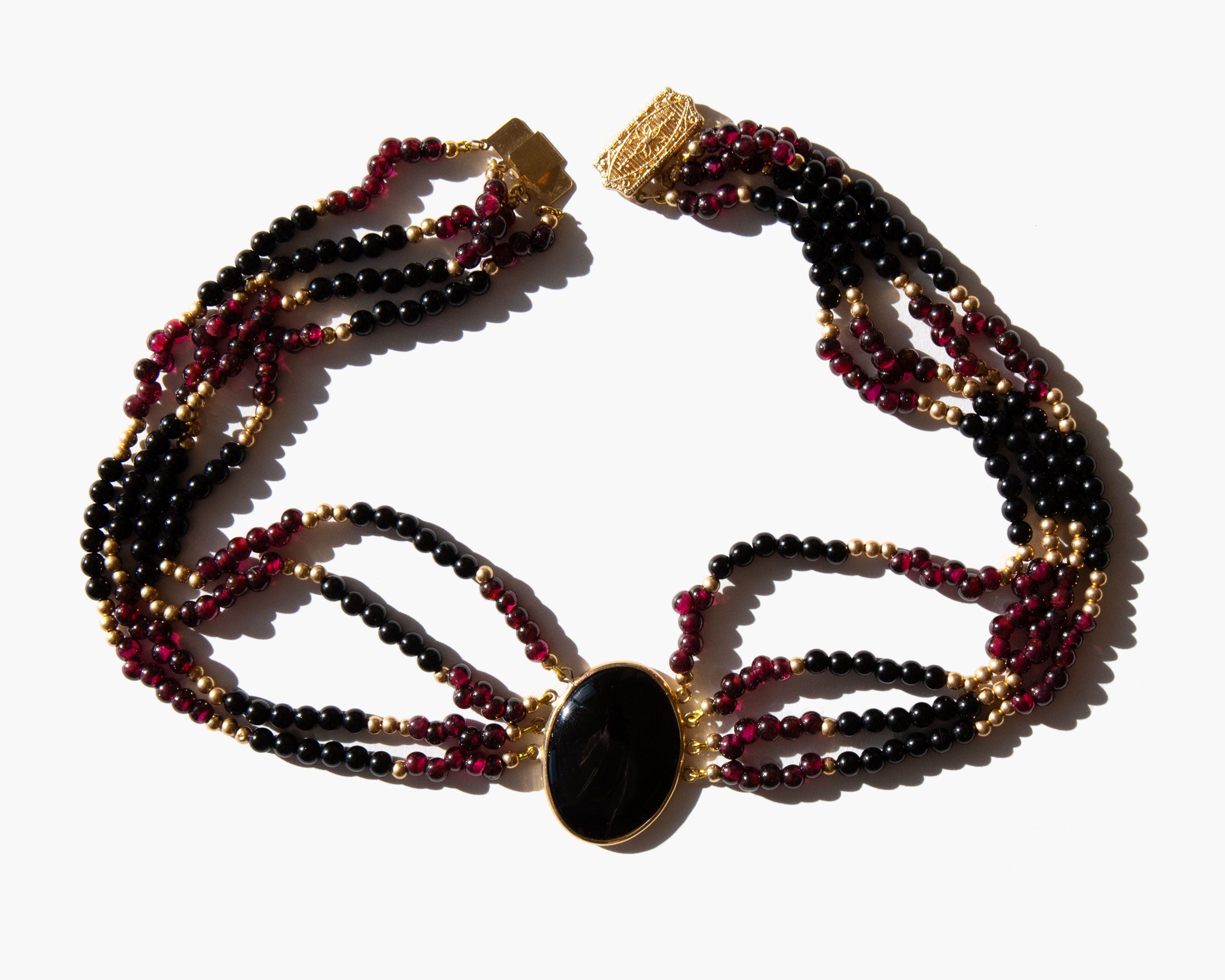 Garnet, black onyx, and 14k gold statement choker necklace.