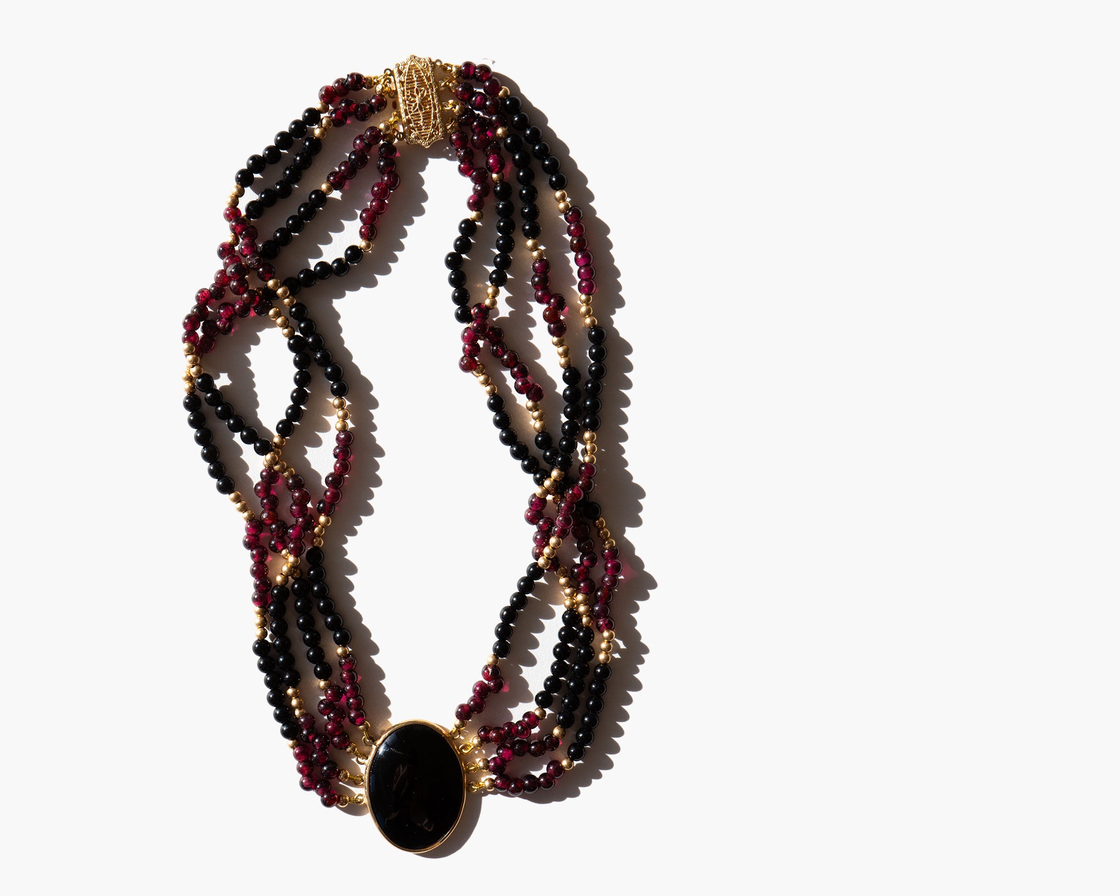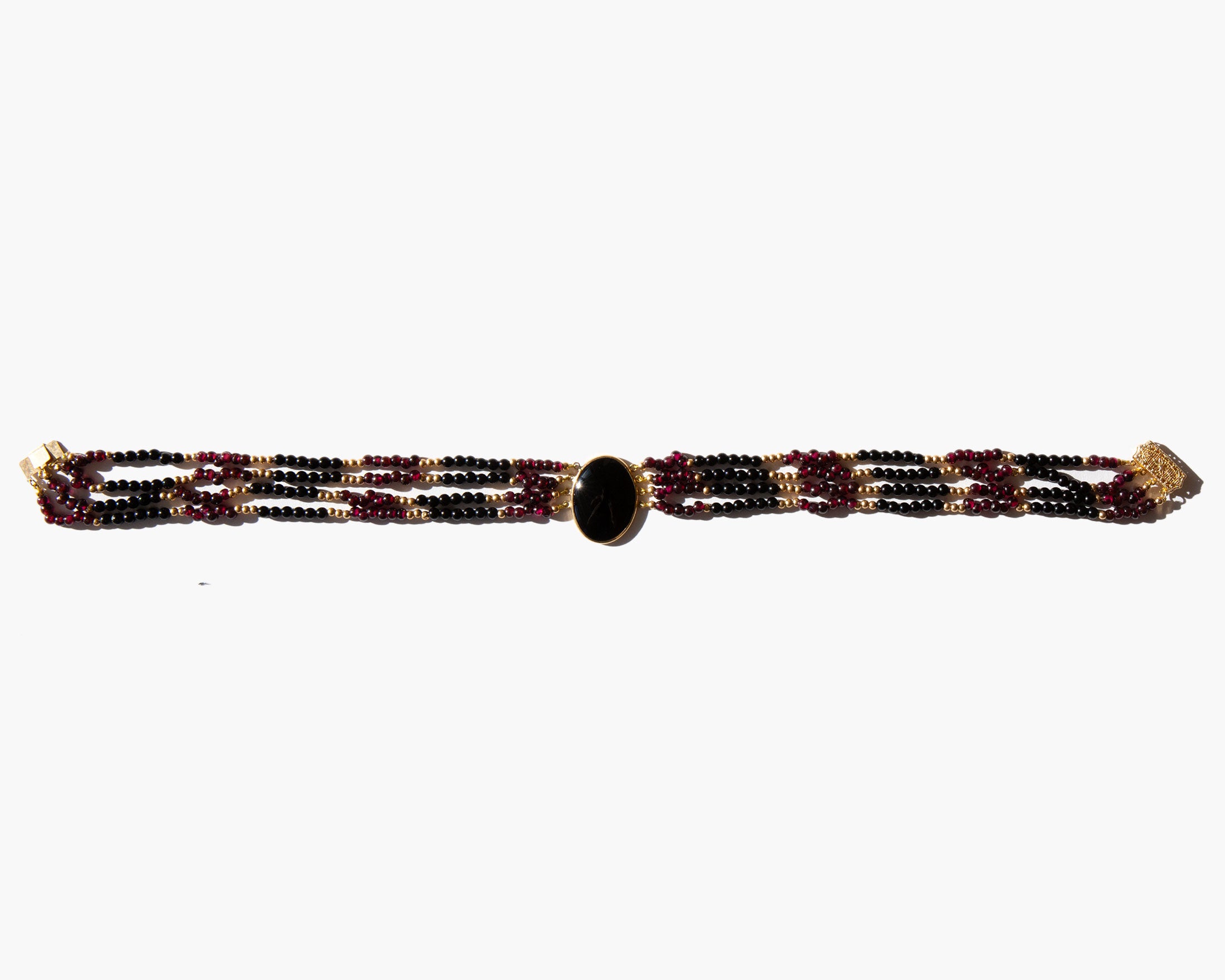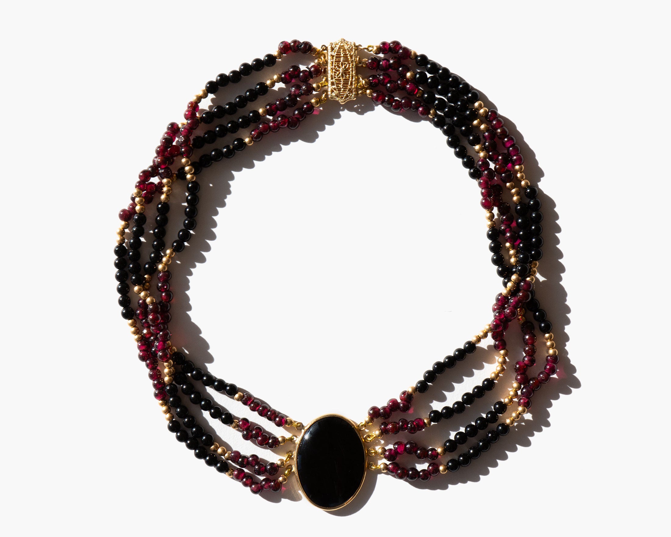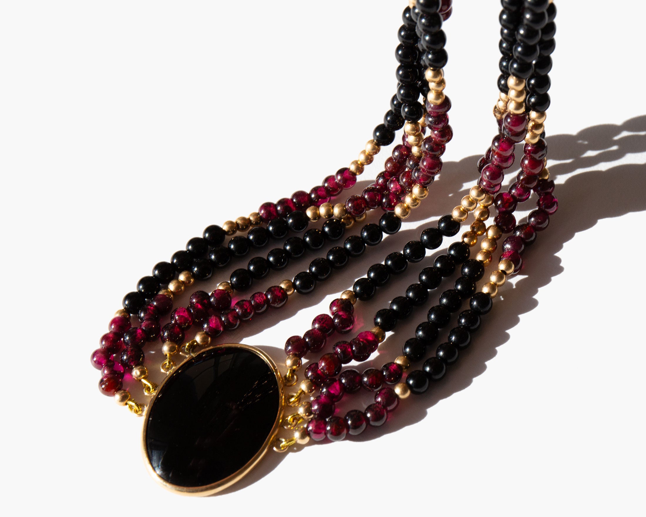 Garnet, black onyx, and 14k gold statement choker necklace.