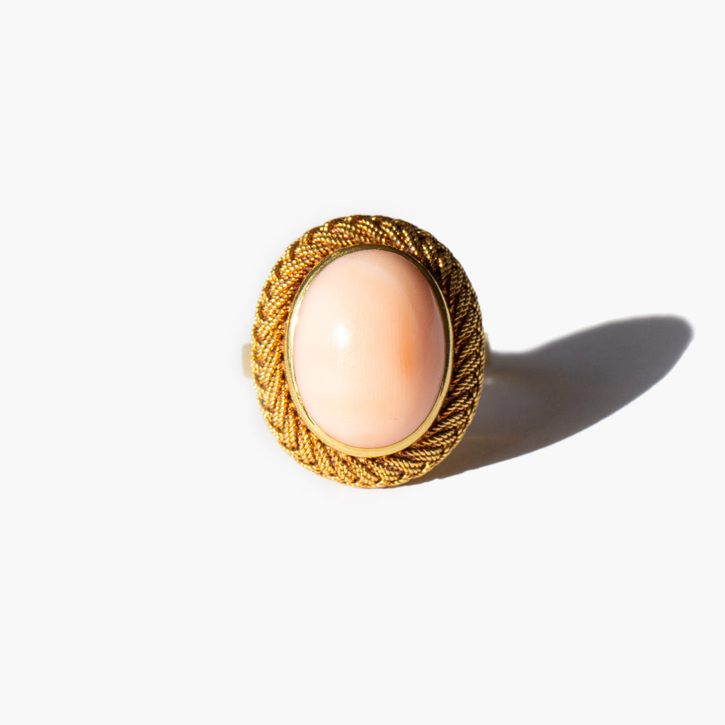 1970's Italian 18k woven gold ring with a large cloud pink coral center stone. Legend has it that coral is pink because when Perseus, mounted on Pegasus with the newly slain Medusa's head in a sack, flew over Andromeda chained to a cliff by a sea monster, he alighted to save the unfortunate nymph and laid Medusa's head on some seaweed at the water's edge. The blood seeped into the seaweed, turning it to stone and in the process dying the rocks their pale pink hue.