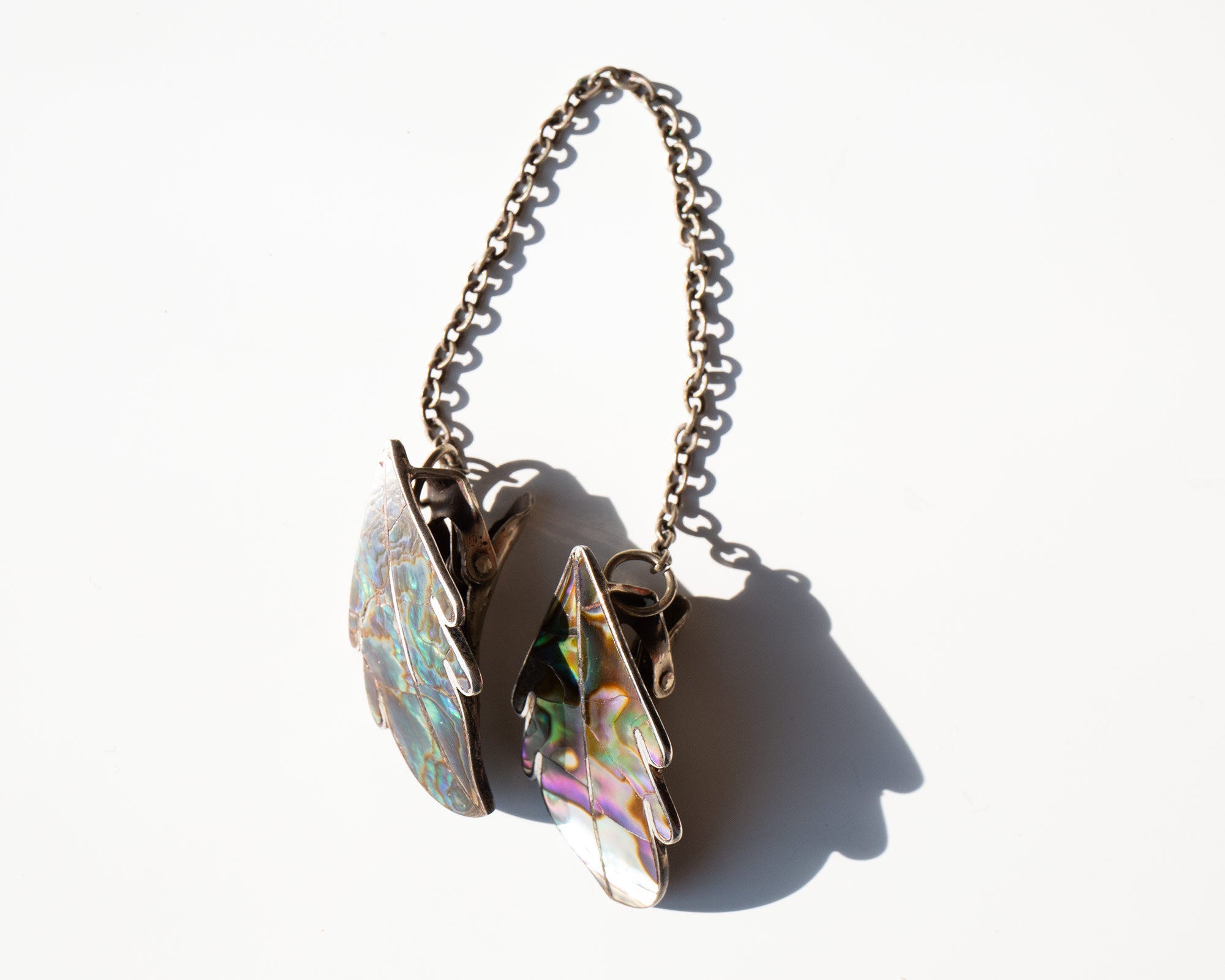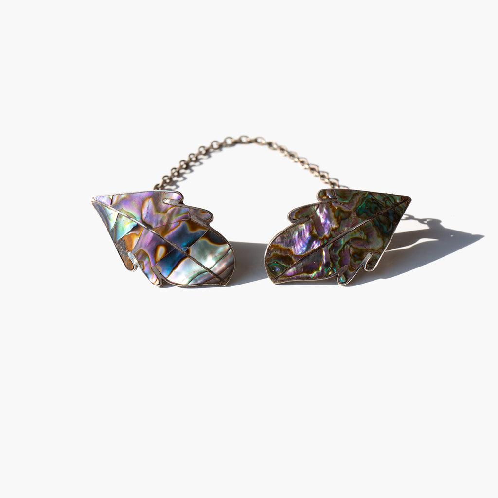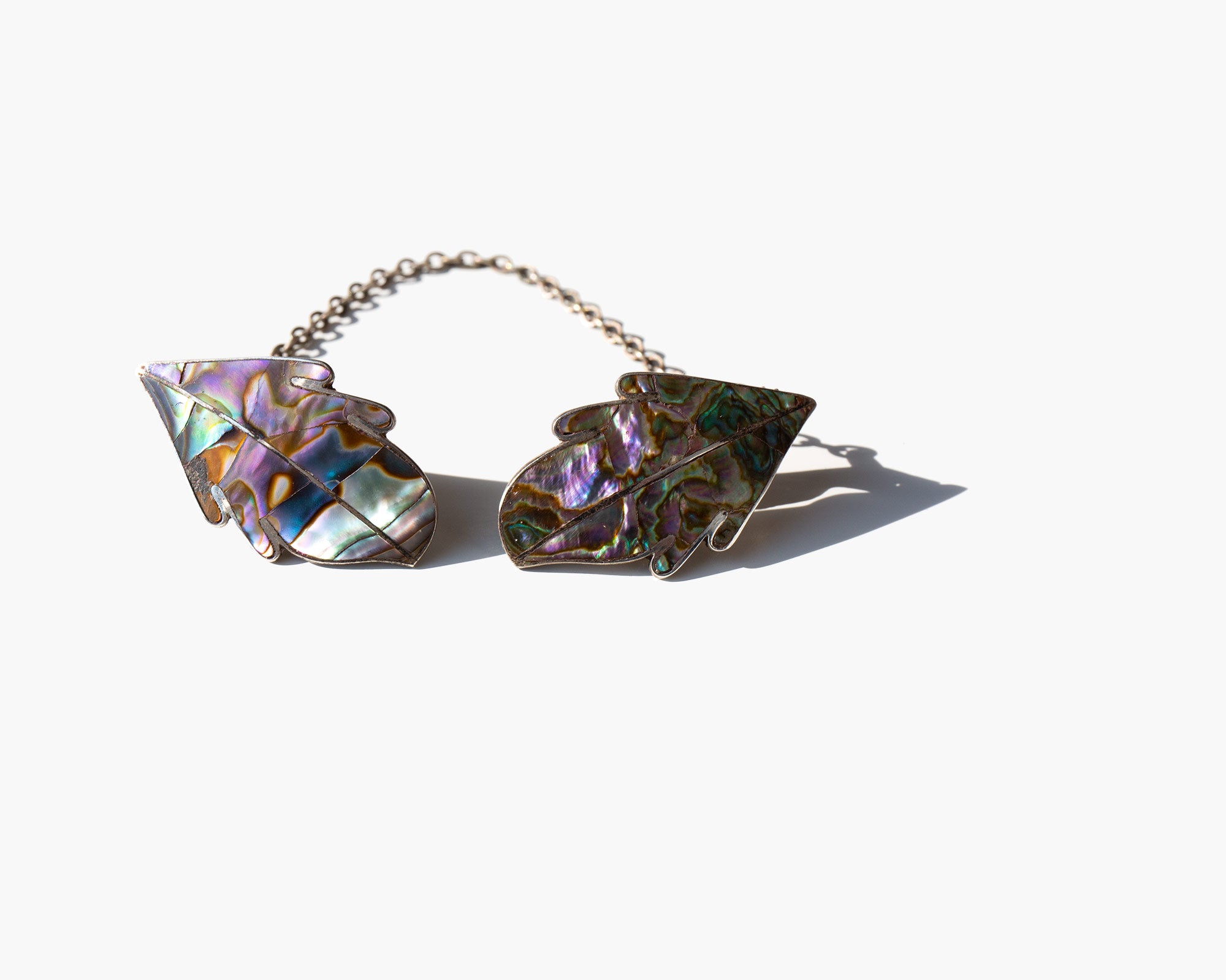 Antique Taxco abalone and sterling silver sweater clips, a perfect embellishment for shirt collars.