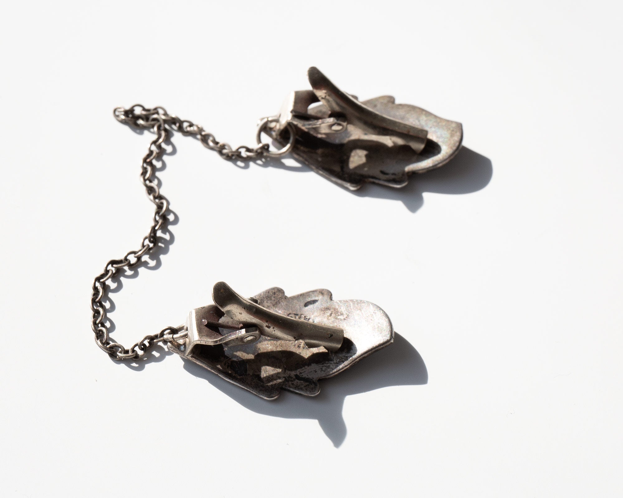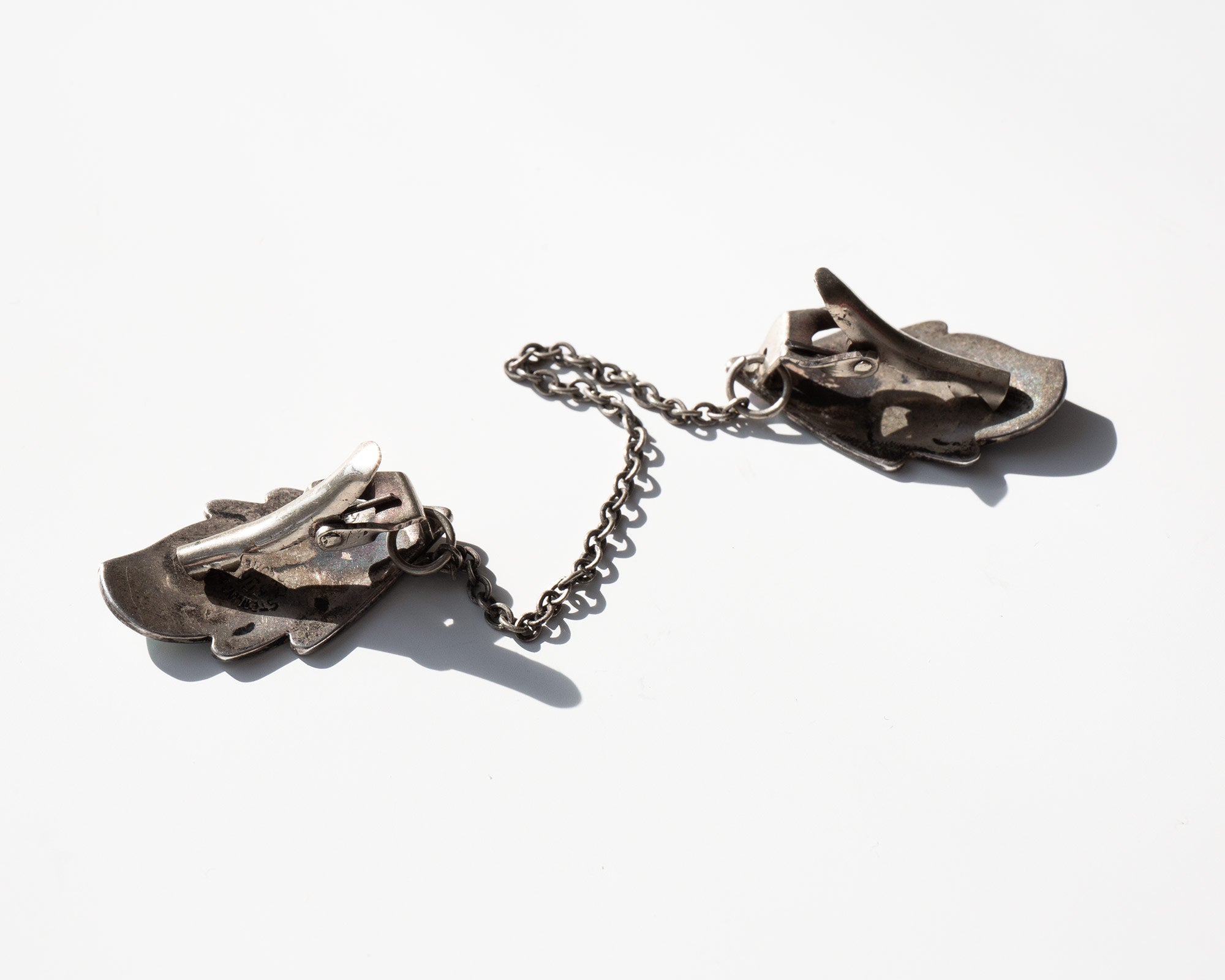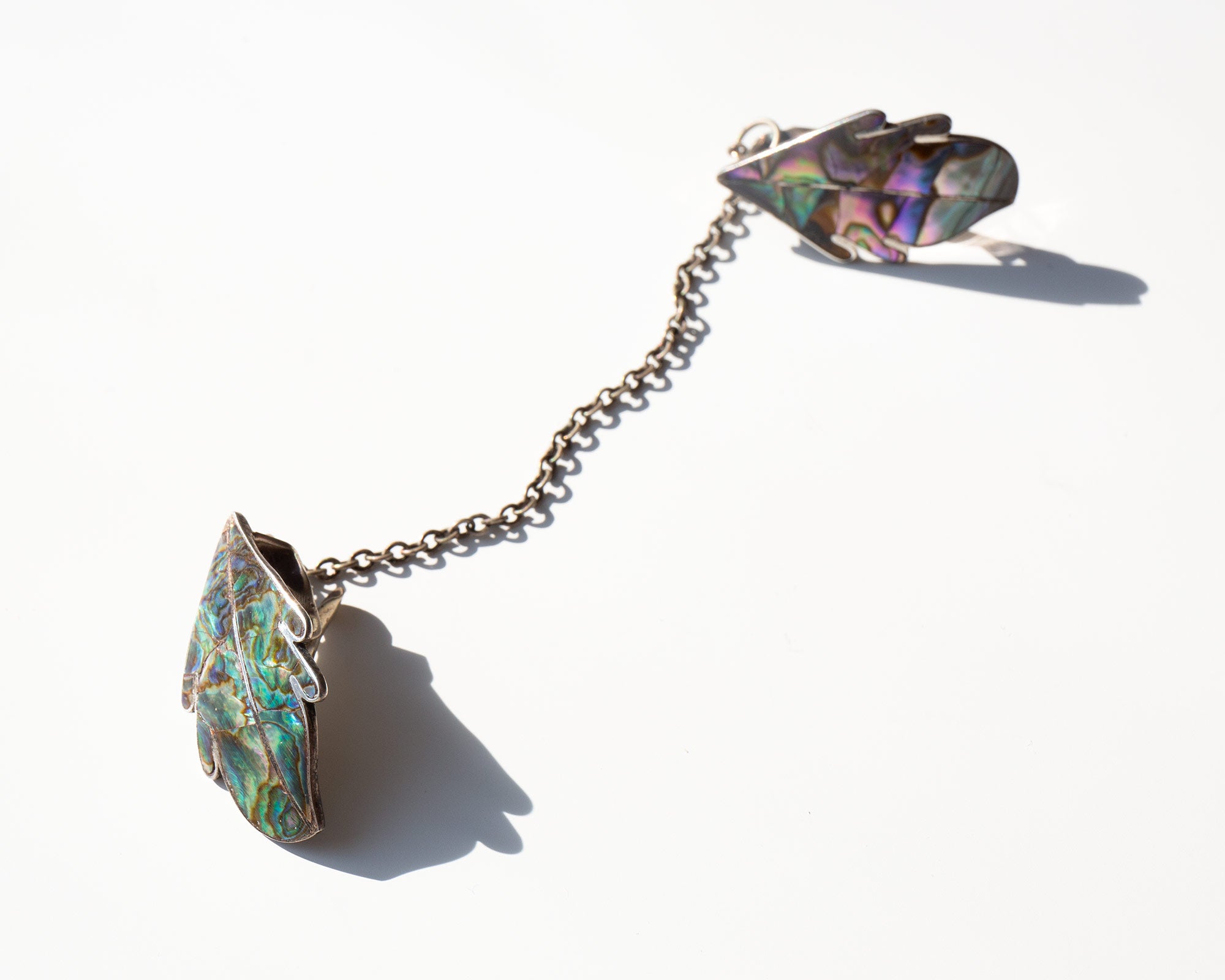 Antique Taxco abalone and sterling silver sweater clips, a perfect embellishment for shirt collars.