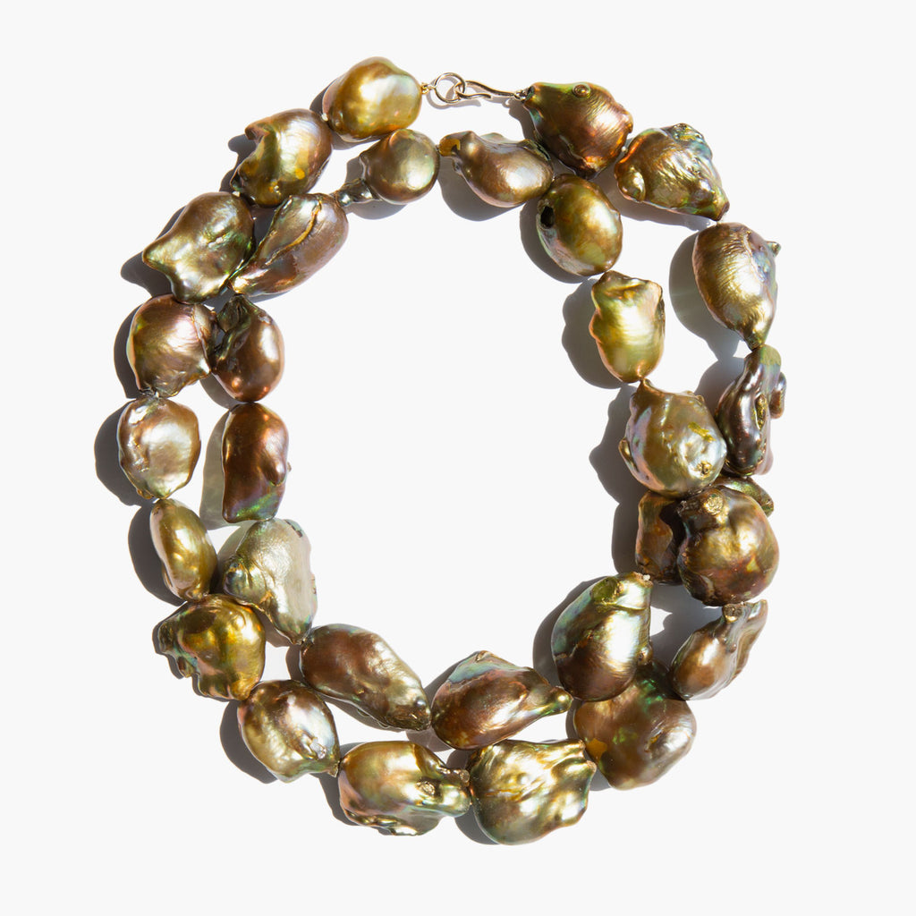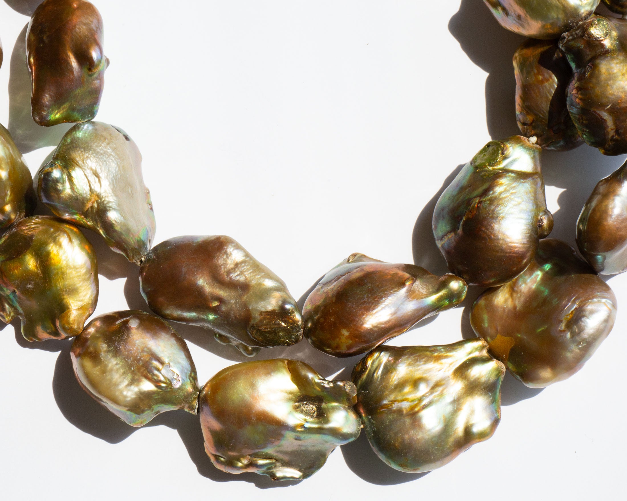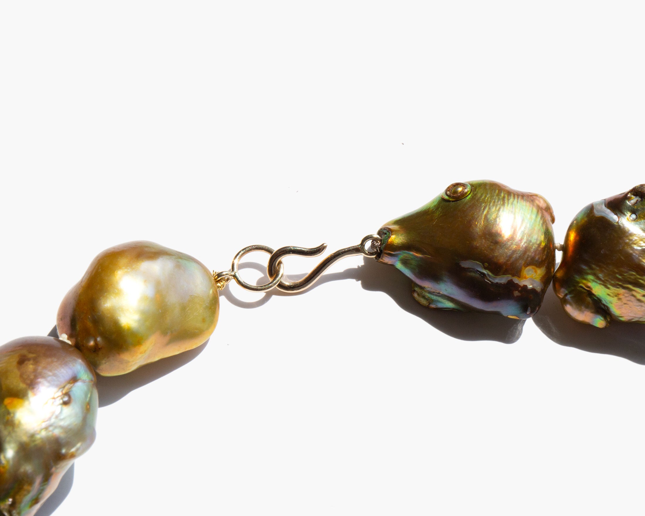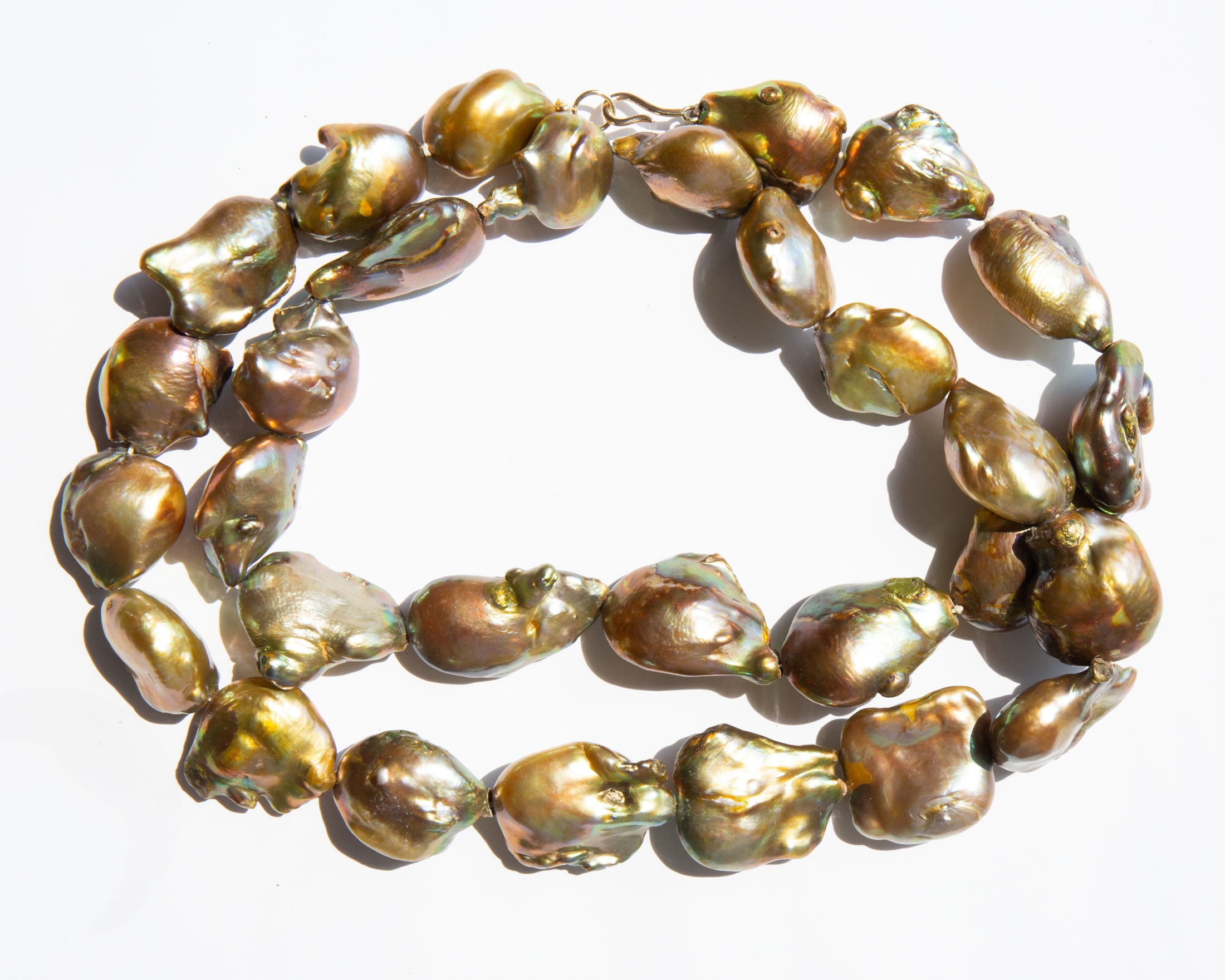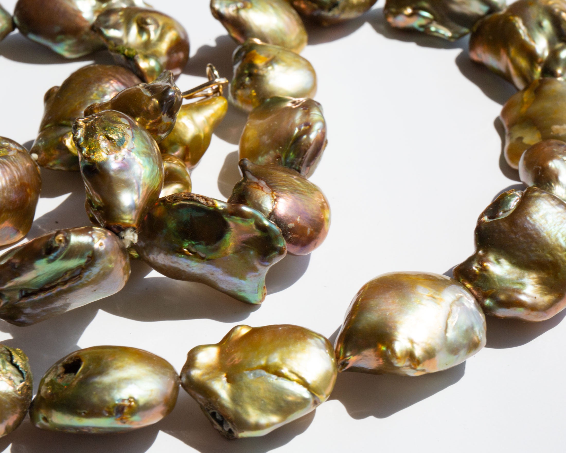 Ravishing string of iridescent baroque pearls with a handmade 14k gold clasp. String can be worn long and loose or double wrapped to make a statement choker.
