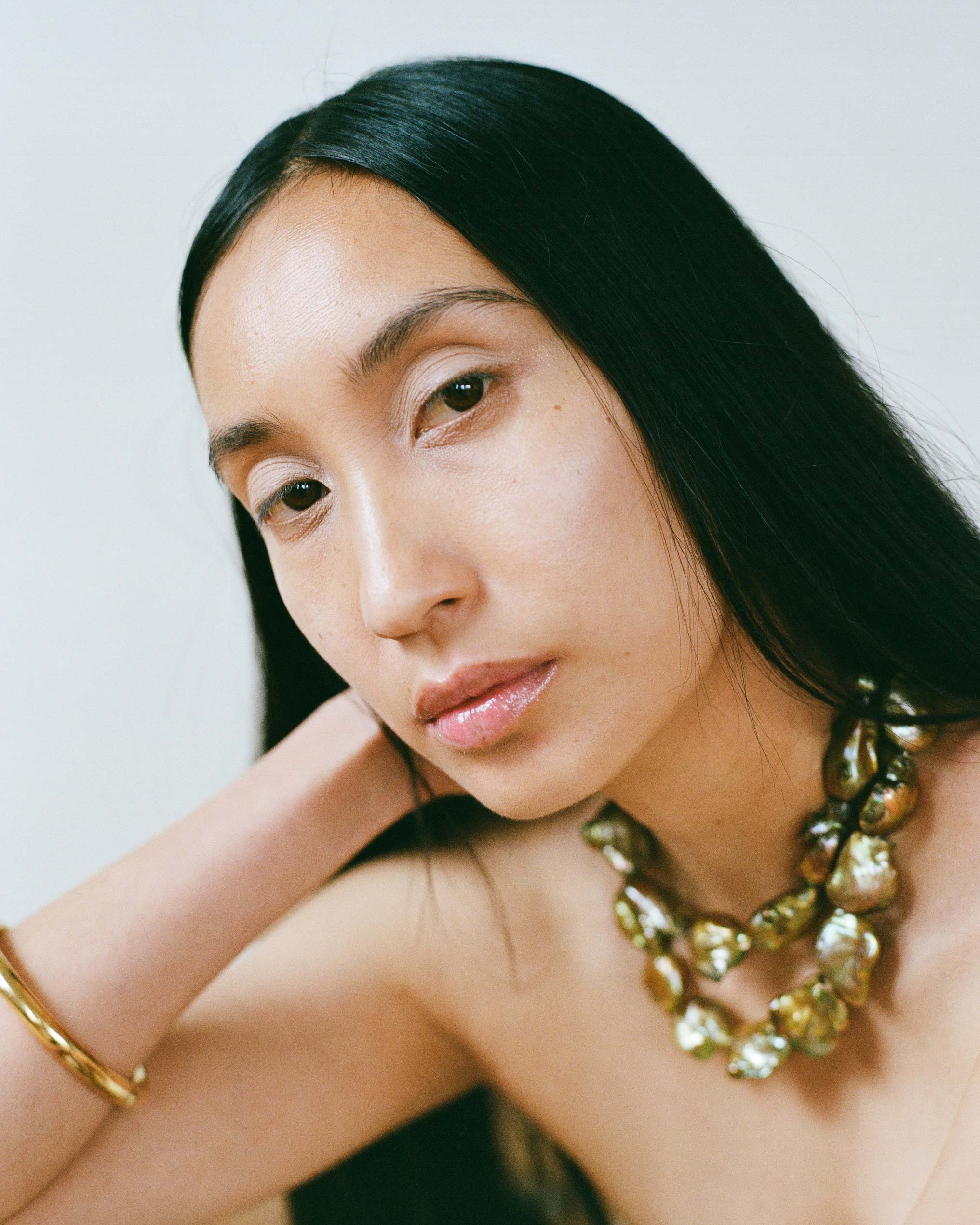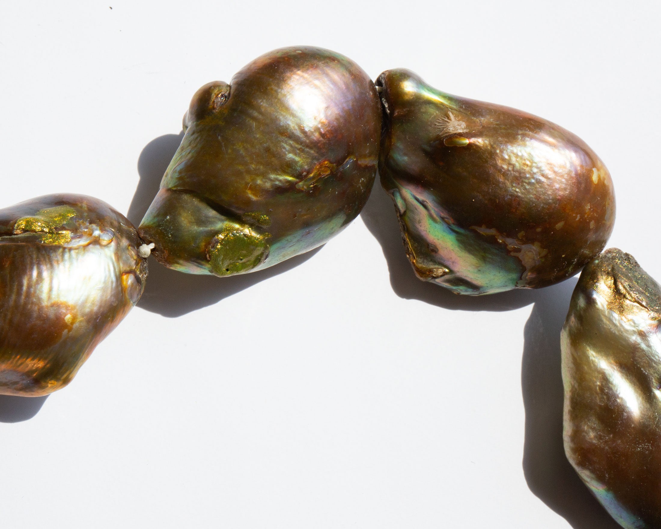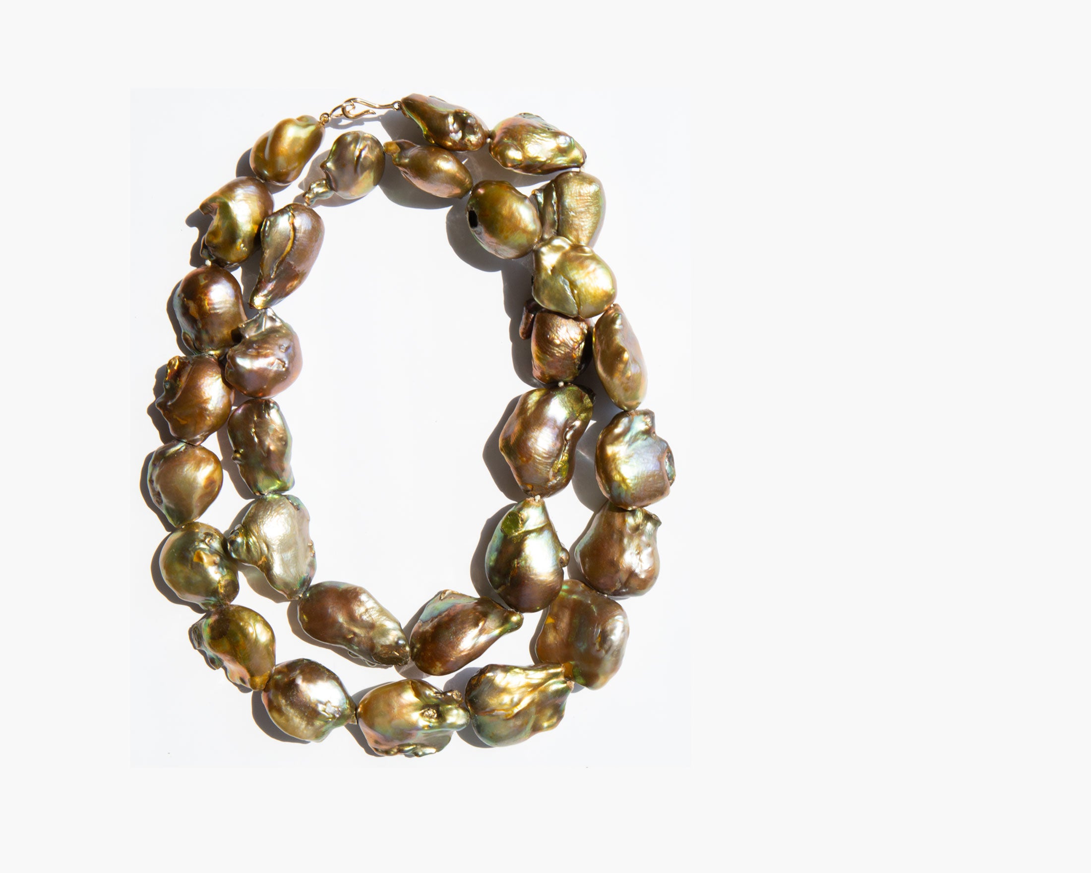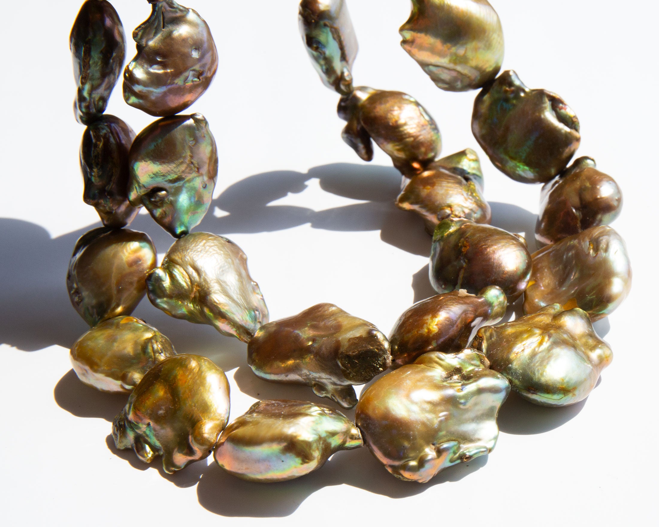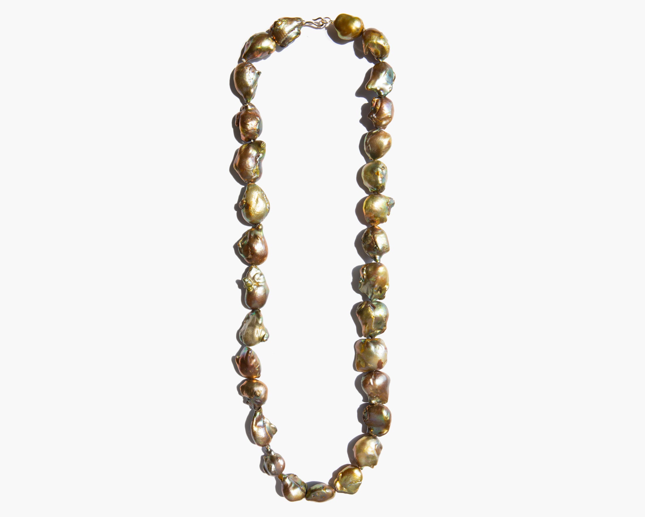 Ravishing string of iridescent baroque pearls with a handmade 14k gold clasp. String can be worn long and loose or double wrapped to make a statement choker.