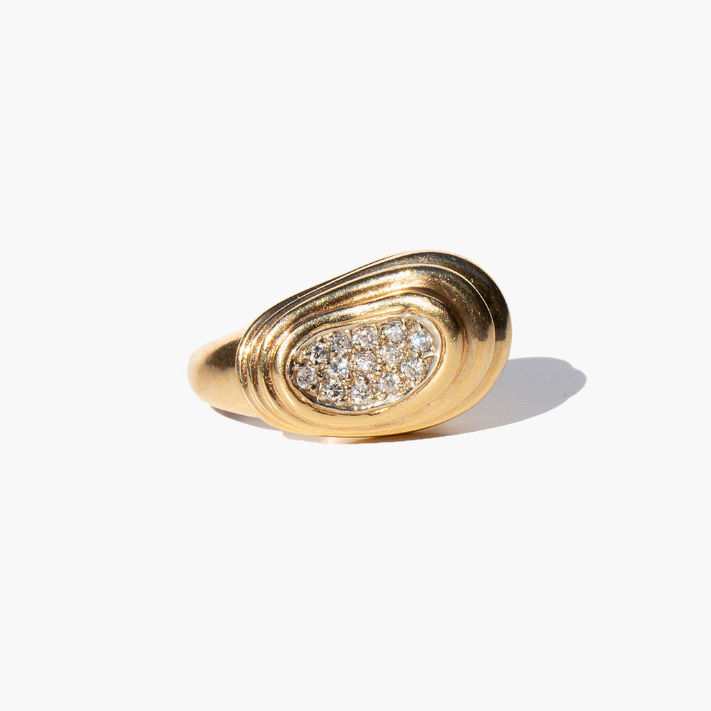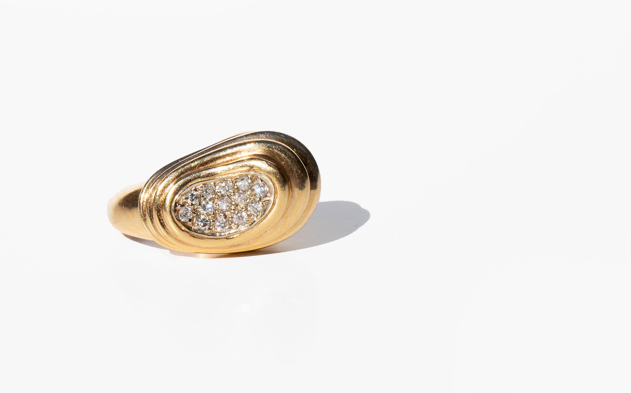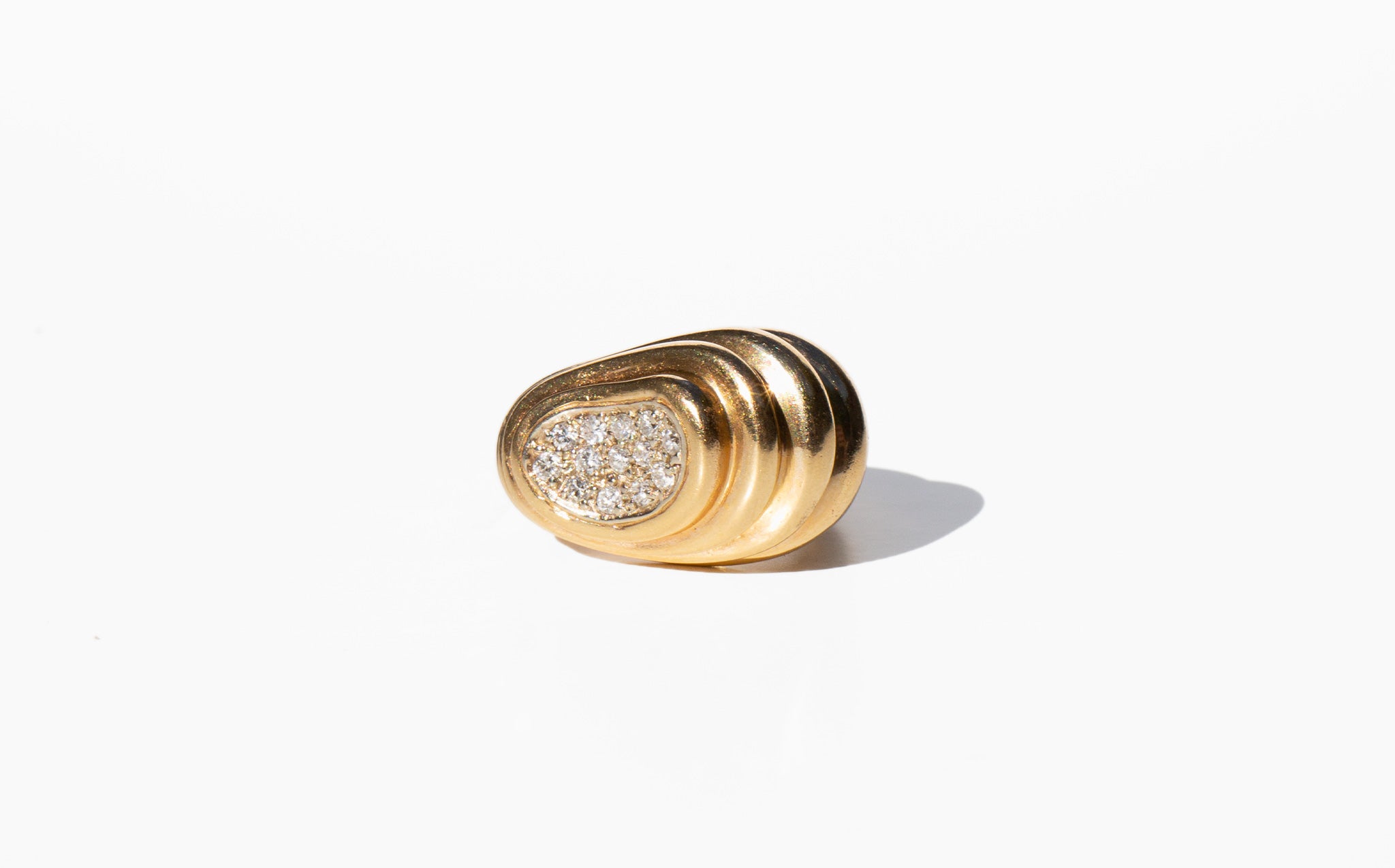 A grand 14k gold and diamond ring with an organic, sculptural shape.
