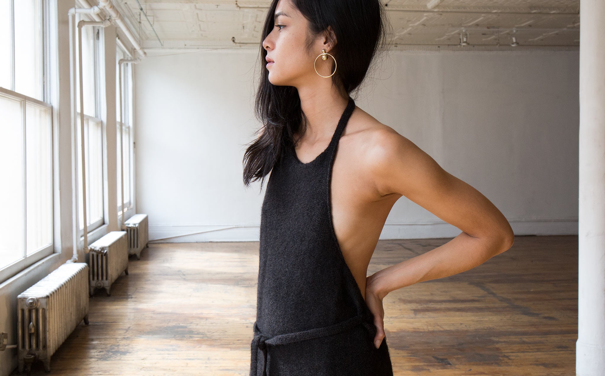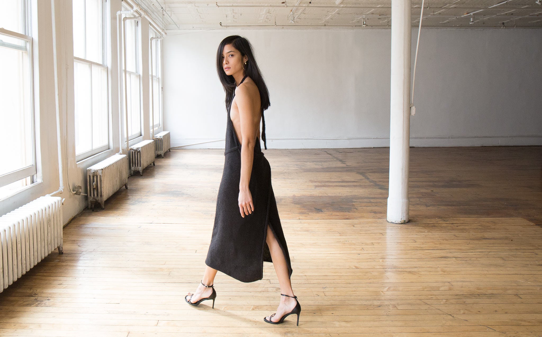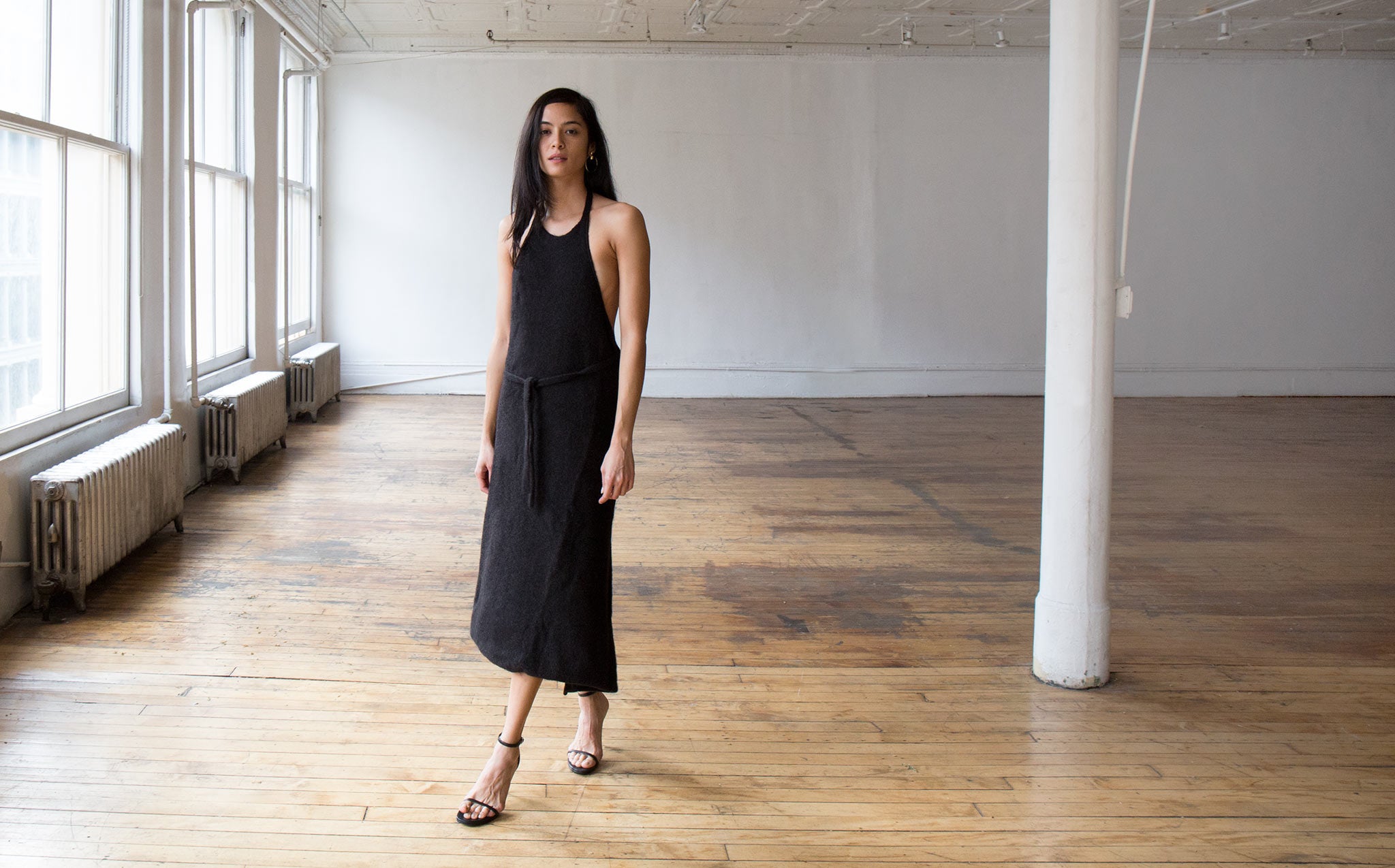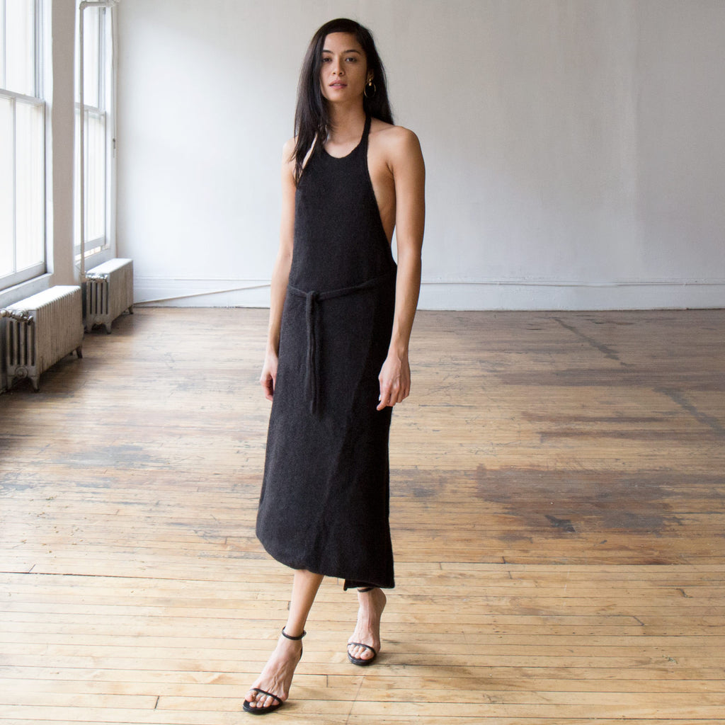 Black melange sweater dress is 33% yack wool, 33% silk, and 33% mohair.